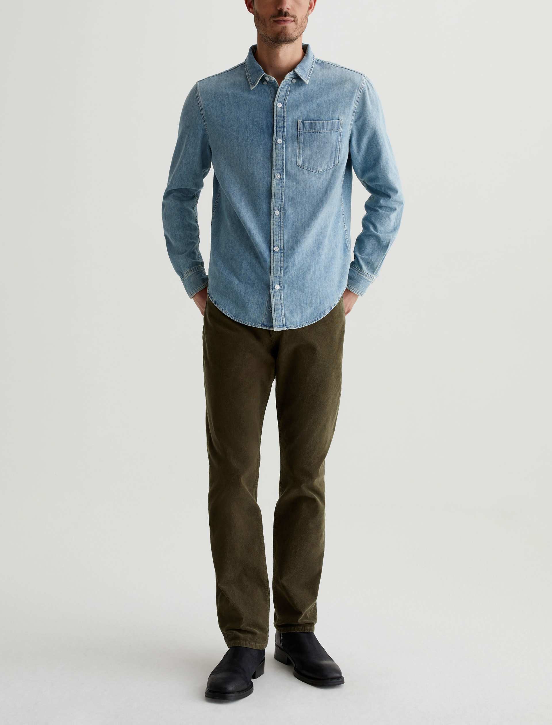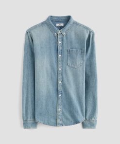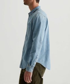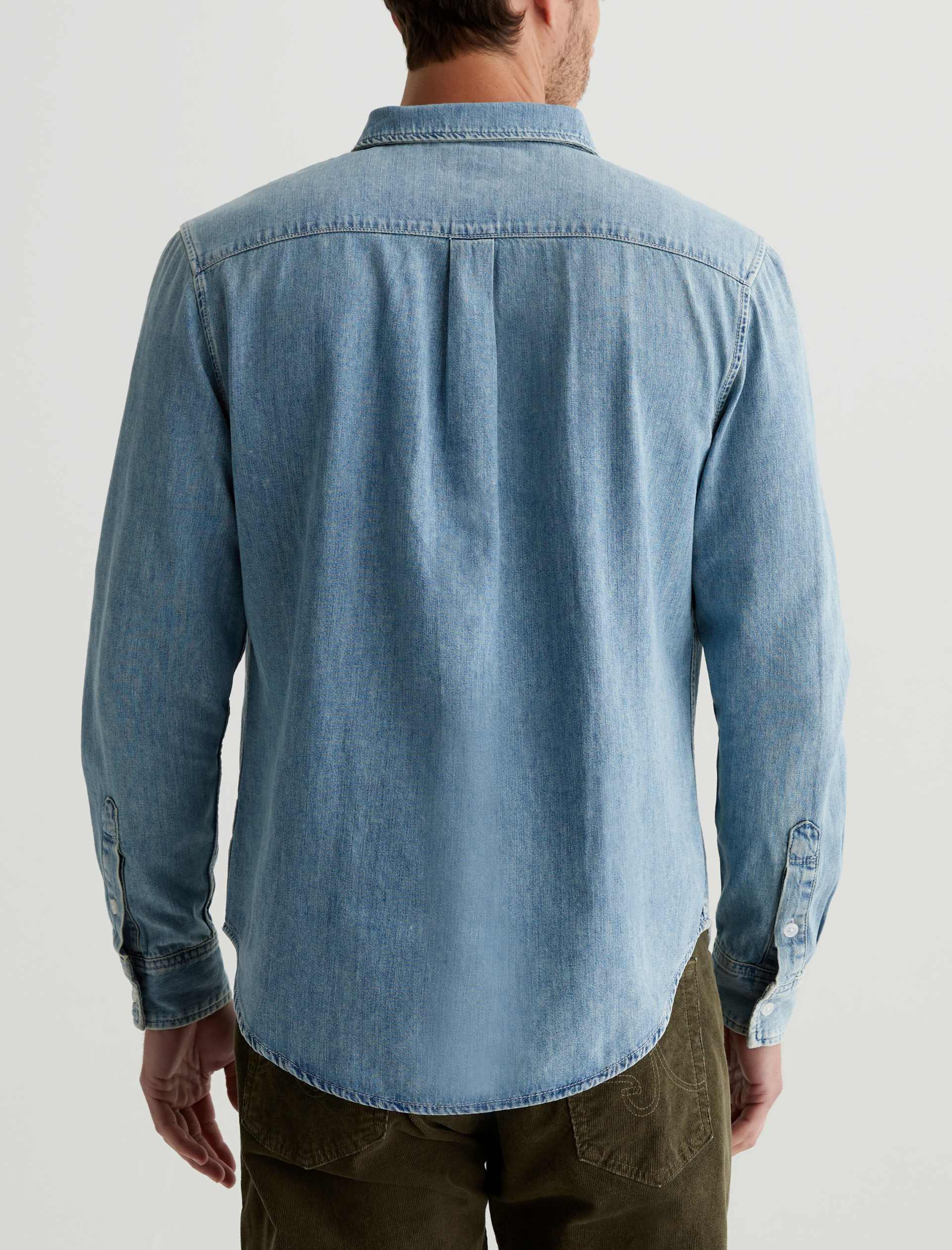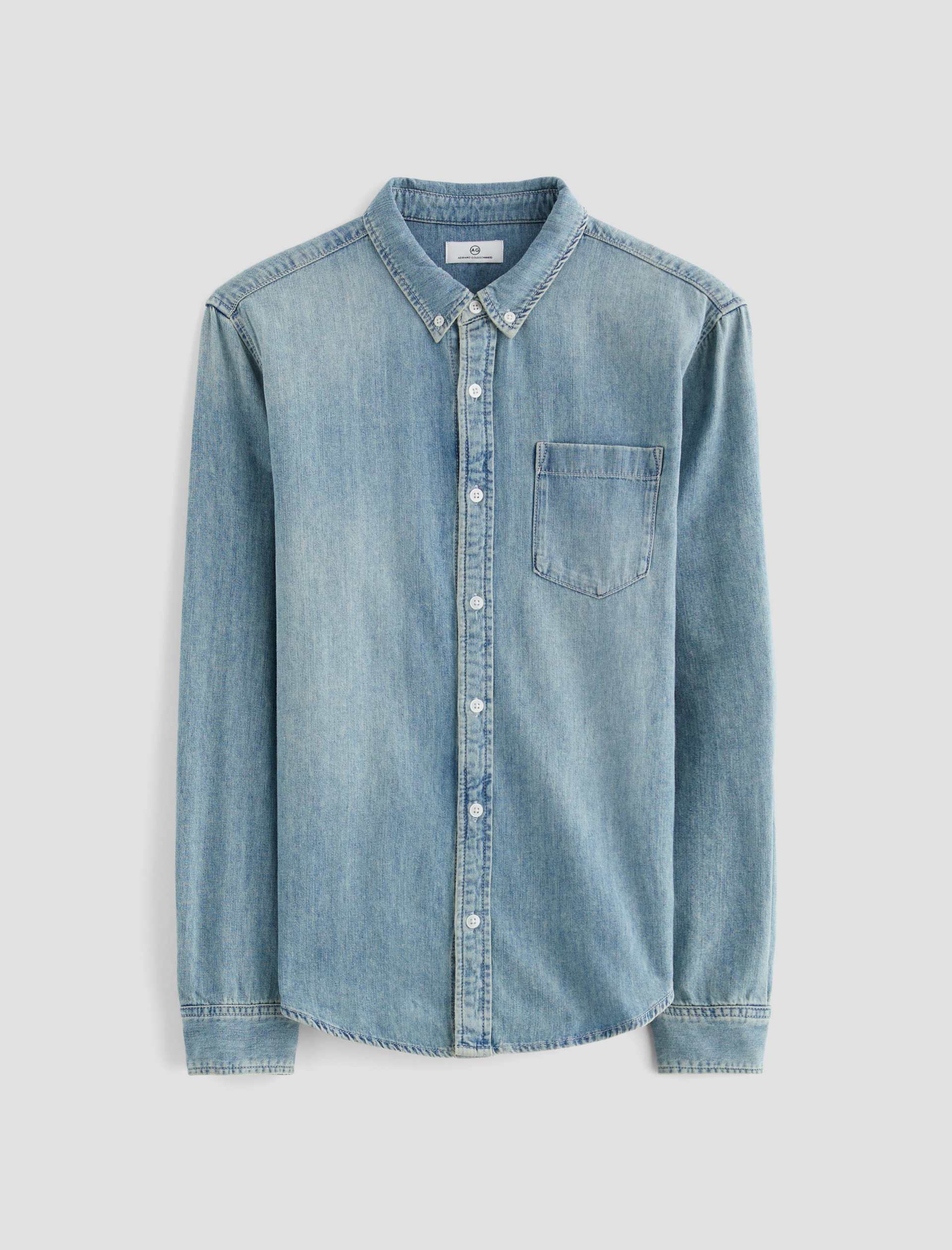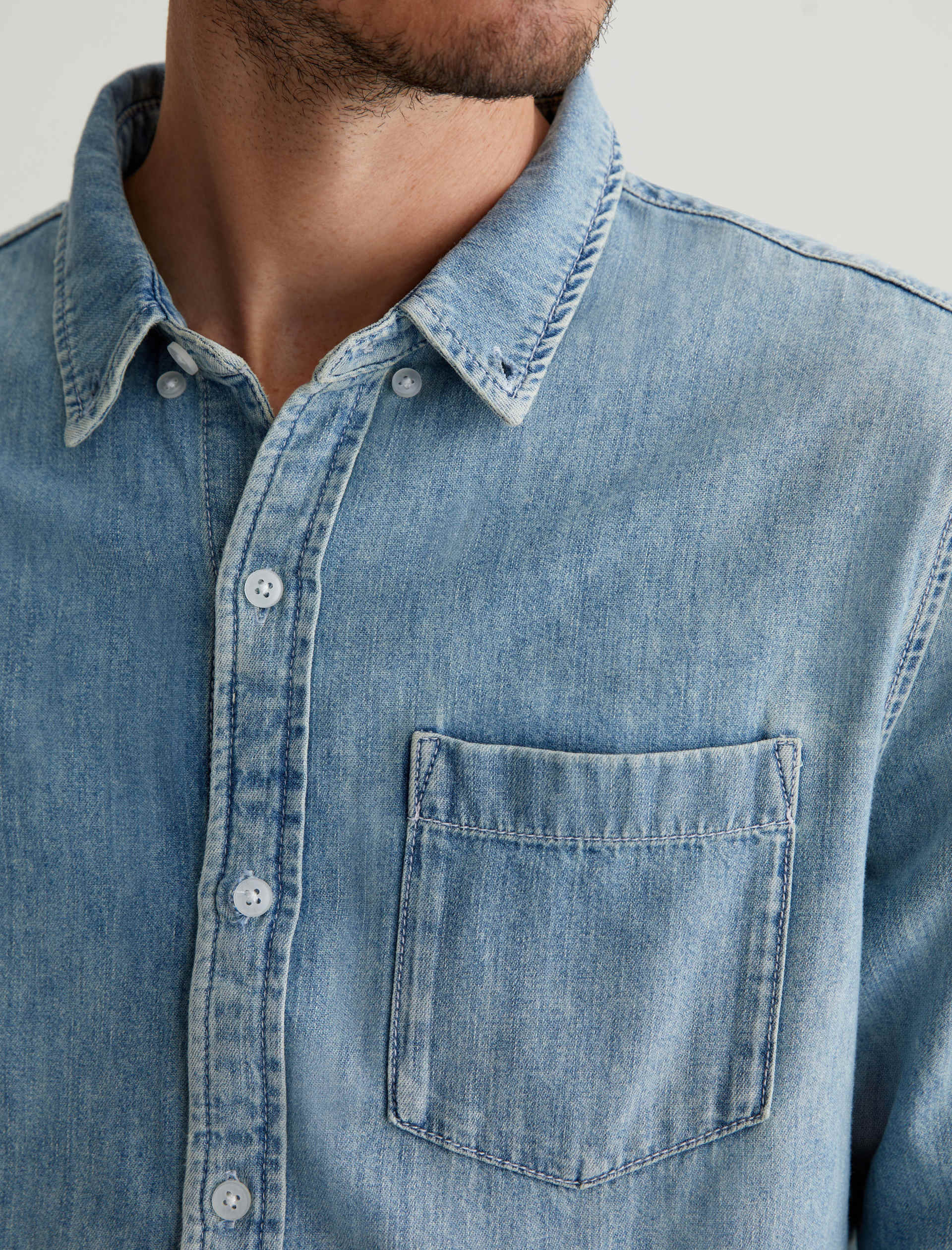 The Aiden Classic Shirt for men features a light denim wash. The Aiden Classic Shirt features a single front chest pocket, gentle fading, and white buttons, designed in a comfortable and lightweight Cove Denim.