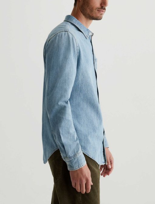 The Aiden Classic Shirt for men features a light denim wash. The Aiden Classic Shirt features a single front chest pocket, gentle fading, and white buttons, designed in a comfortable and lightweight Cove Denim.