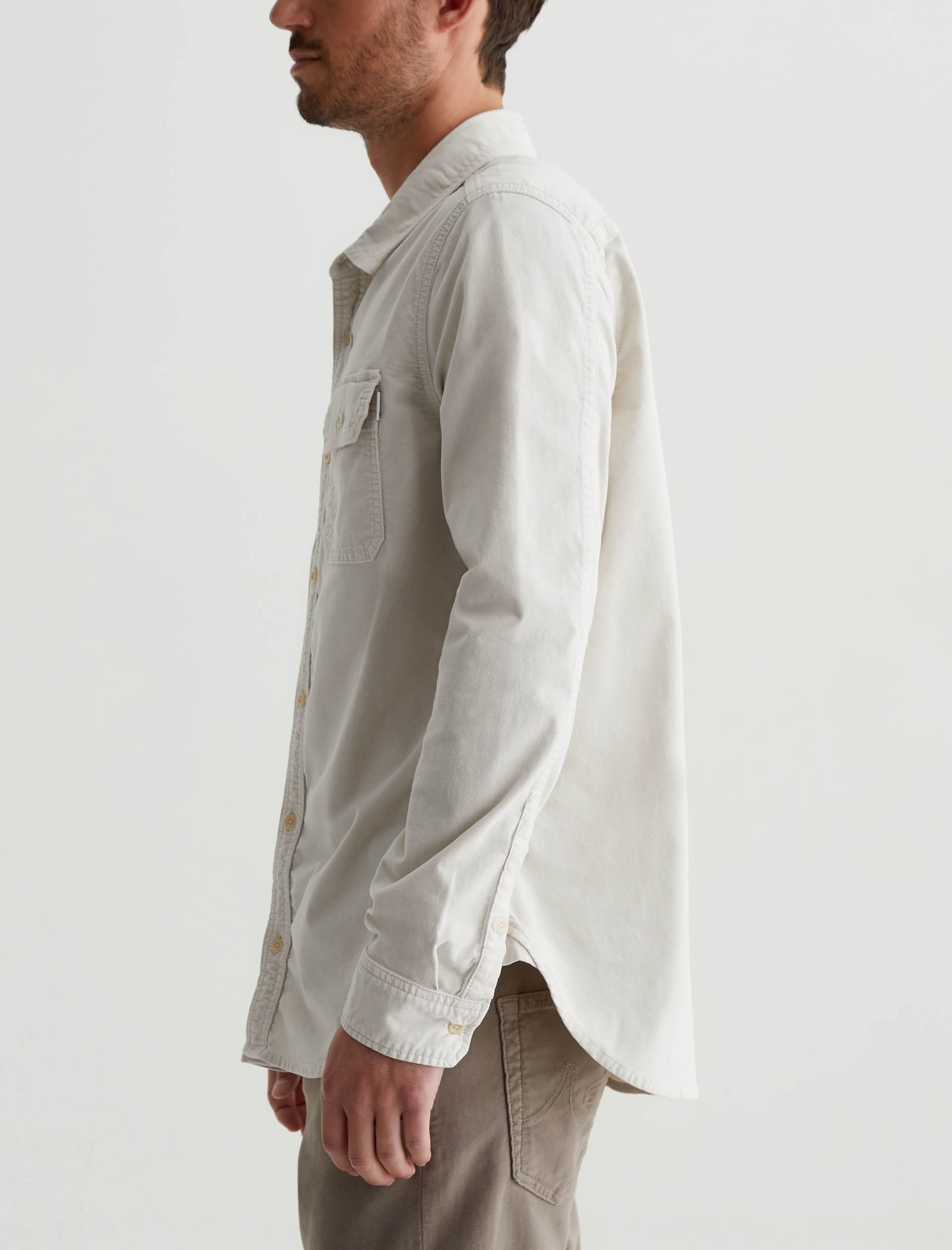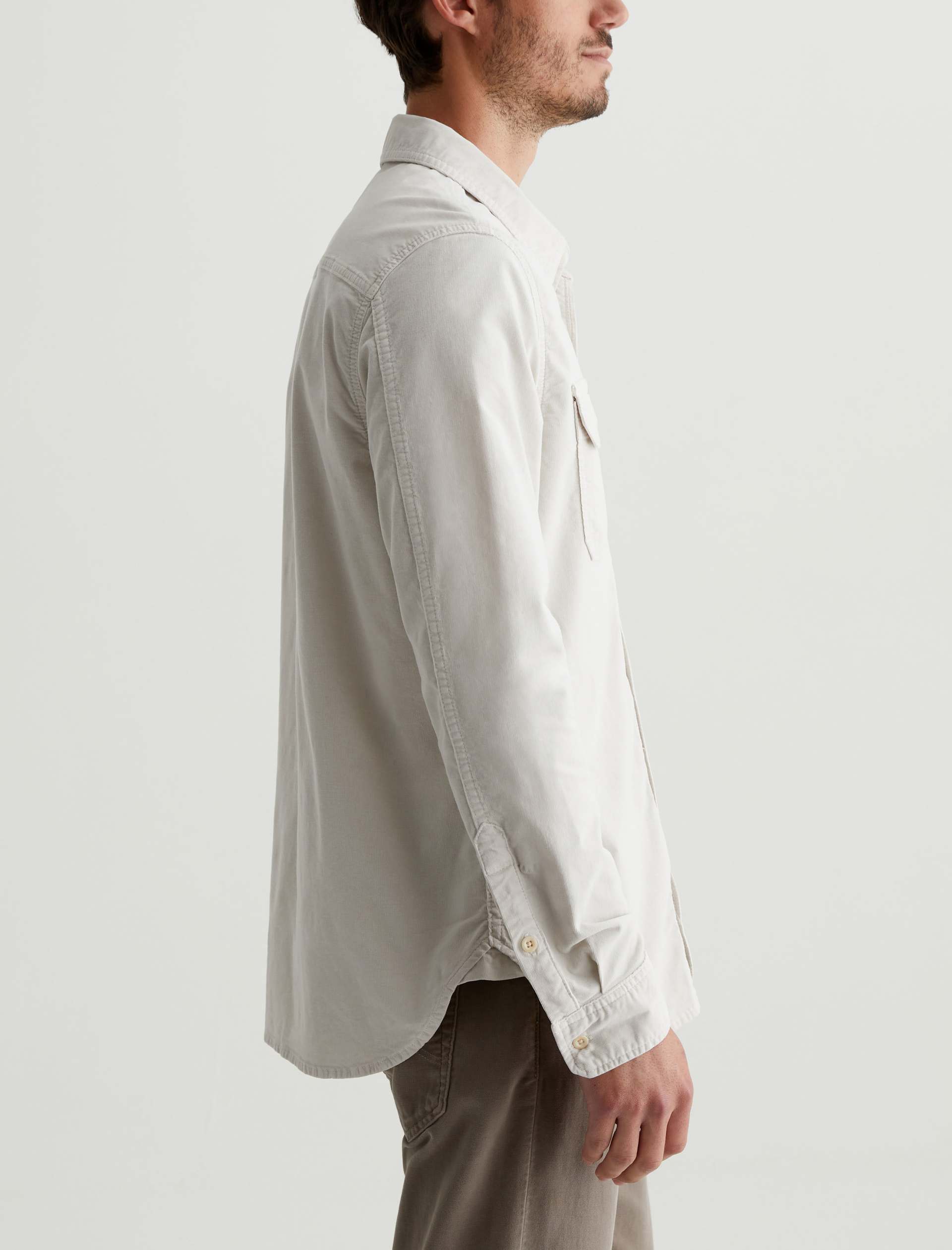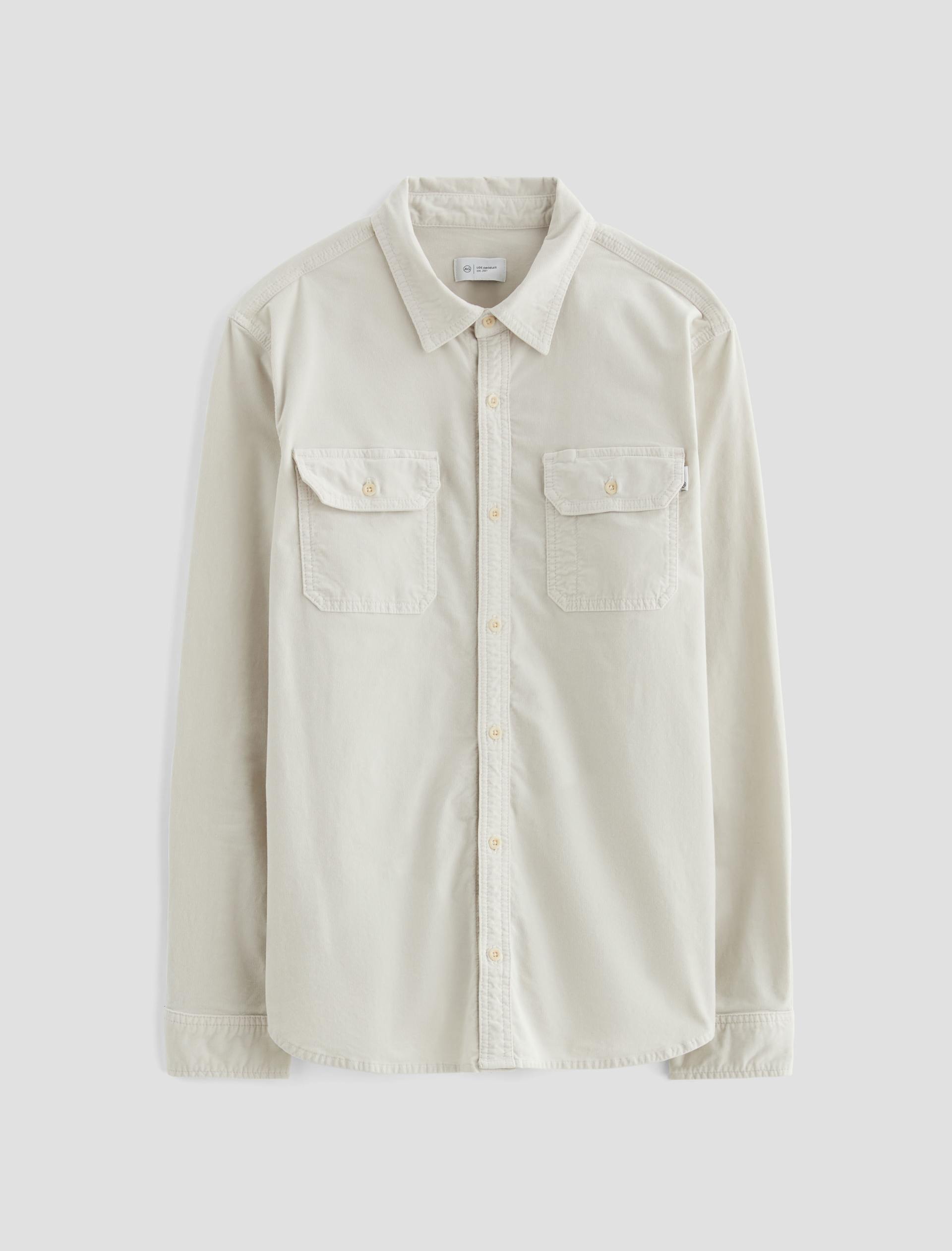 The Aiden Utility Shirt brings a workwear-inspired update to a timeless button-up style. Featuring flap pockets at the front, the long-sleeve style is for a classic fit in 6.4 oz. Velvet Corduroy from Italy. Done here in a pale grey shade, this men’s corduroy shirt has a pointed collar, button closures throughout, and