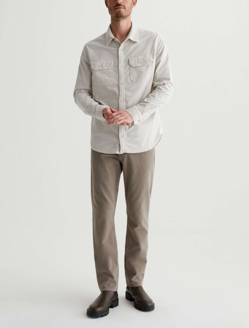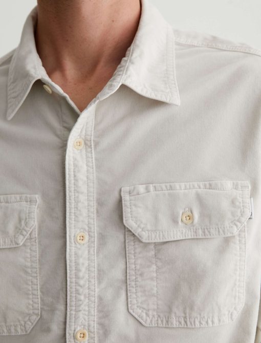 The Aiden Utility Shirt brings a workwear-inspired update to a timeless button-up style. Featuring flap pockets at the front, the long-sleeve style is for a classic fit in 6.4 oz. Velvet Corduroy from Italy. Done here in a pale grey shade, this men’s corduroy shirt has a pointed collar, button closures throughout, and