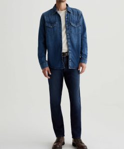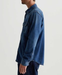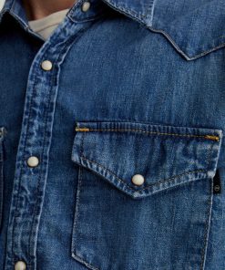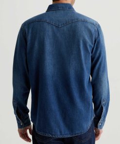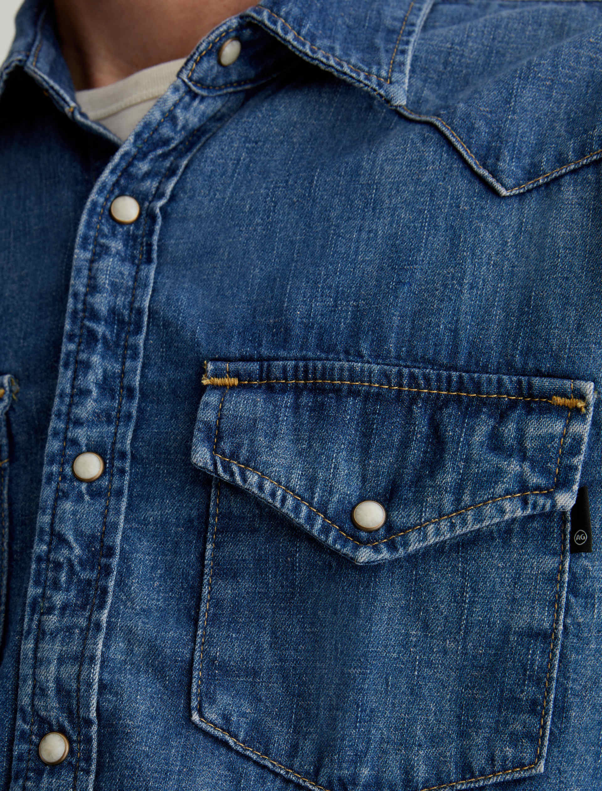 The Aiden Western Shirt for men offers a modern take on vintage Americana style. Made from 100% cotton in a faded indigo wash, this classic denim shirt has angled shoulder panels, flap pockets at the chest, and snap buttons throughout.