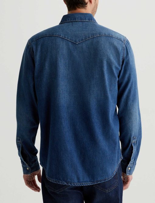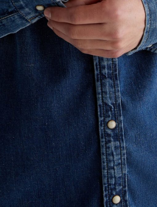 The Aiden Western Shirt for men offers a modern take on vintage Americana style. Made from 100% cotton in a faded indigo wash, this classic denim shirt has angled shoulder panels, flap pockets at the chest, and snap buttons throughout.