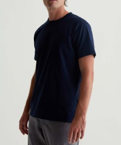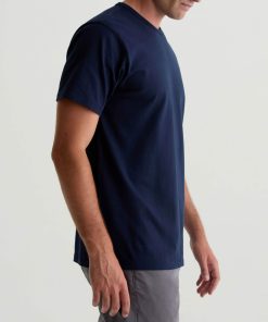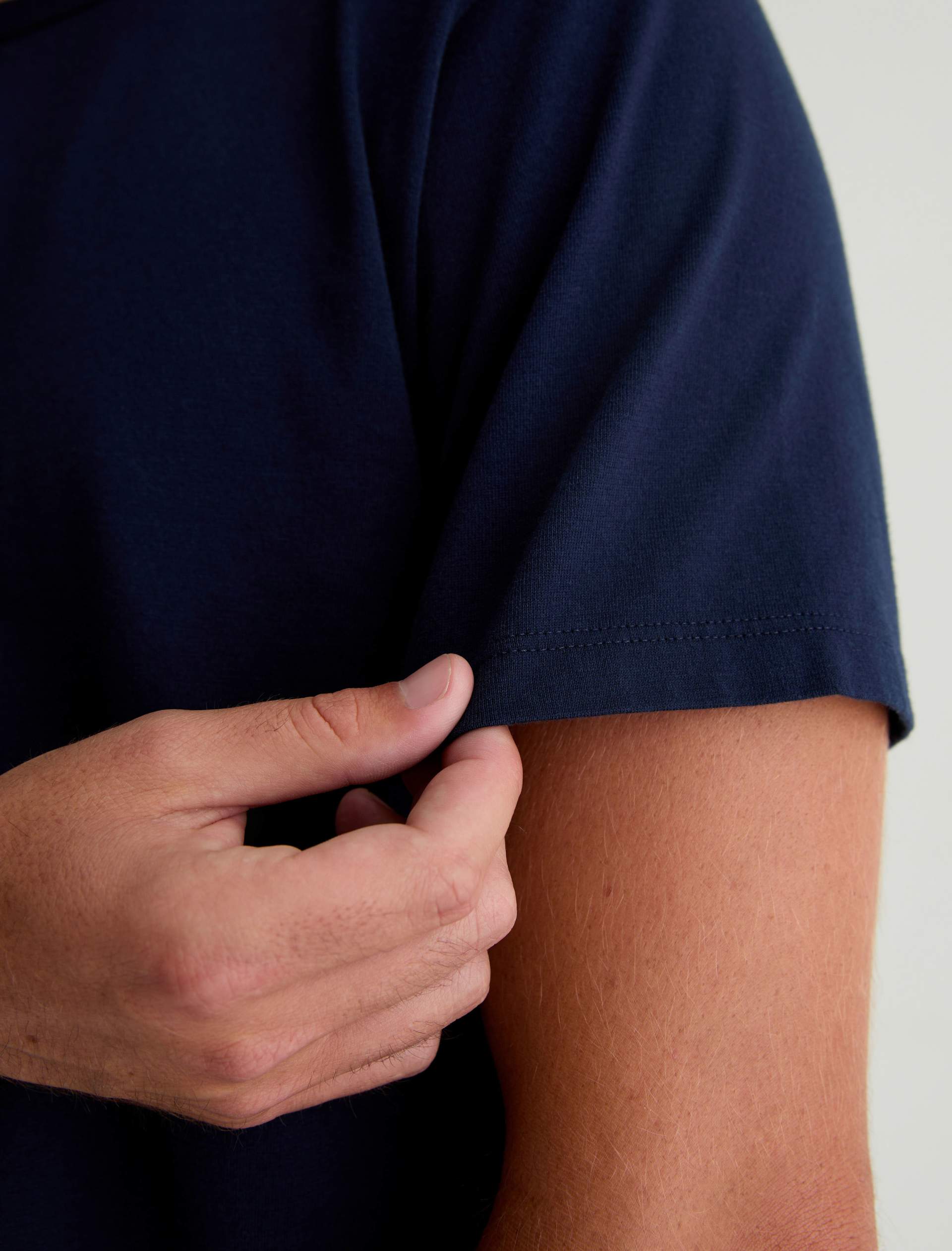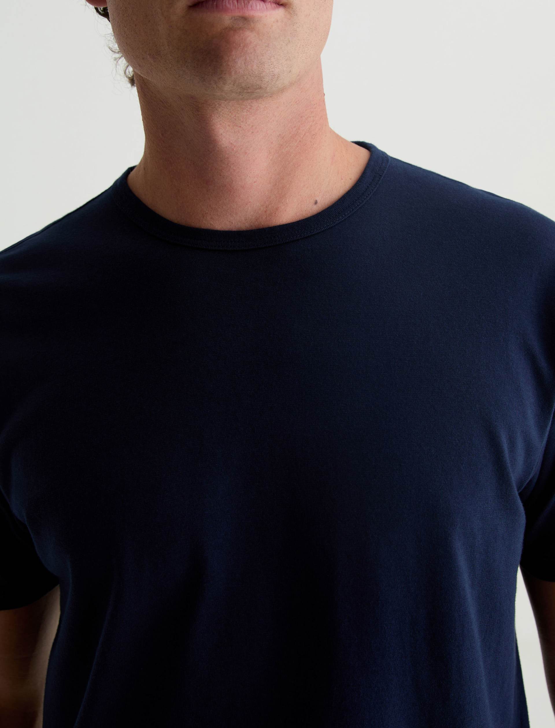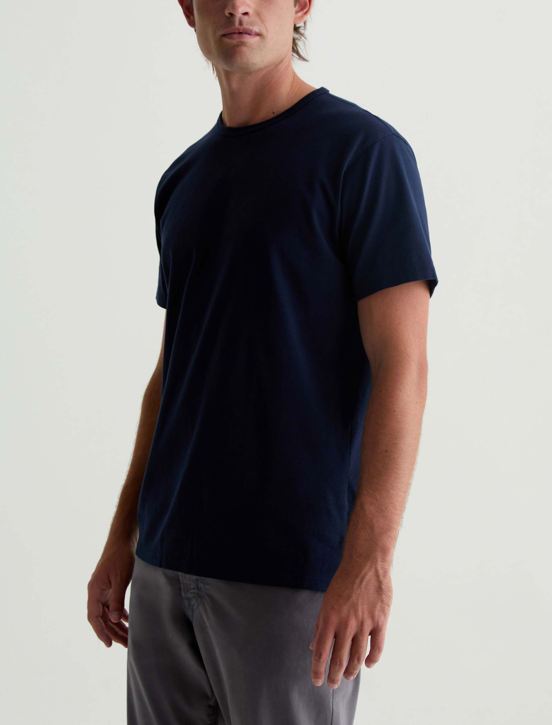 The Bryce Crew in deep navy is a classic fit crewneck, short sleeve tee. The tee offers a 1X1 baby rib at the neck to create a great crew shape and serves as the perfect base when layering all year long. Our Jersey Knit offers a luxurious comfort that is unrivaled—knitted with both S-twist and Z-twist yarn to sustain l