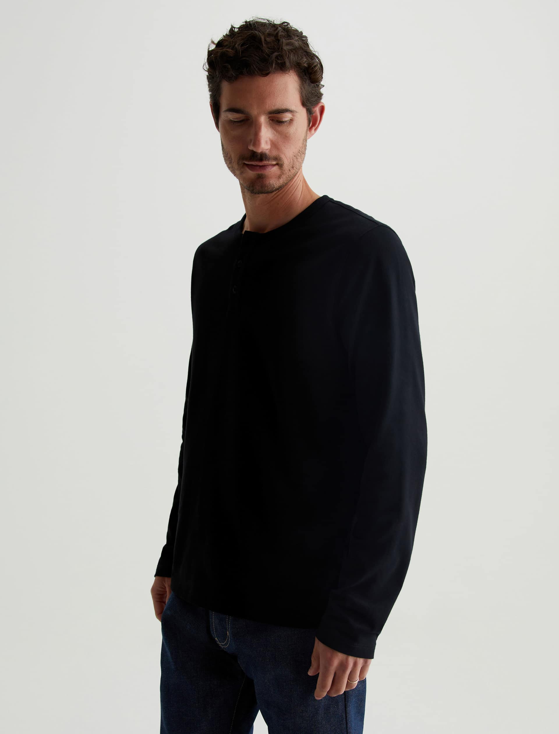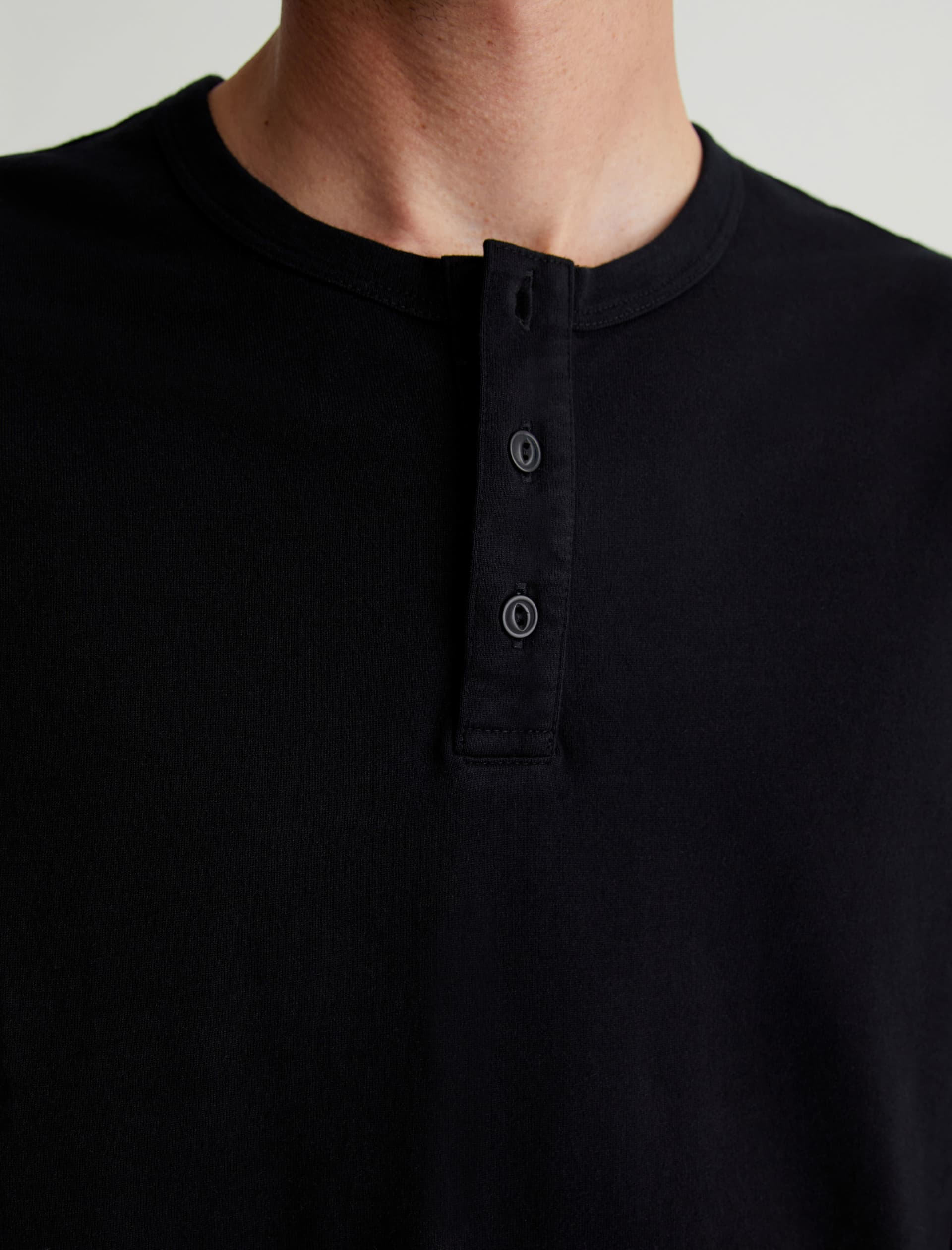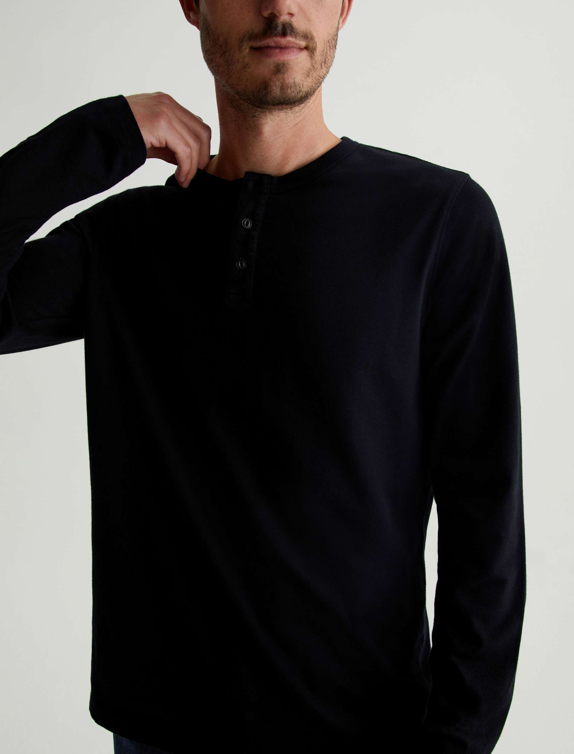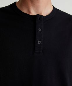 The Bryce Long Sleeve Henley in black is a classic silhouette for us, featuring a signature crew neckline with a self-placket featuring 3 buttons for versatile styling. Our Jersey Knit offers a luxurious comfort that is unrivaled—knitted with both S-twist and Z-twist yarn to sustain longevity and stability, preventing