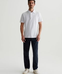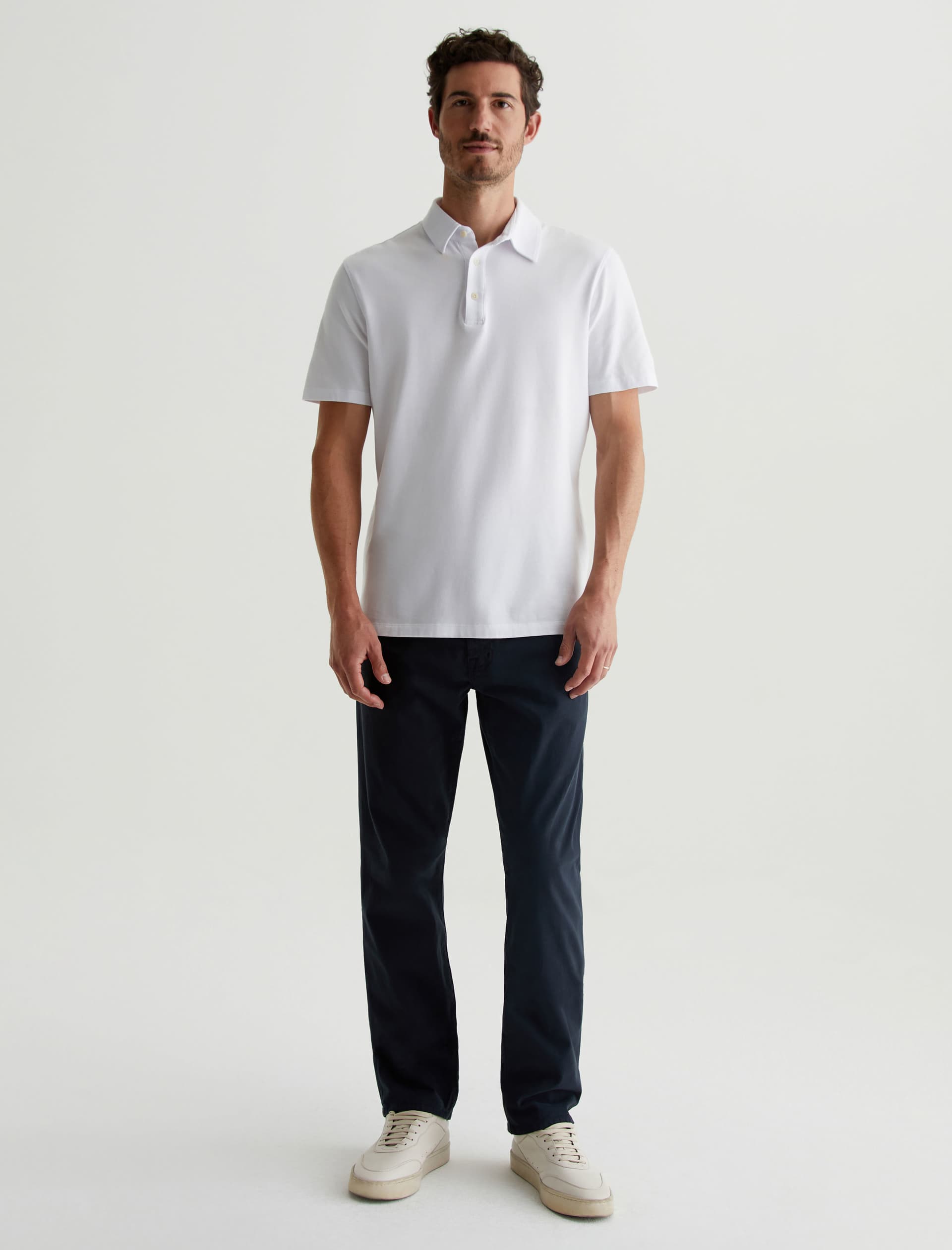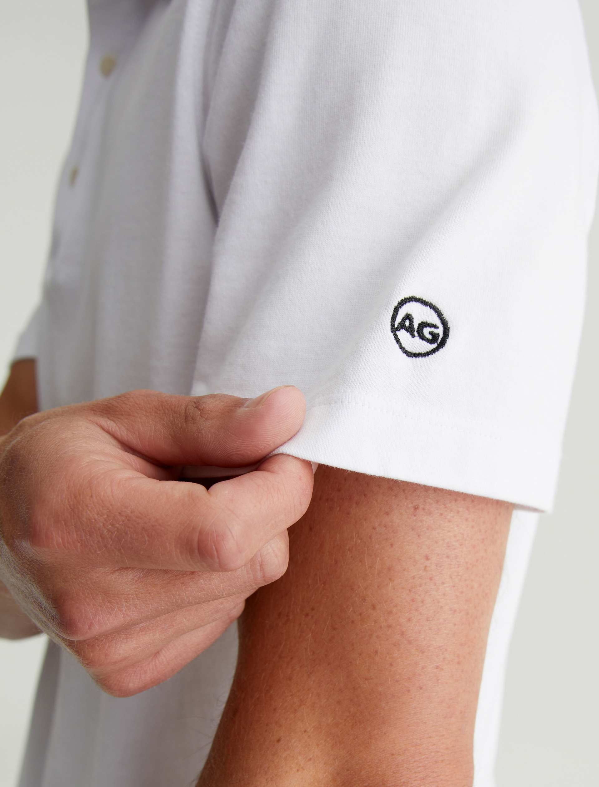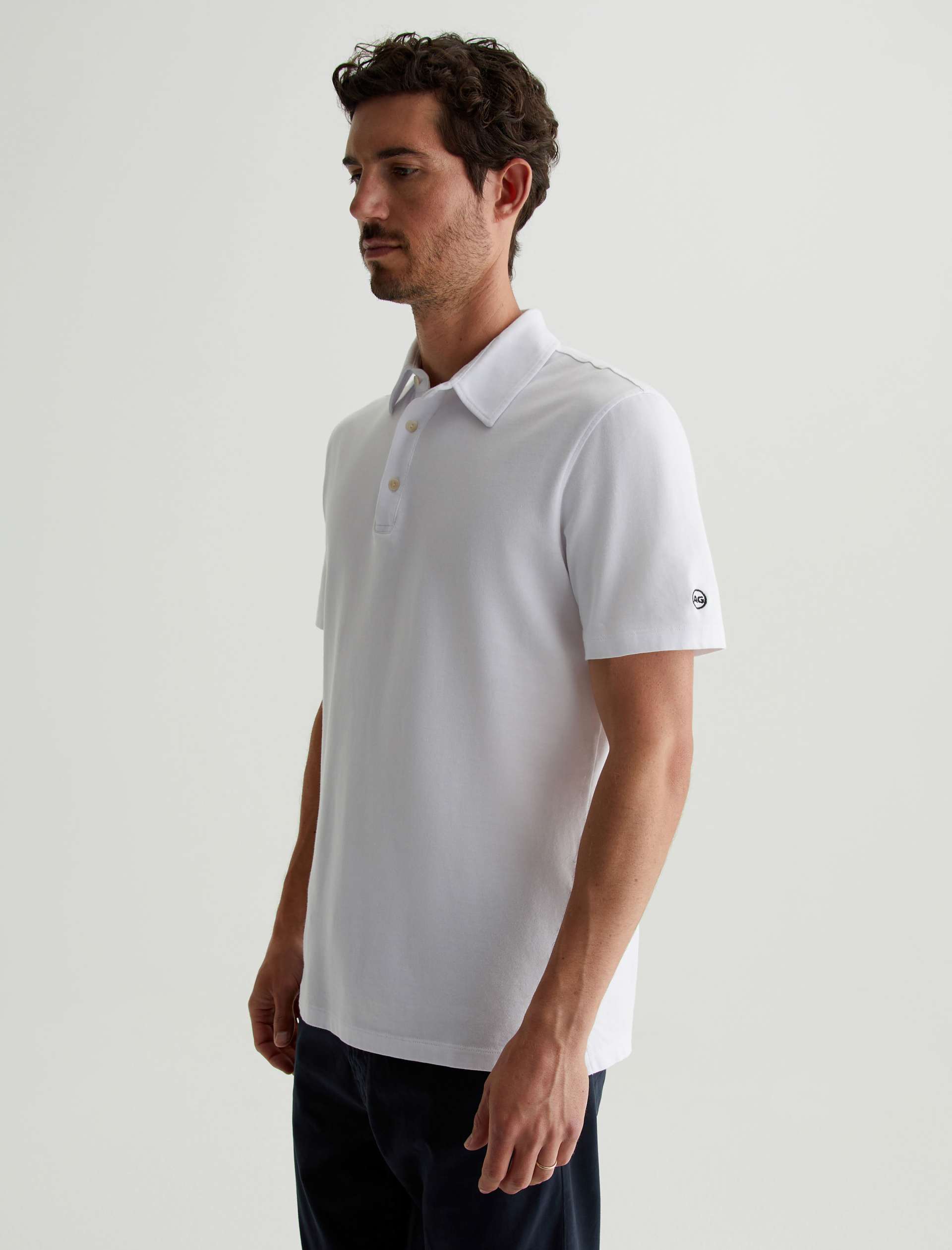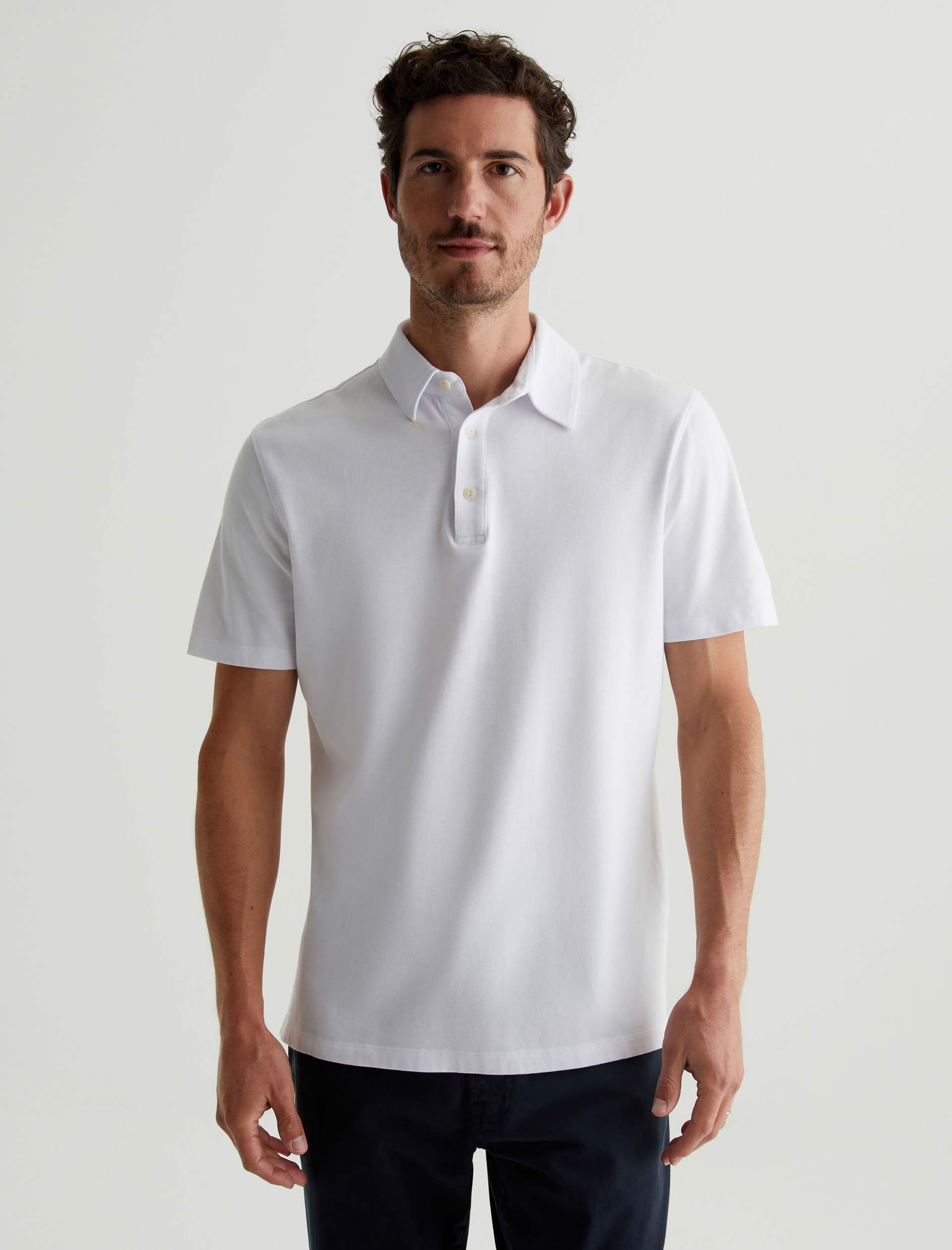 The Bryce Short Sleeve Polo in white is a unique addition to our Basic Essentials assortment, made with our ultra-luxe jersey fabrication. The self-collar adds a modern take on your classic polo shirt. Our Jersey Knit offers a luxurious comfort that is unrivaled—knitted with both S-twist and Z-twist yarn to sustain lon