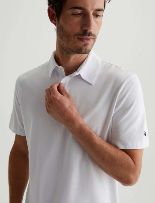 The Bryce Short Sleeve Polo in white is a unique addition to our Basic Essentials assortment, made with our ultra-luxe jersey fabrication. The self-collar adds a modern take on your classic polo shirt. Our Jersey Knit offers a luxurious comfort that is unrivaled—knitted with both S-twist and Z-twist yarn to sustain lon