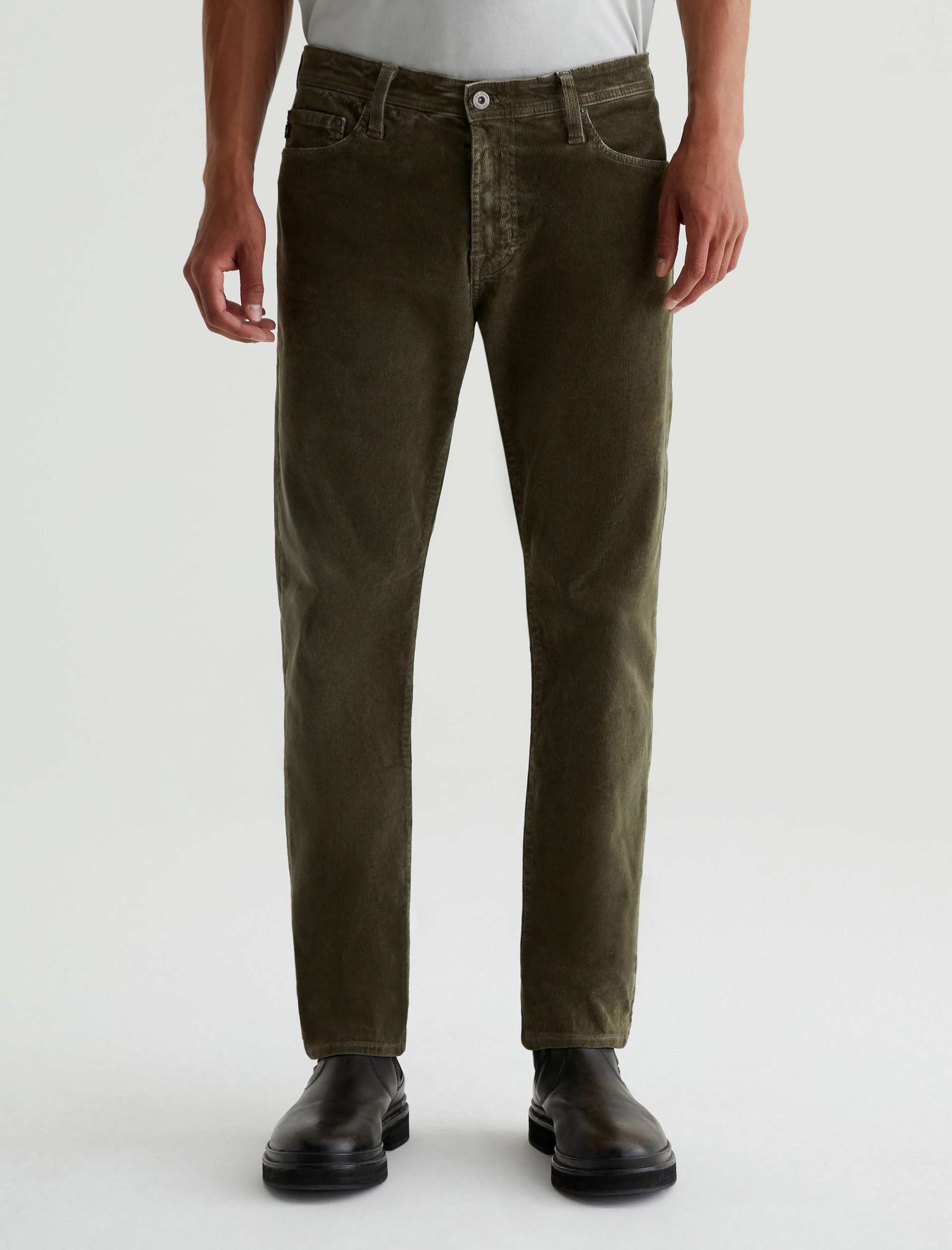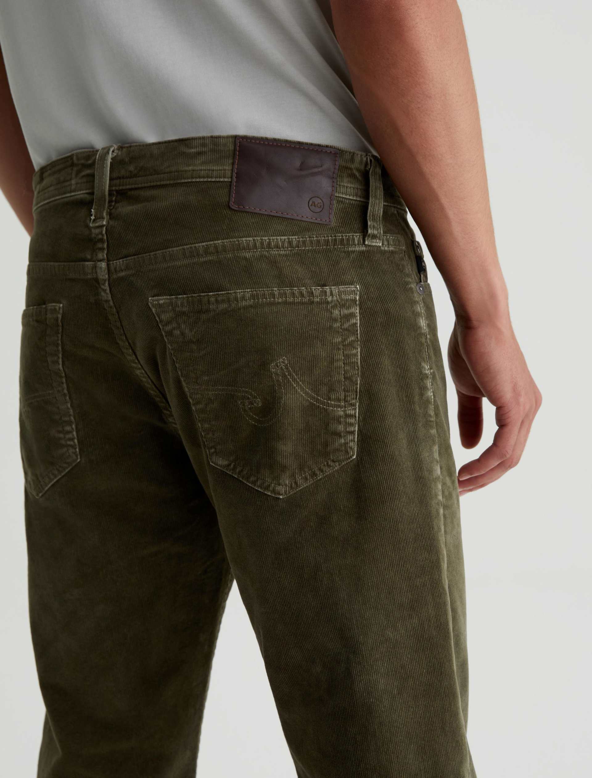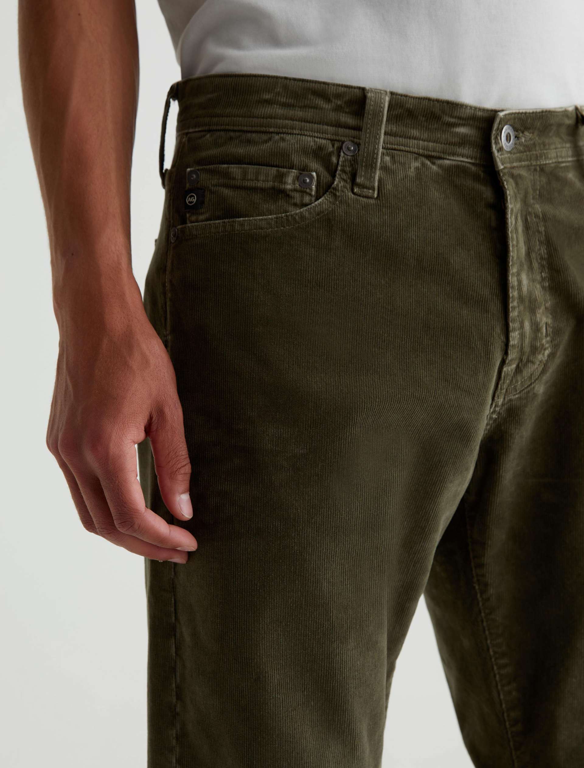 Our Everett slim-straight corduroy pants for men have a soft, plush feel in 8.8 oz. Range Stretch Cord fabric from Japan. Designed with fine-wale construction, this pair has been sulfur-dyed for a versatile dark-green shade. The style has a mid-rise waist and a straight fit that’s relaxed from hip to knee before slight