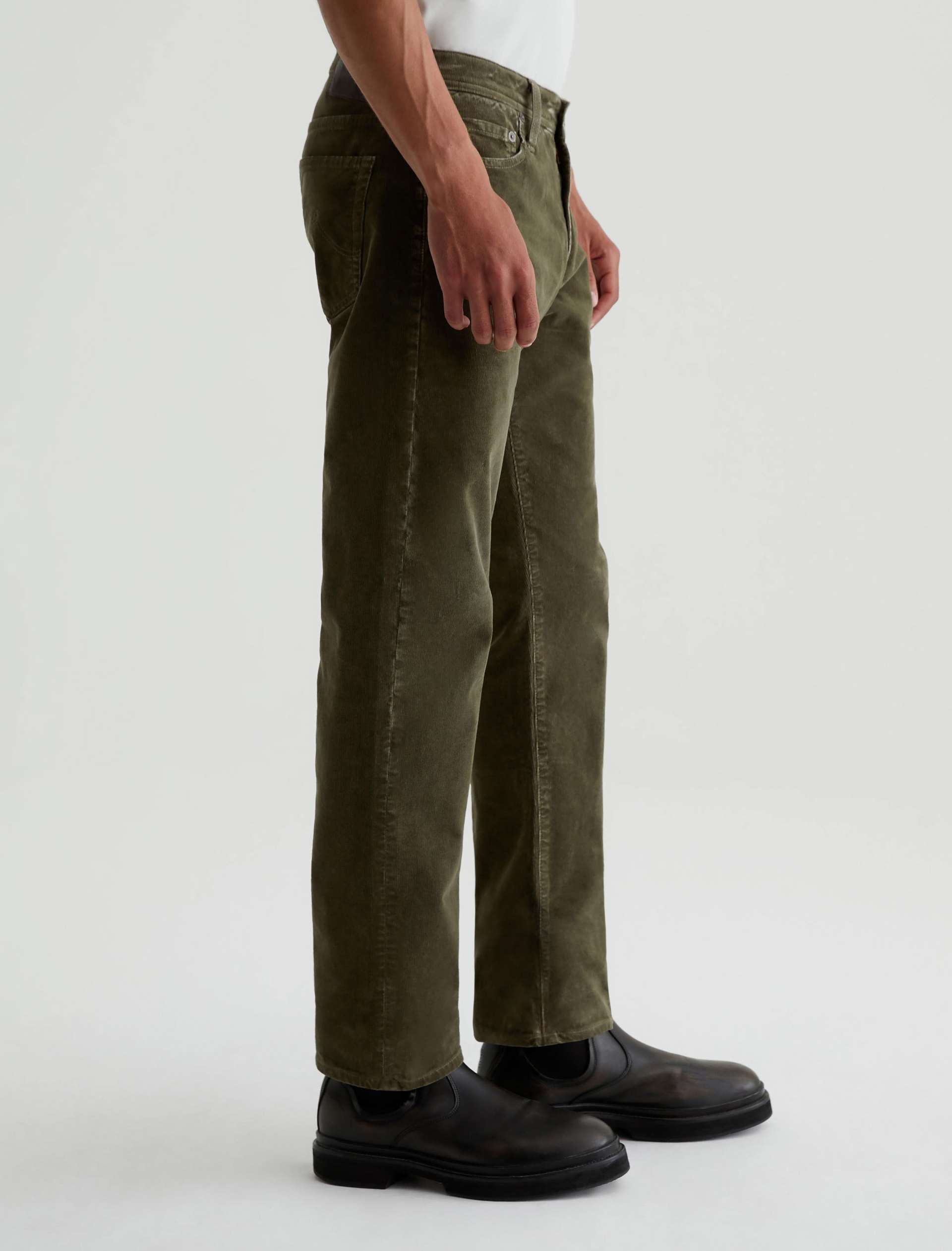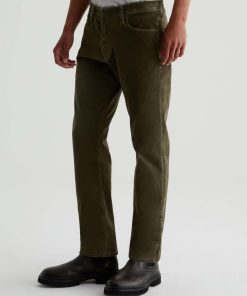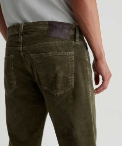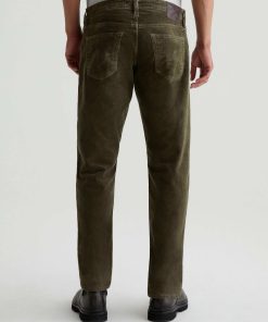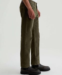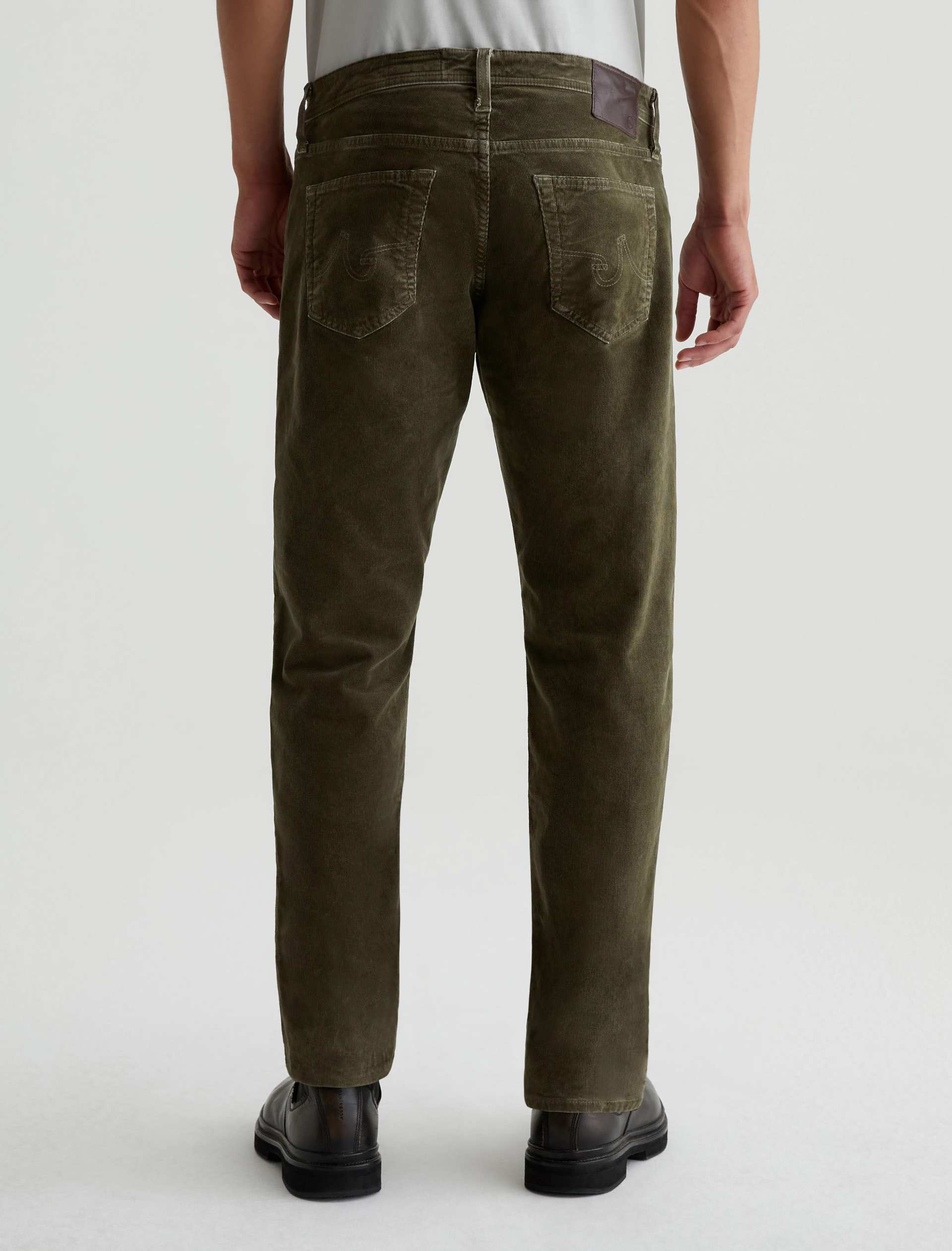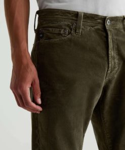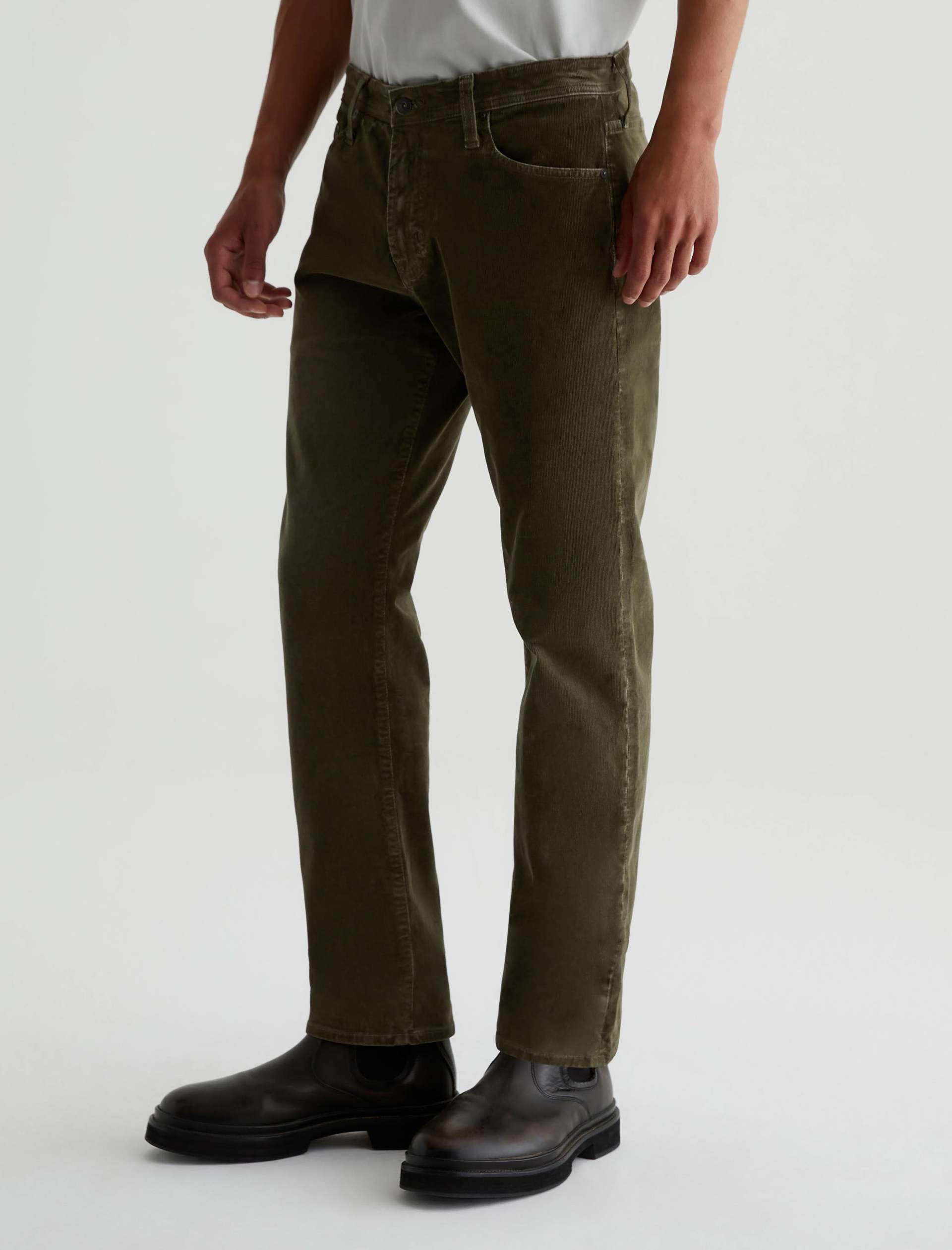 Our Everett slim-straight corduroy pants for men have a soft, plush feel in 8.8 oz. Range Stretch Cord fabric from Japan. Designed with fine-wale construction, this pair has been sulfur-dyed for a versatile dark-green shade. The style has a mid-rise waist and a straight fit that’s relaxed from hip to knee before slight