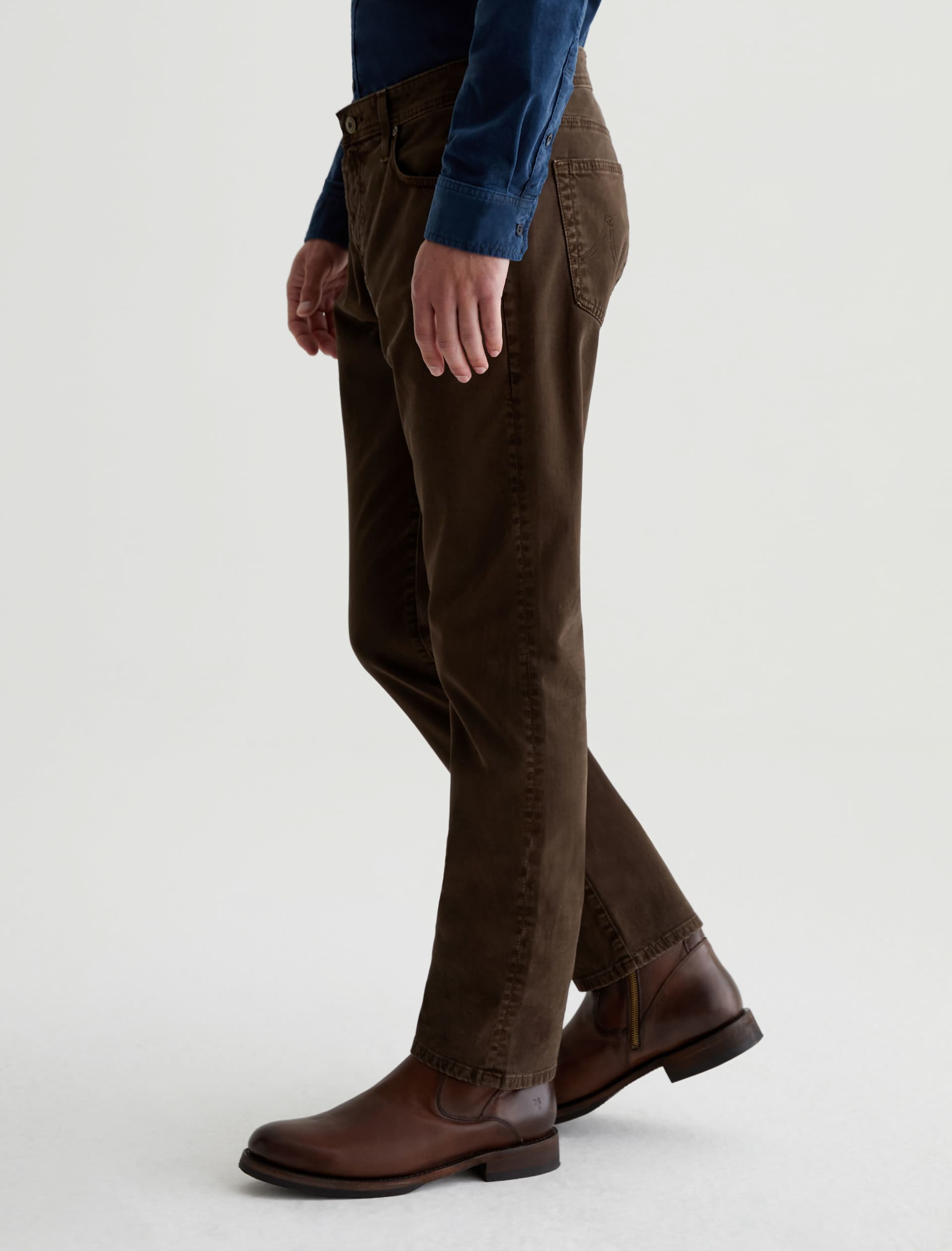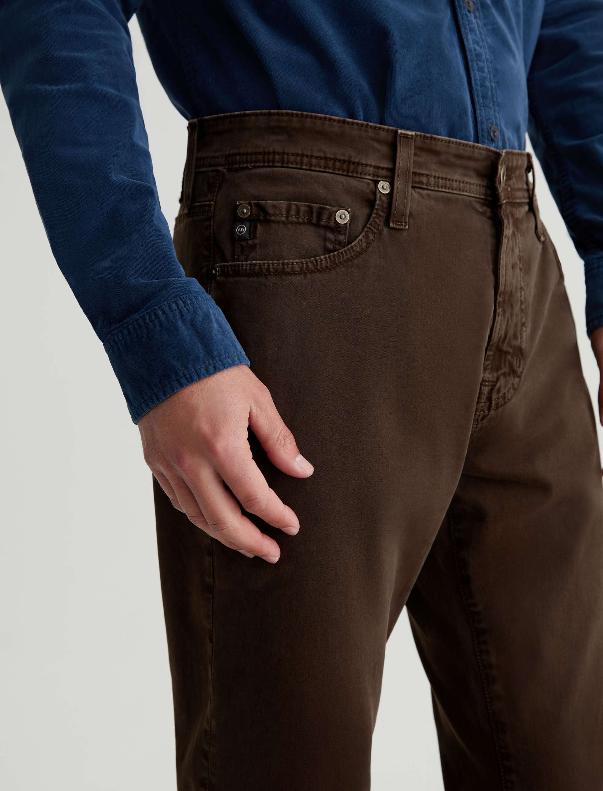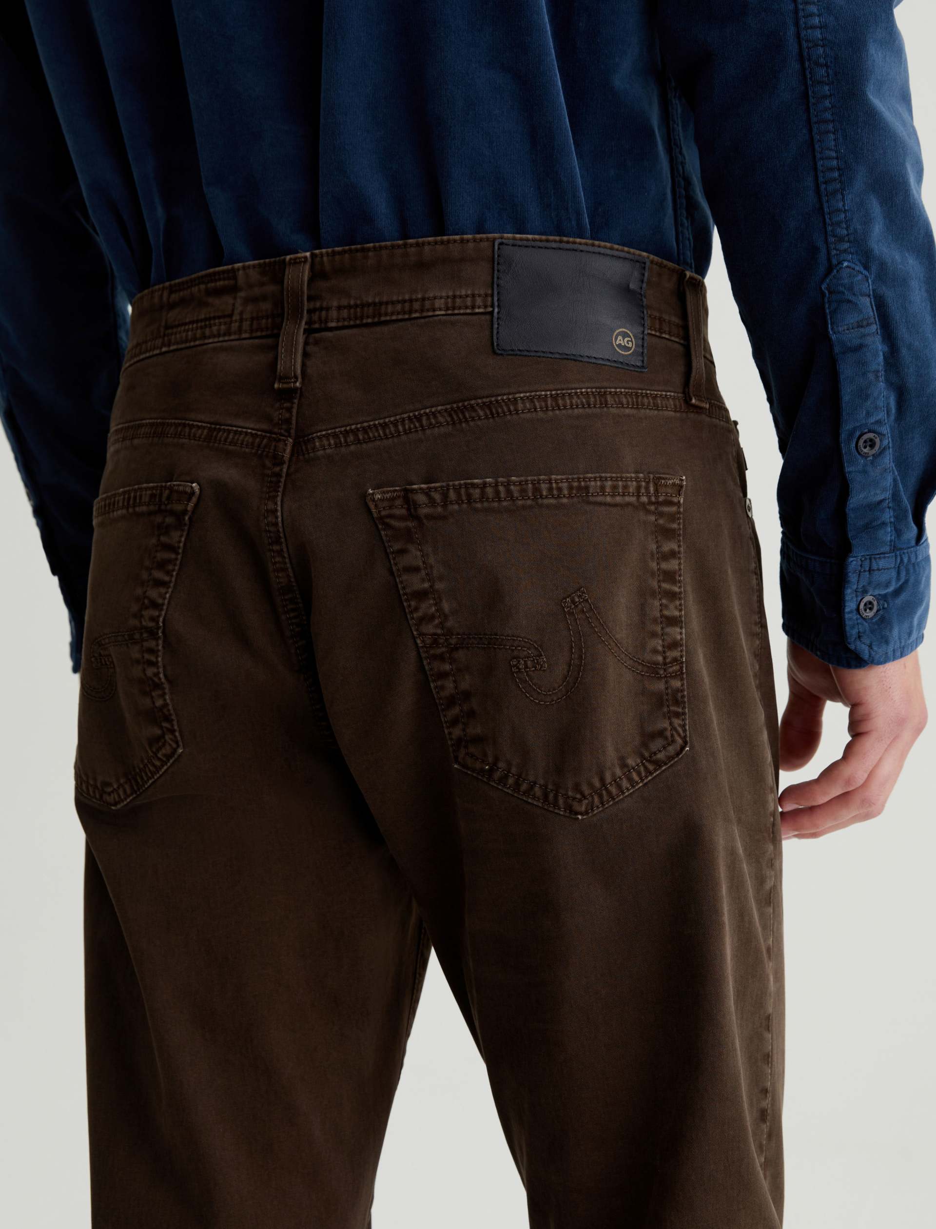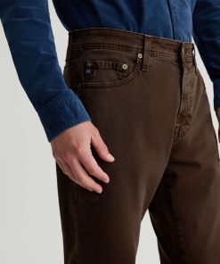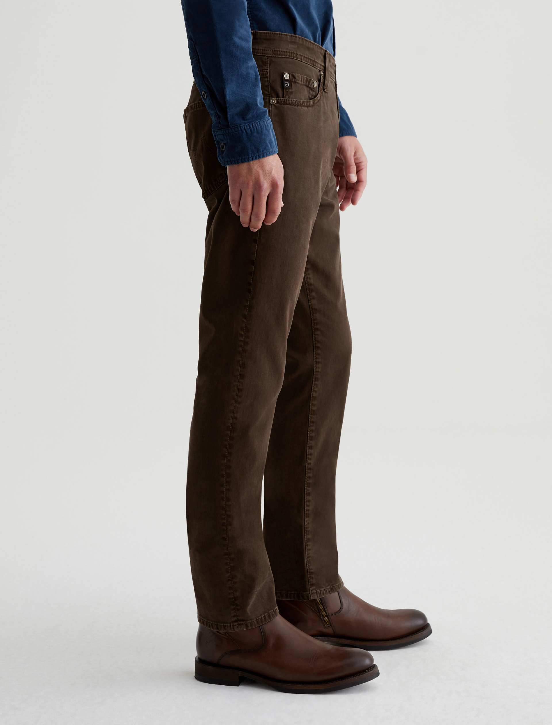 Our Everett slim-straight men’s pants have a refined look and soft, supple feel in AG’s best-selling 8.4 oz. Sueded Stretch Sateen from Italy. Sulfur-dyed for a dark brown shade, this pair has subtle variations of color at the seams and edges. The five-pocket style features a comfortable mid-rise waist and a straight f