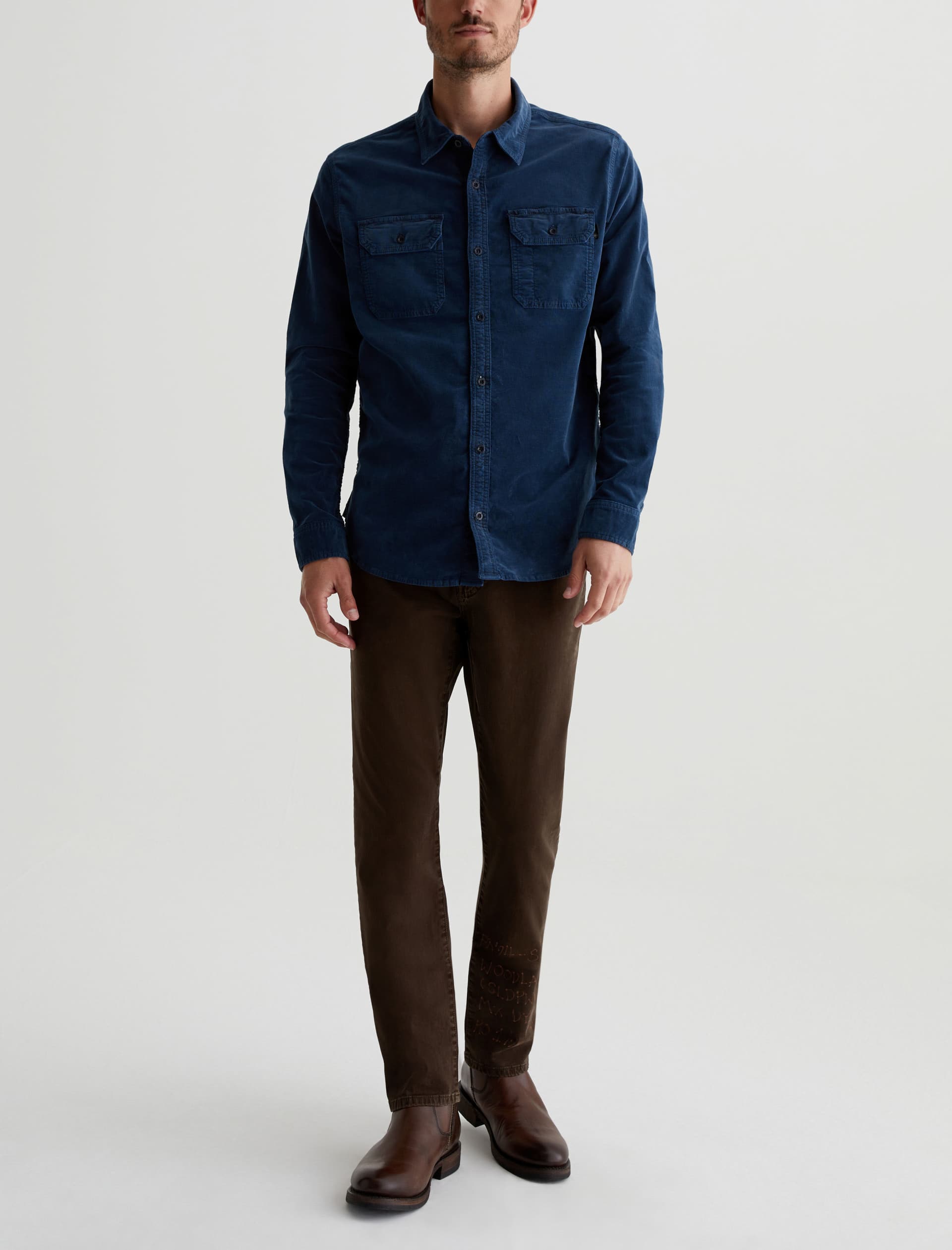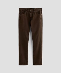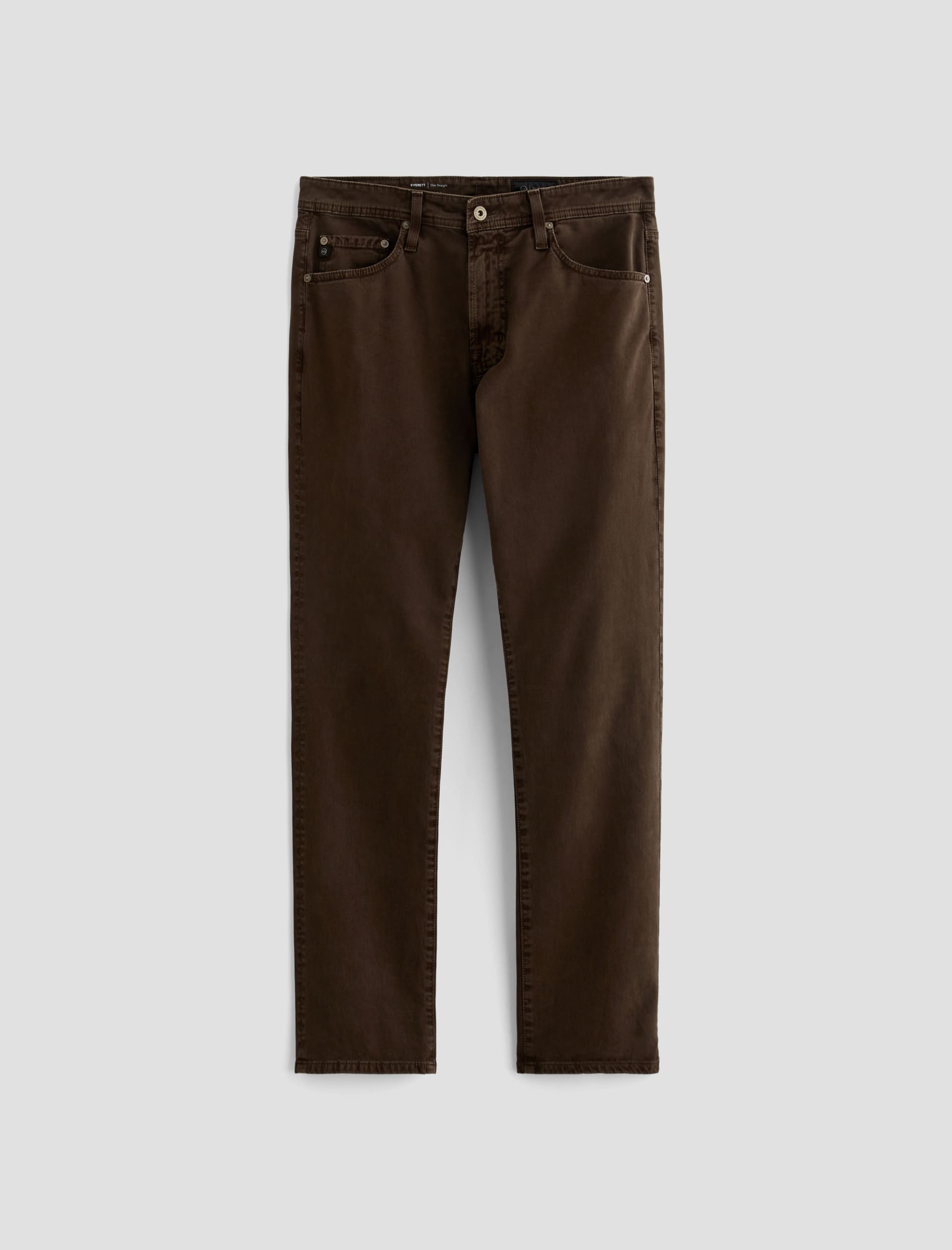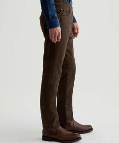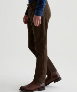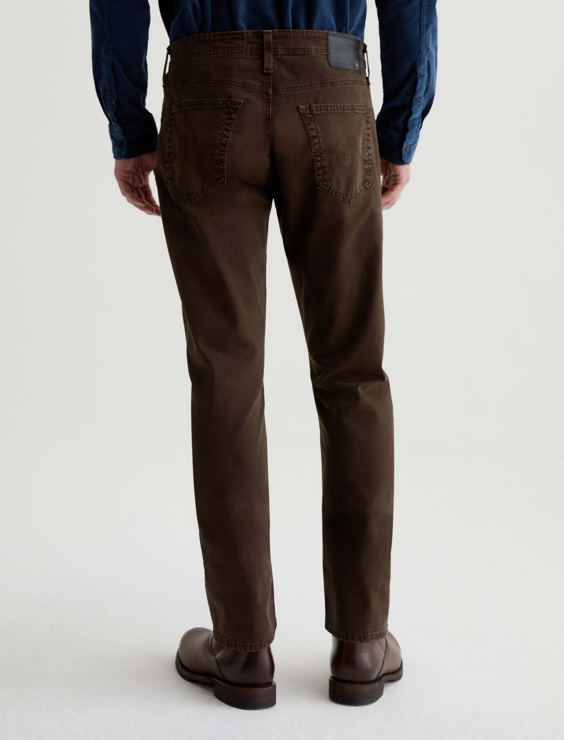 Our Everett slim-straight men’s pants have a refined look and soft, supple feel in AG’s best-selling 8.4 oz. Sueded Stretch Sateen from Italy. Sulfur-dyed for a dark brown shade, this pair has subtle variations of color at the seams and edges. The five-pocket style features a comfortable mid-rise waist and a straight f