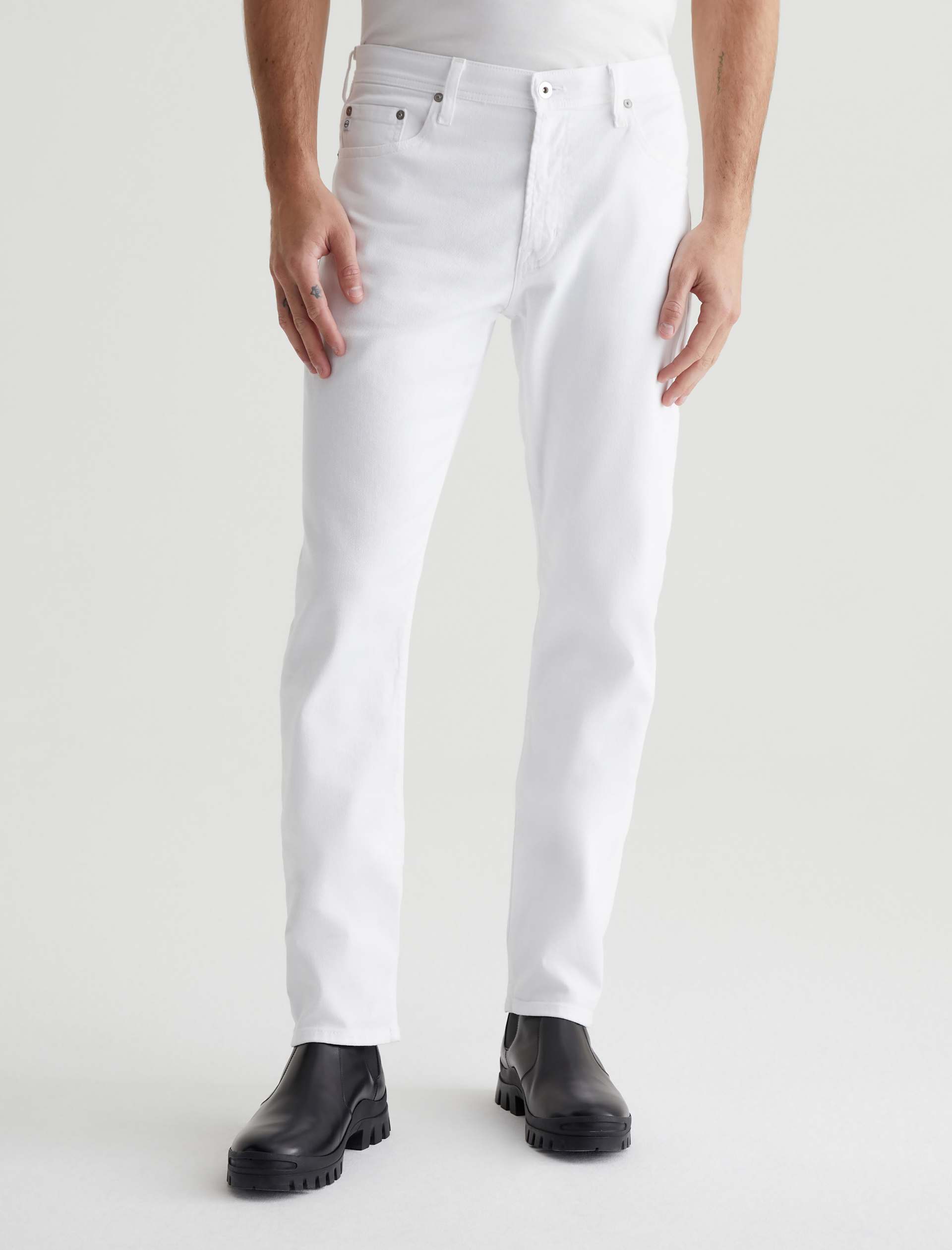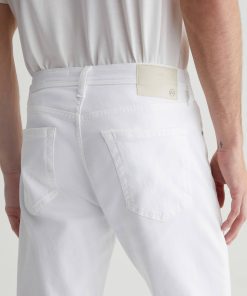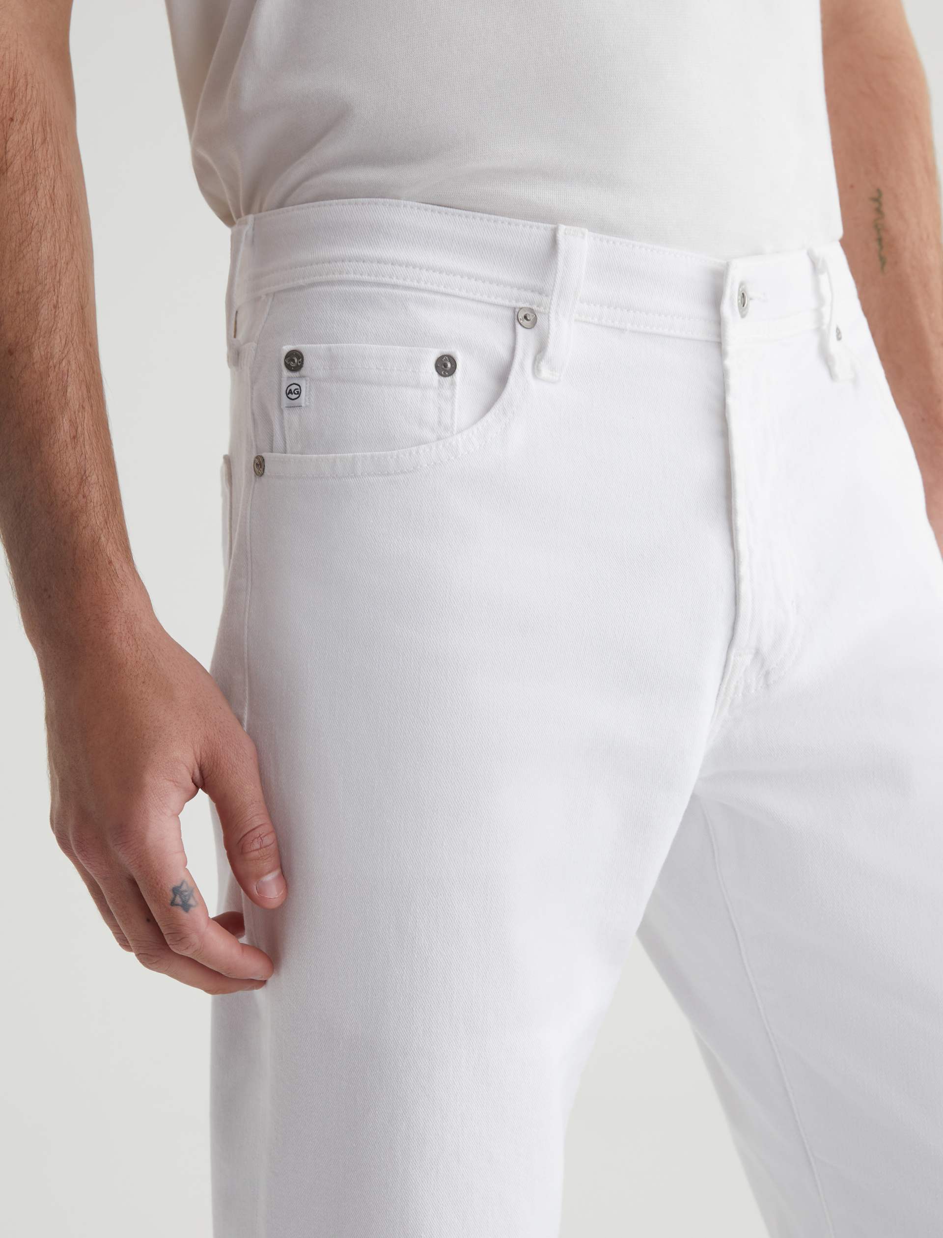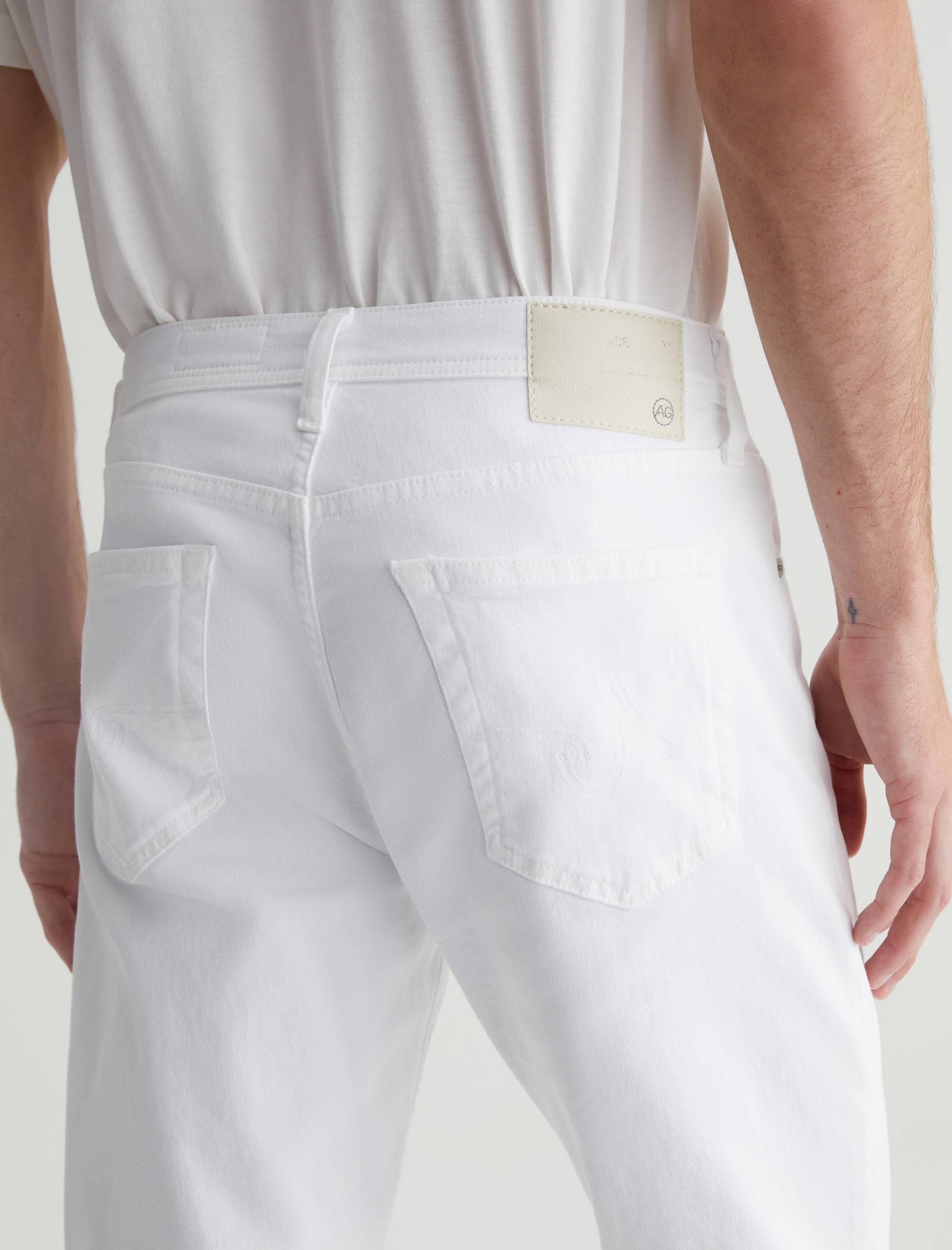 Everett is a slim straight men’s jean made from ultra-soft white denim. The style has a mid-rise waist and a straight fit that’s relaxed from hip to the knee before slightly tapering at the leg opening. These men’s slim straight jeans are designed in stretch-blend AG Cloud Soft Denim™. This special left-hand twill fabr