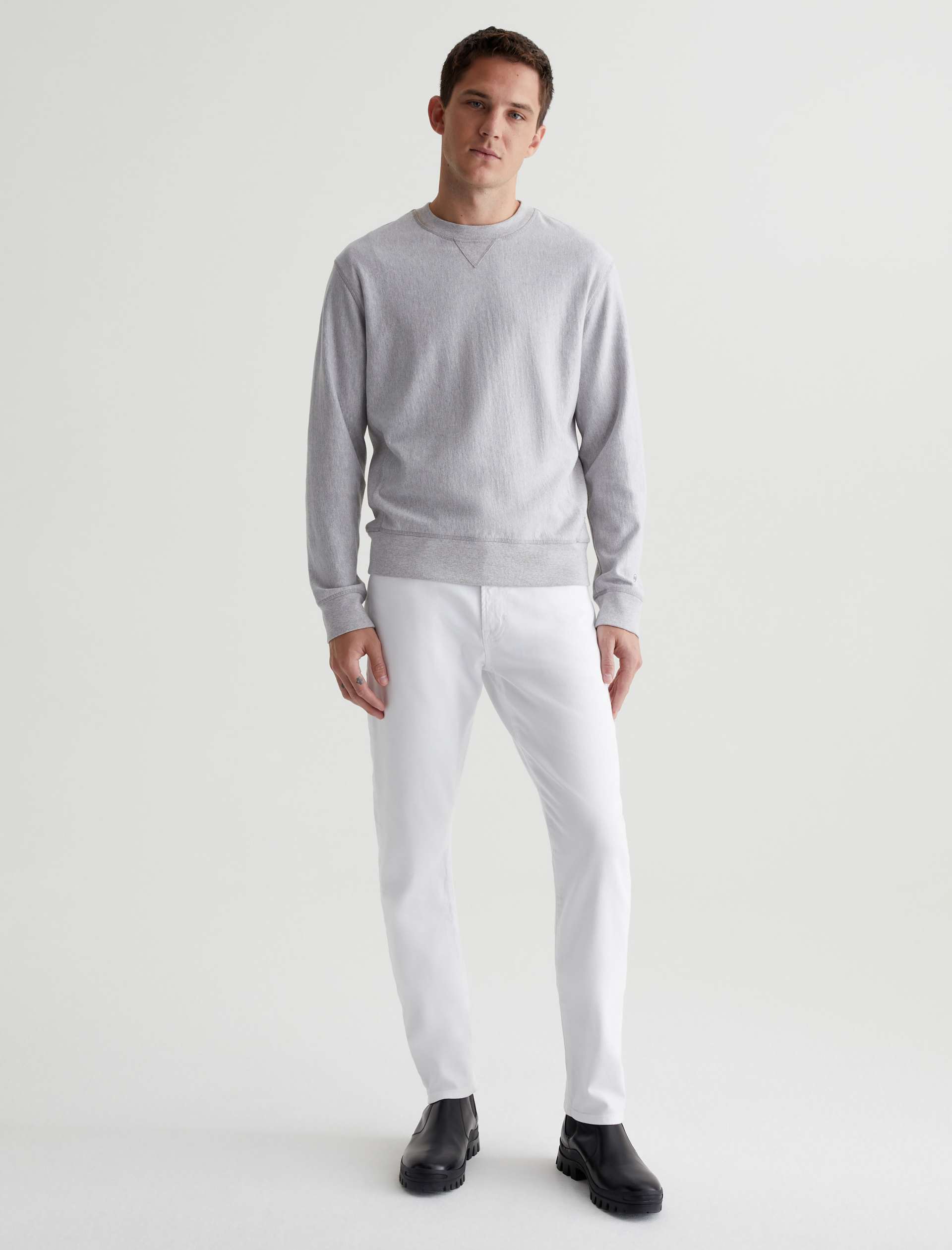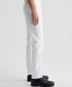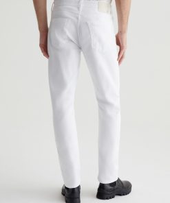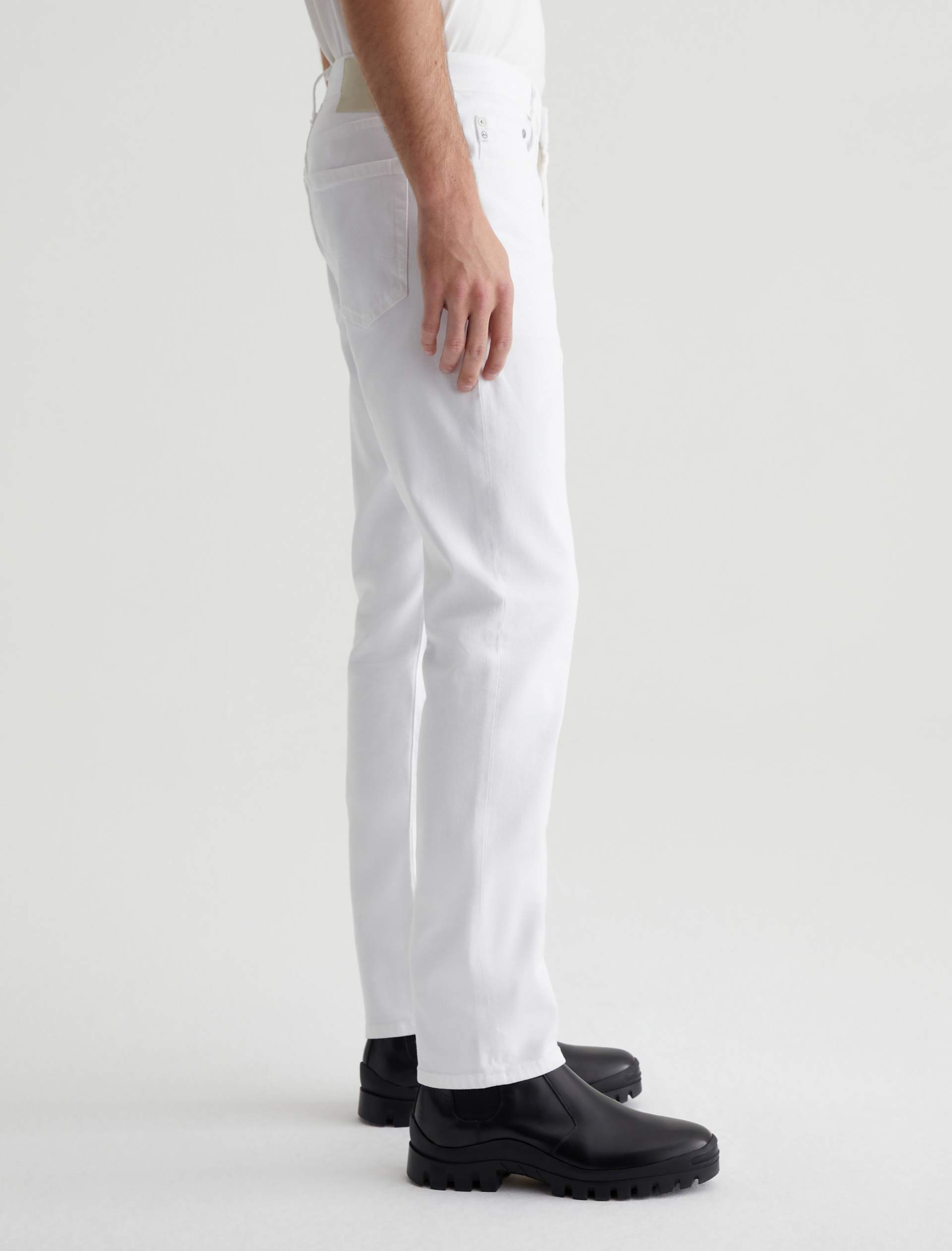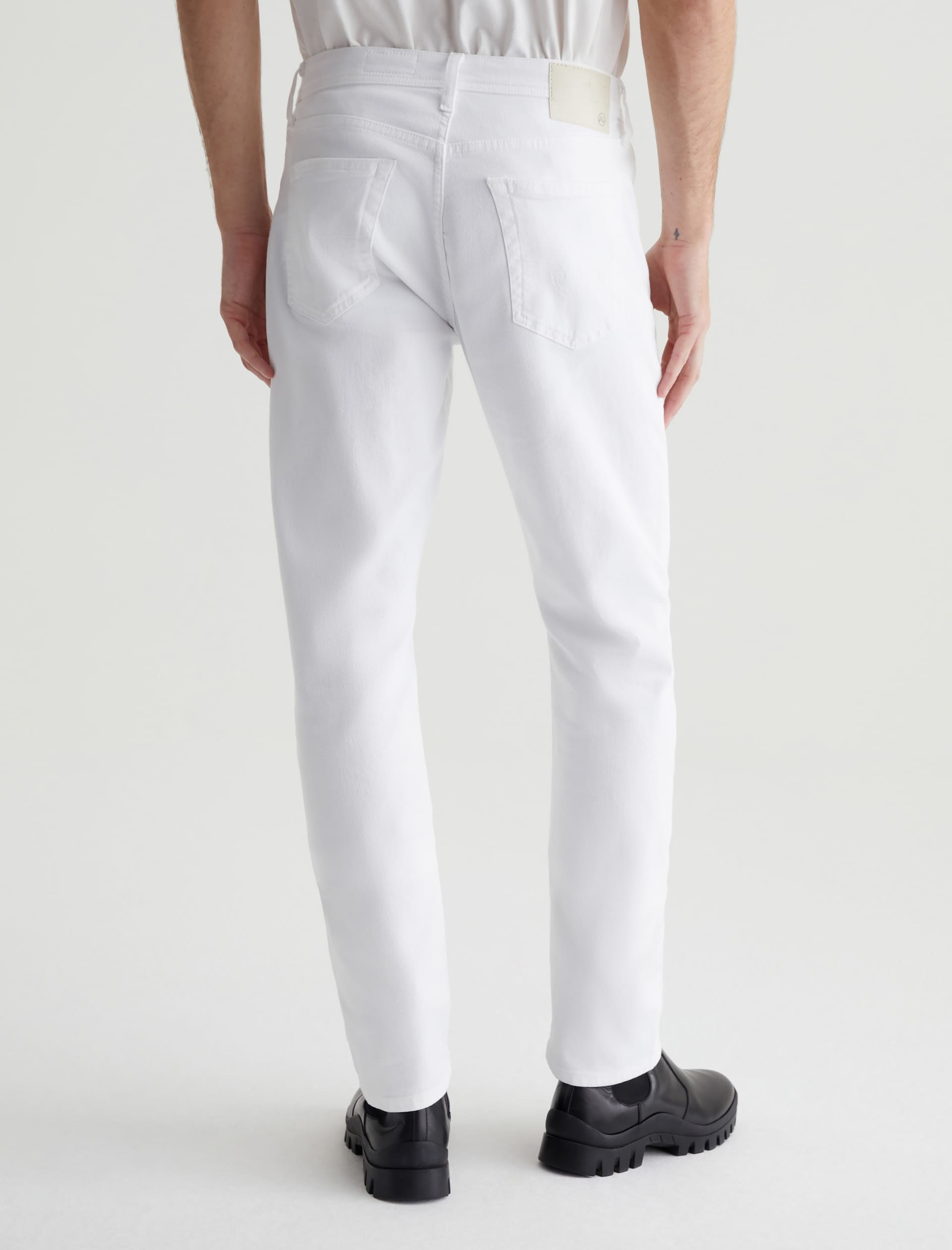 Everett is a slim straight men’s jean made from ultra-soft white denim. The style has a mid-rise waist and a straight fit that’s relaxed from hip to the knee before slightly tapering at the leg opening. These men’s slim straight jeans are designed in stretch-blend AG Cloud Soft Denim™. This special left-hand twill fabr