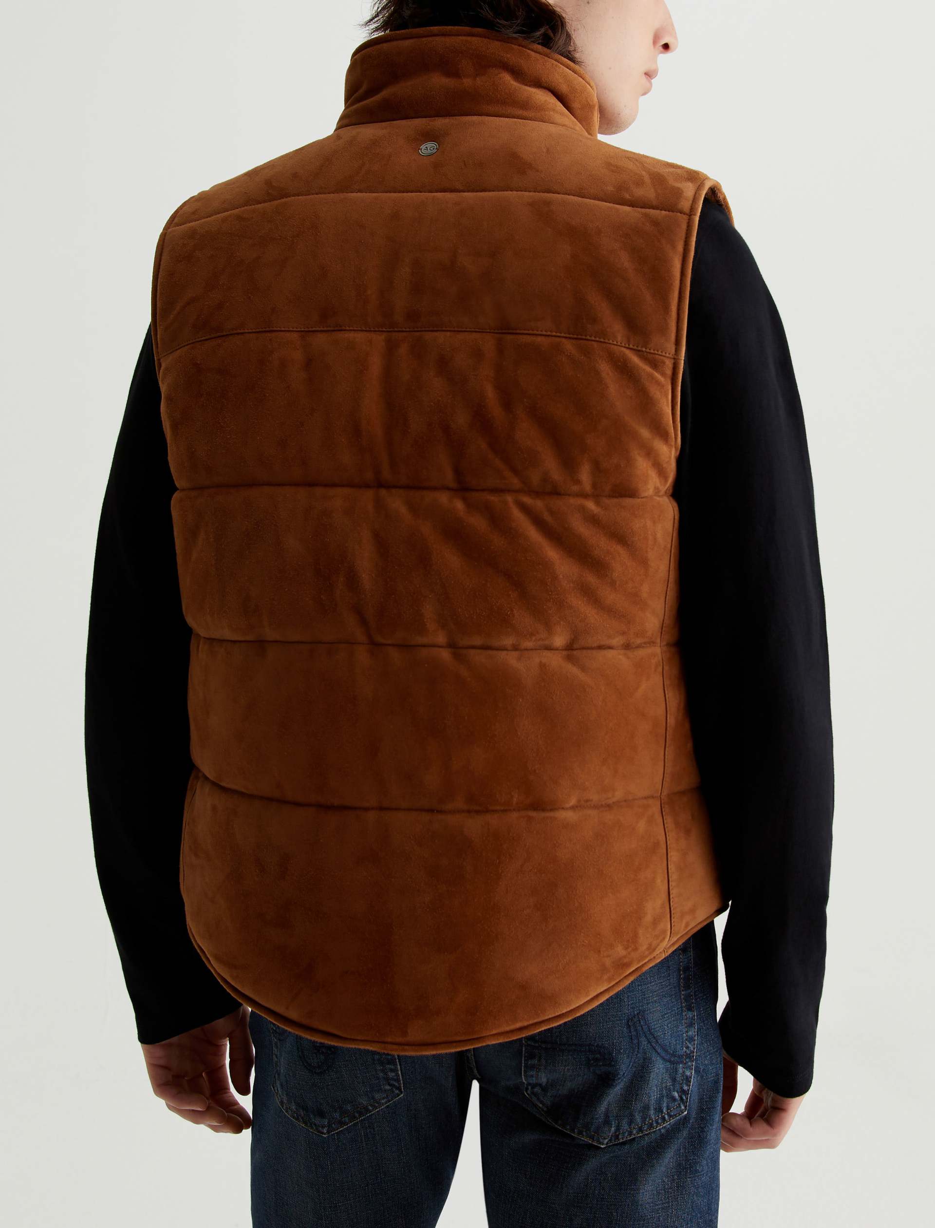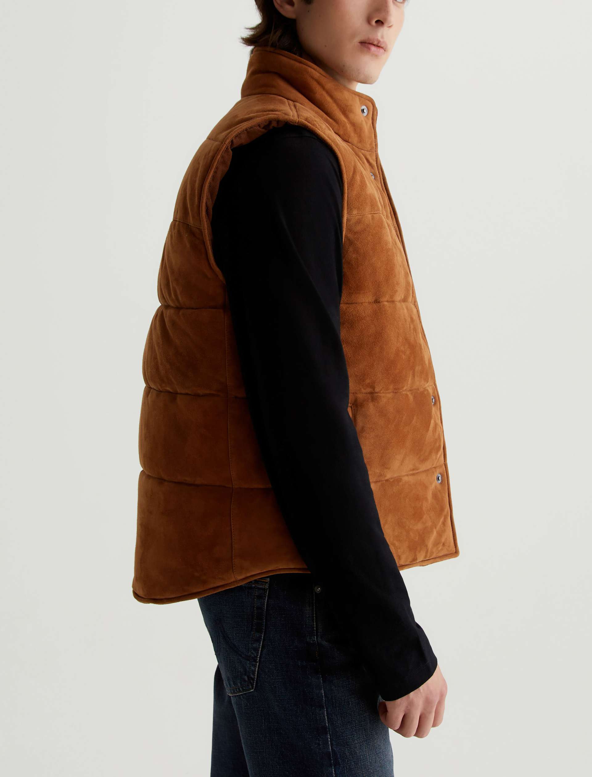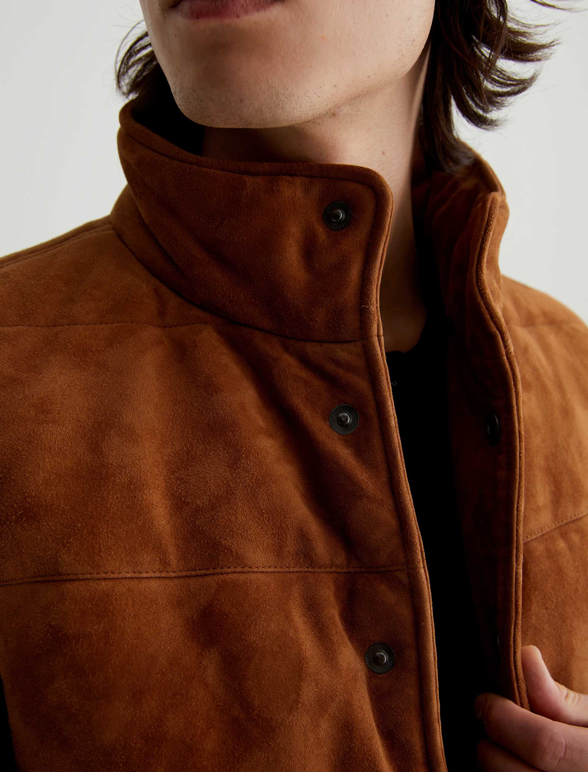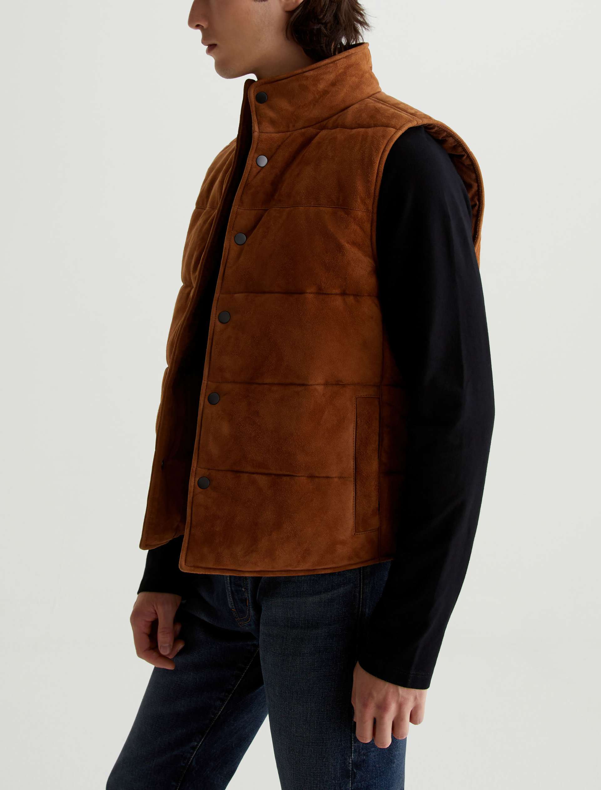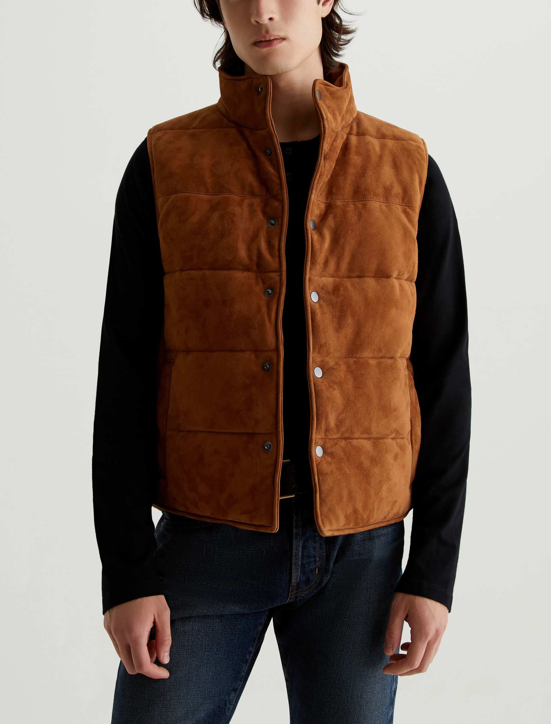 A sophisticated layer to slip on for extra warmth. The Neo Vest is crafted from supple suede in a rich cognac color. It’s got quilted construction with metal snap closures and concealed hip pockets for handy stashing.
