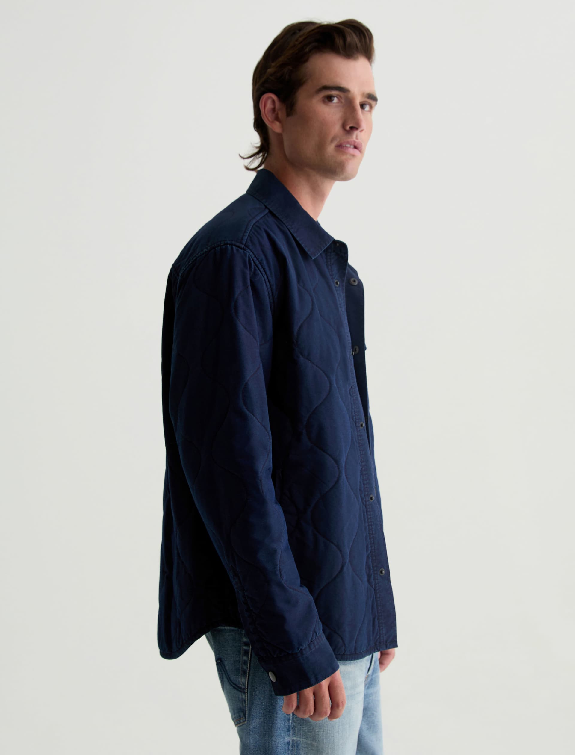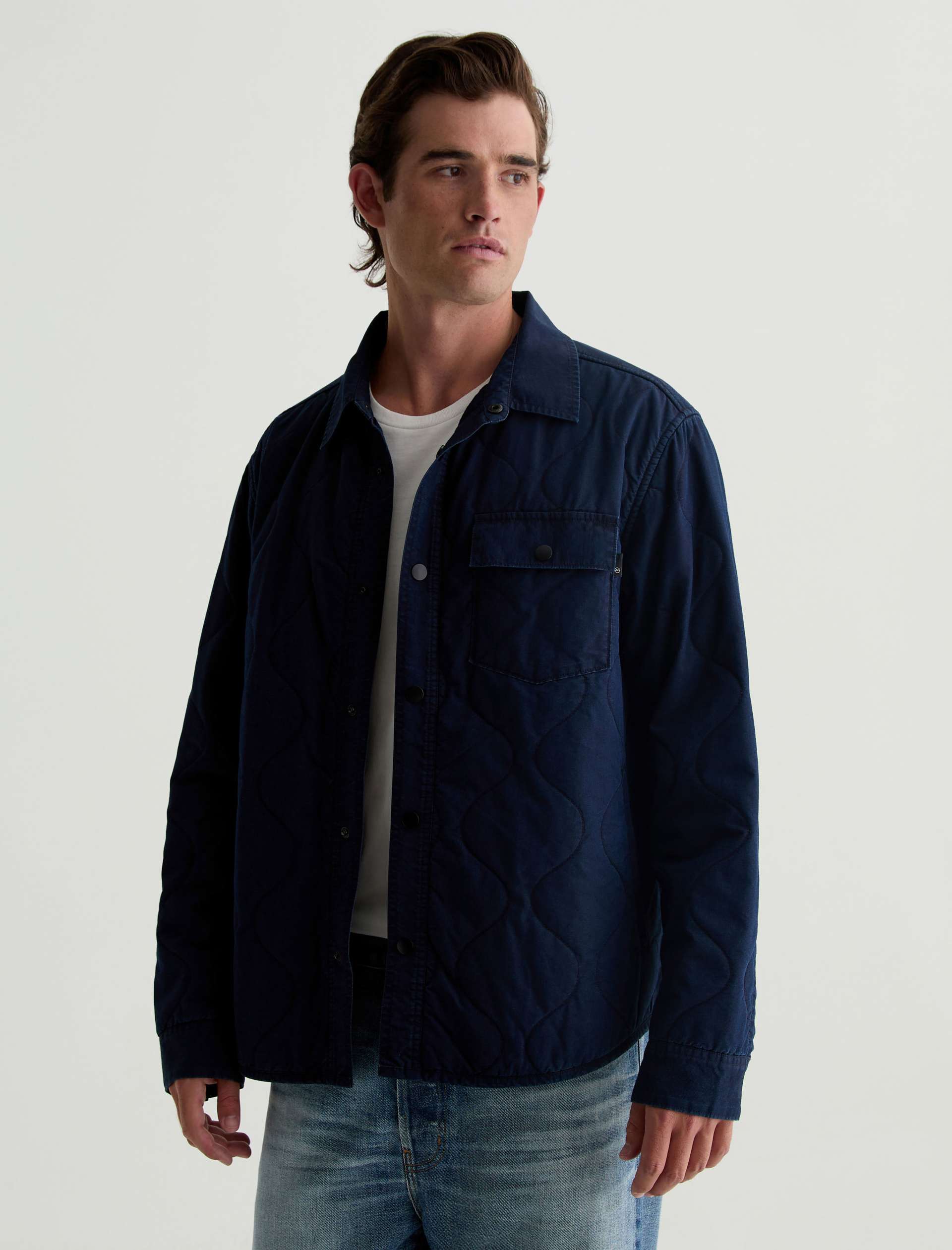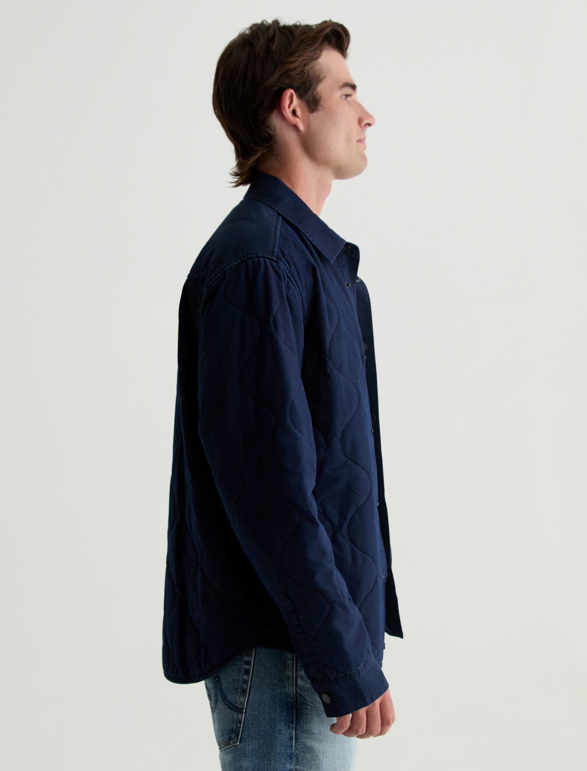 The Roy quilted shirt jacket takes a classic shirt silhouette and makes it functional for any time of year. It’s the perfect transitional layering piece in indigo cotton-nylon twill that fade and distress over time, just like your favorite jeans. Detailed with a snap placket and a flap pocket at the chest.