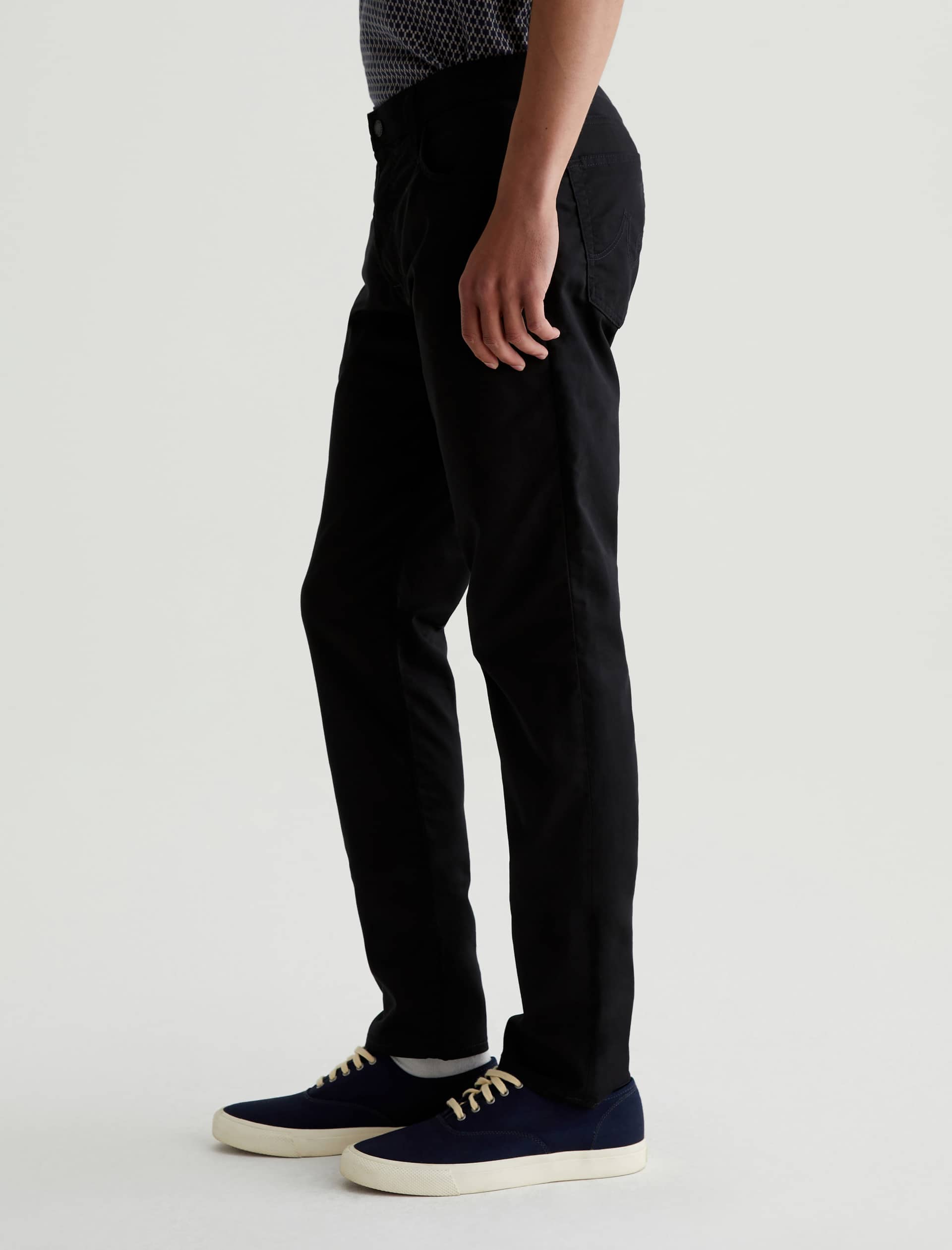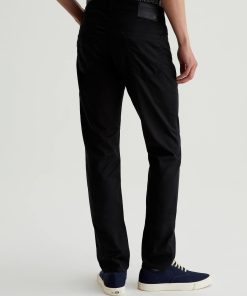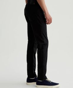 The Tellis is a modern slim fit crafted from our 5.9 oz. Airluxe™ Commuter Performance Sateen with premium stretch for enhanced mobility. Featuring a fitted upper block and tapered leg opening, this five-pocket pant comes in a versatile black shade complemented by tonal stitching and a matching shank button.