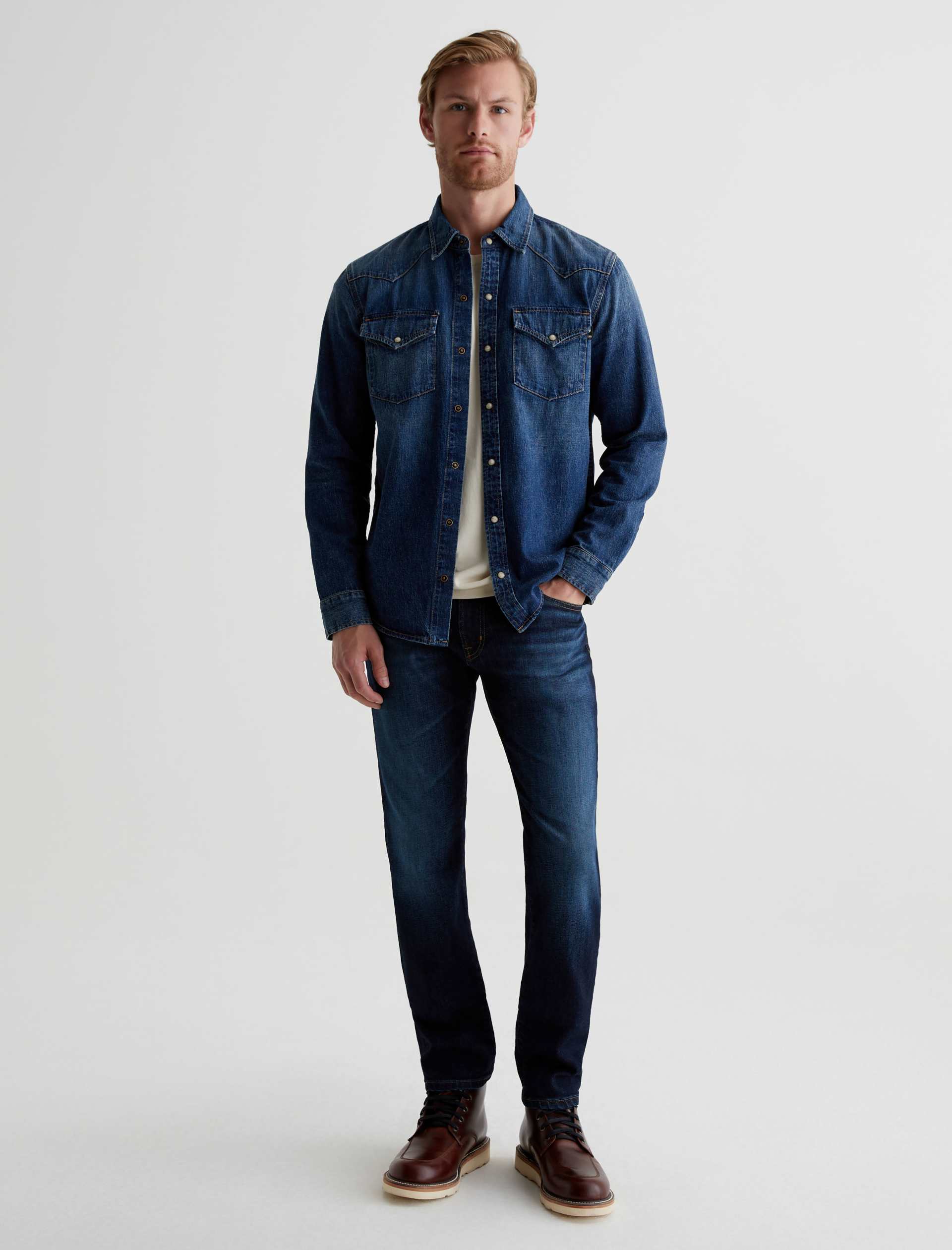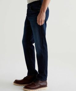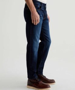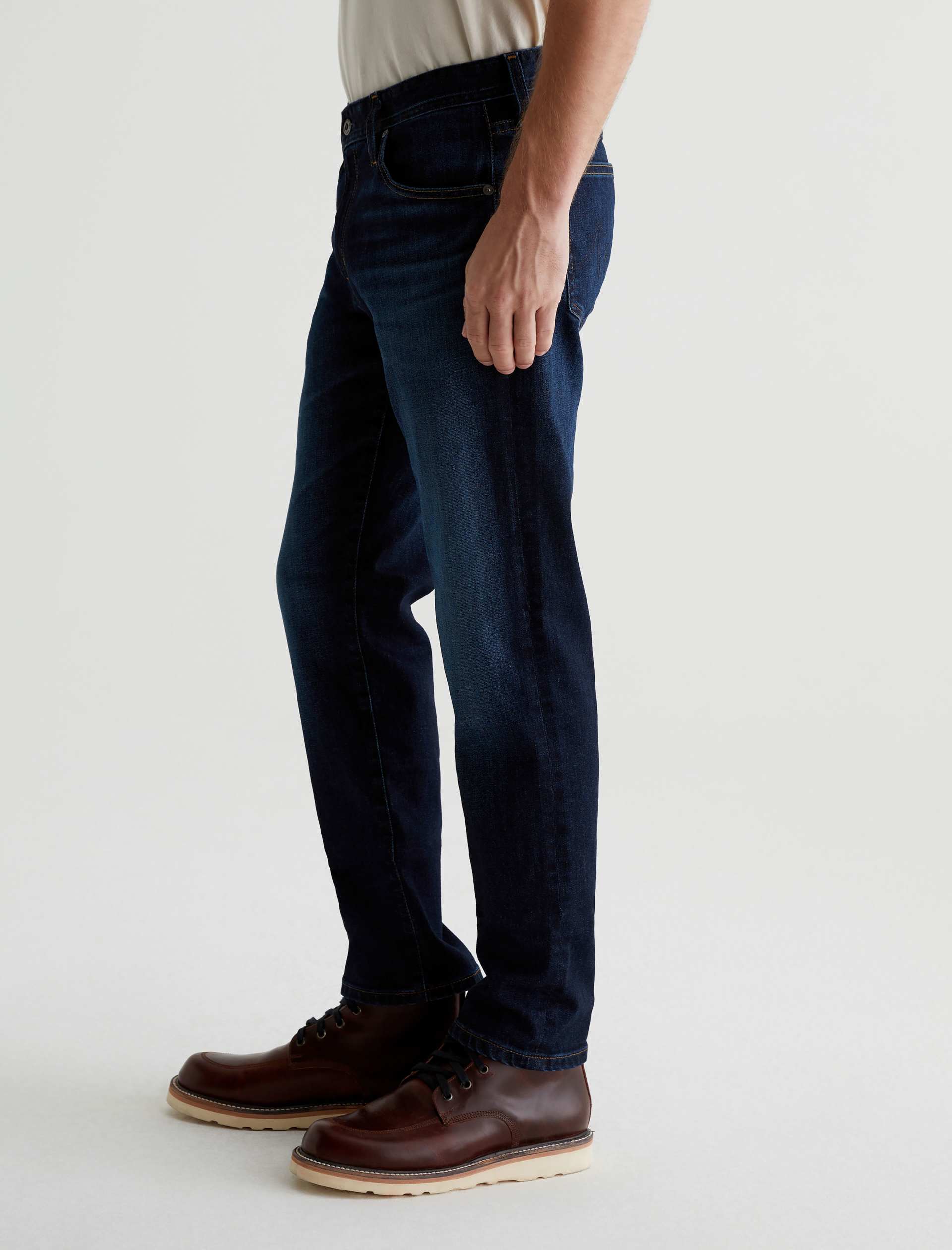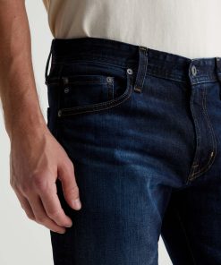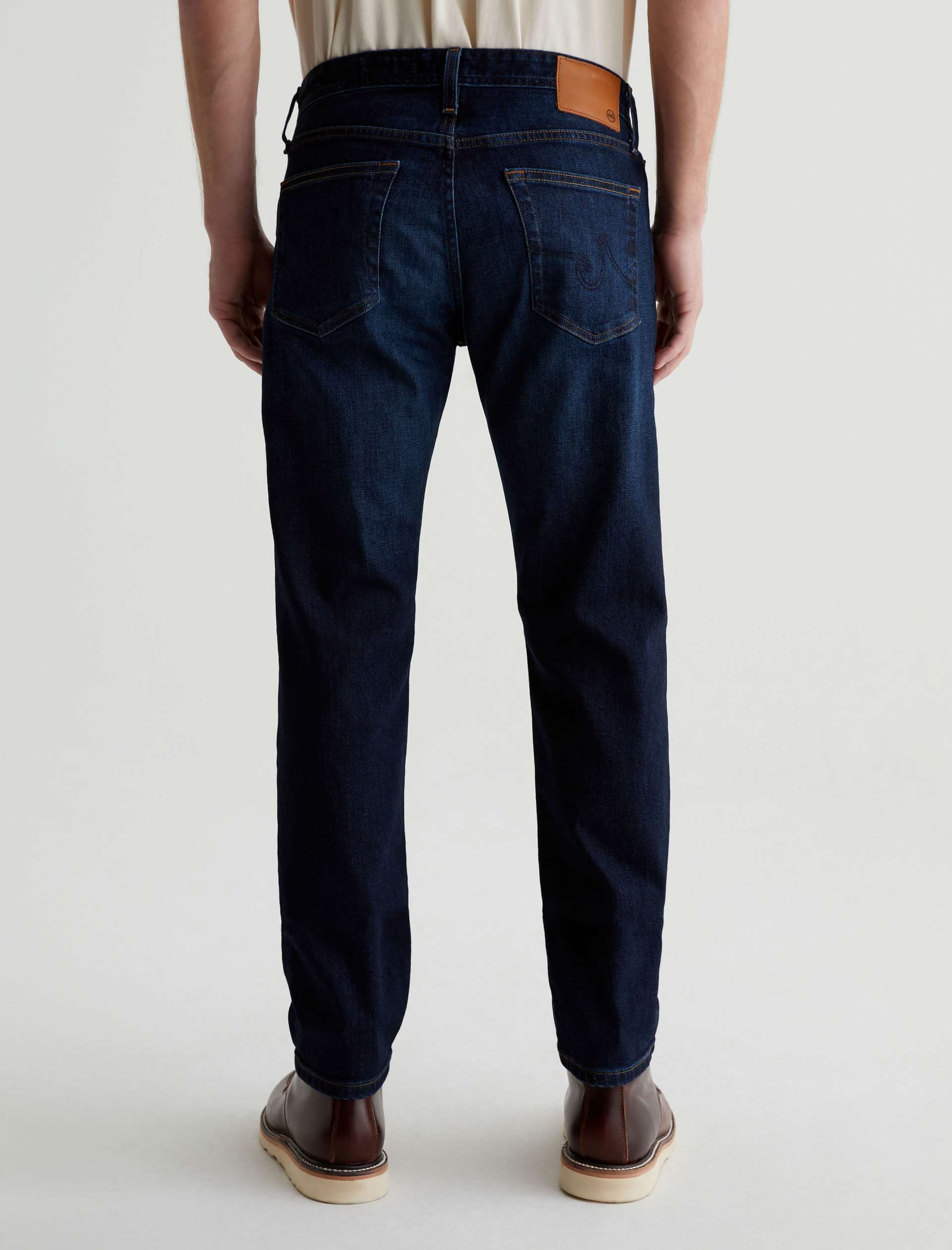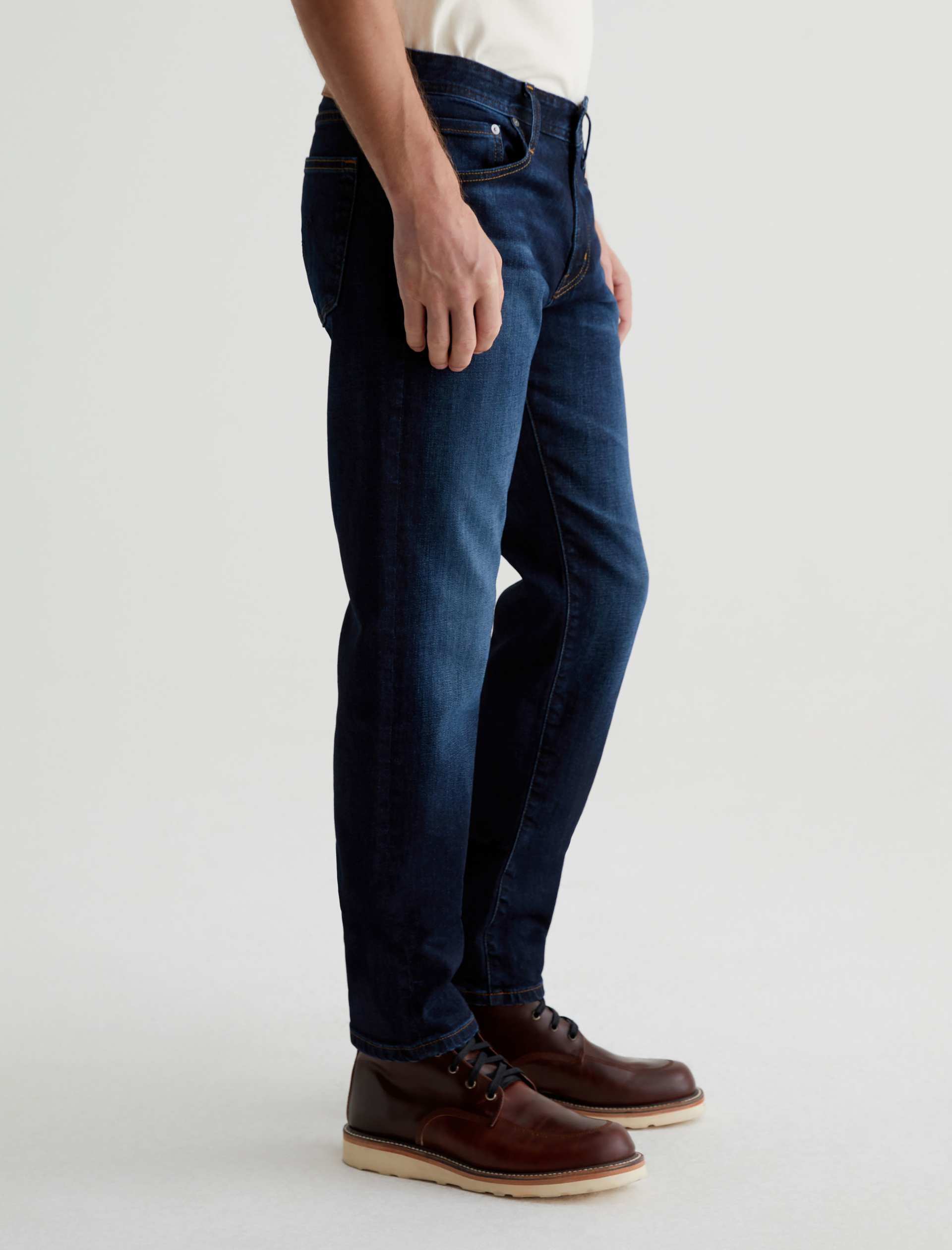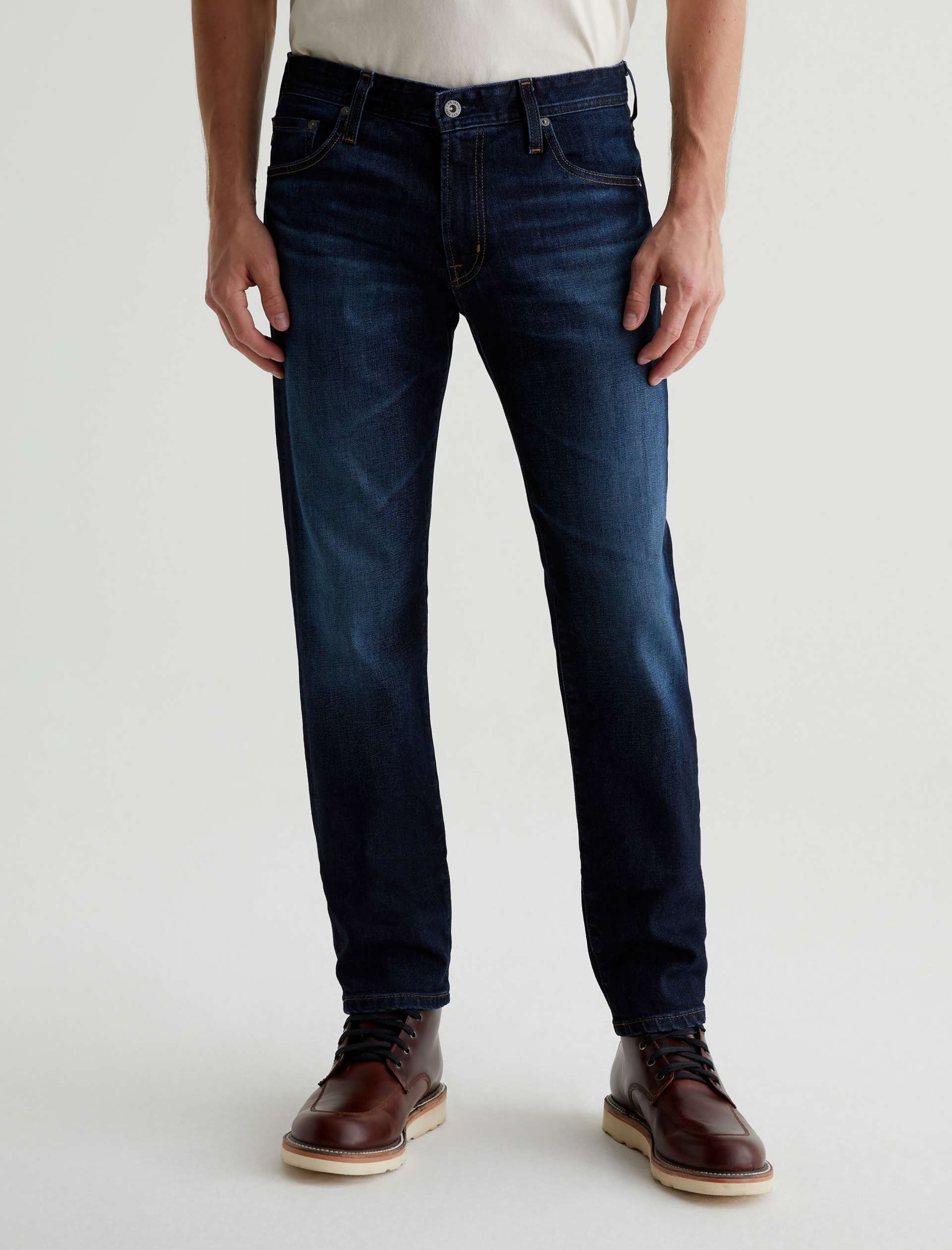 The Tellis modern slim jean for men features a classic dark indigo wash with faded details and marigold stitching. Tellis has a fitted upper block and tapered leg opening. These five-pocket men’s jeans are designed in 11.75 oz. Union Dark Denim with comfort stretch.
