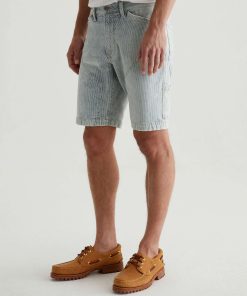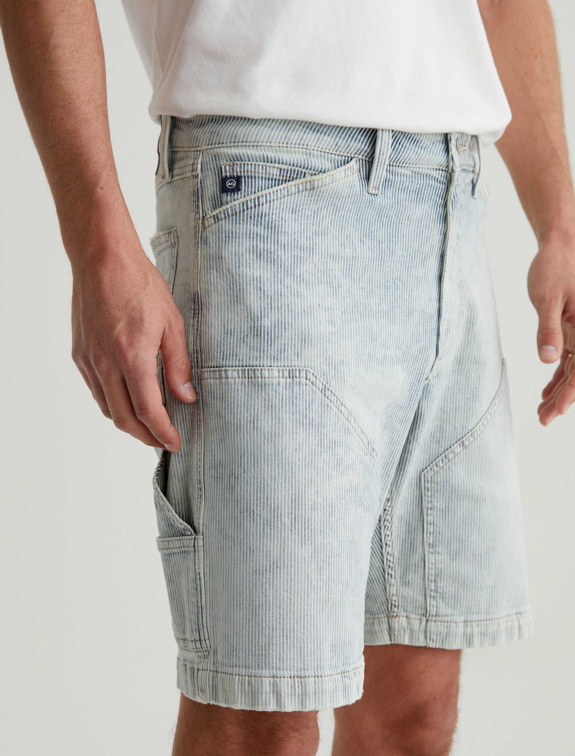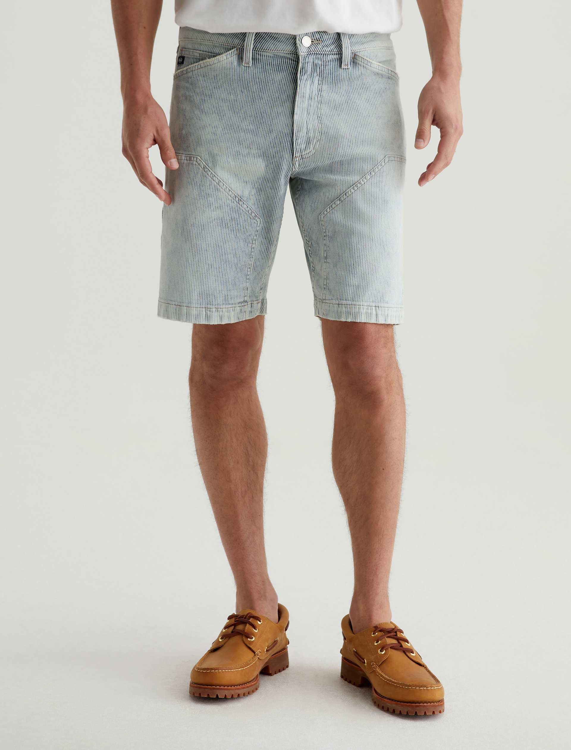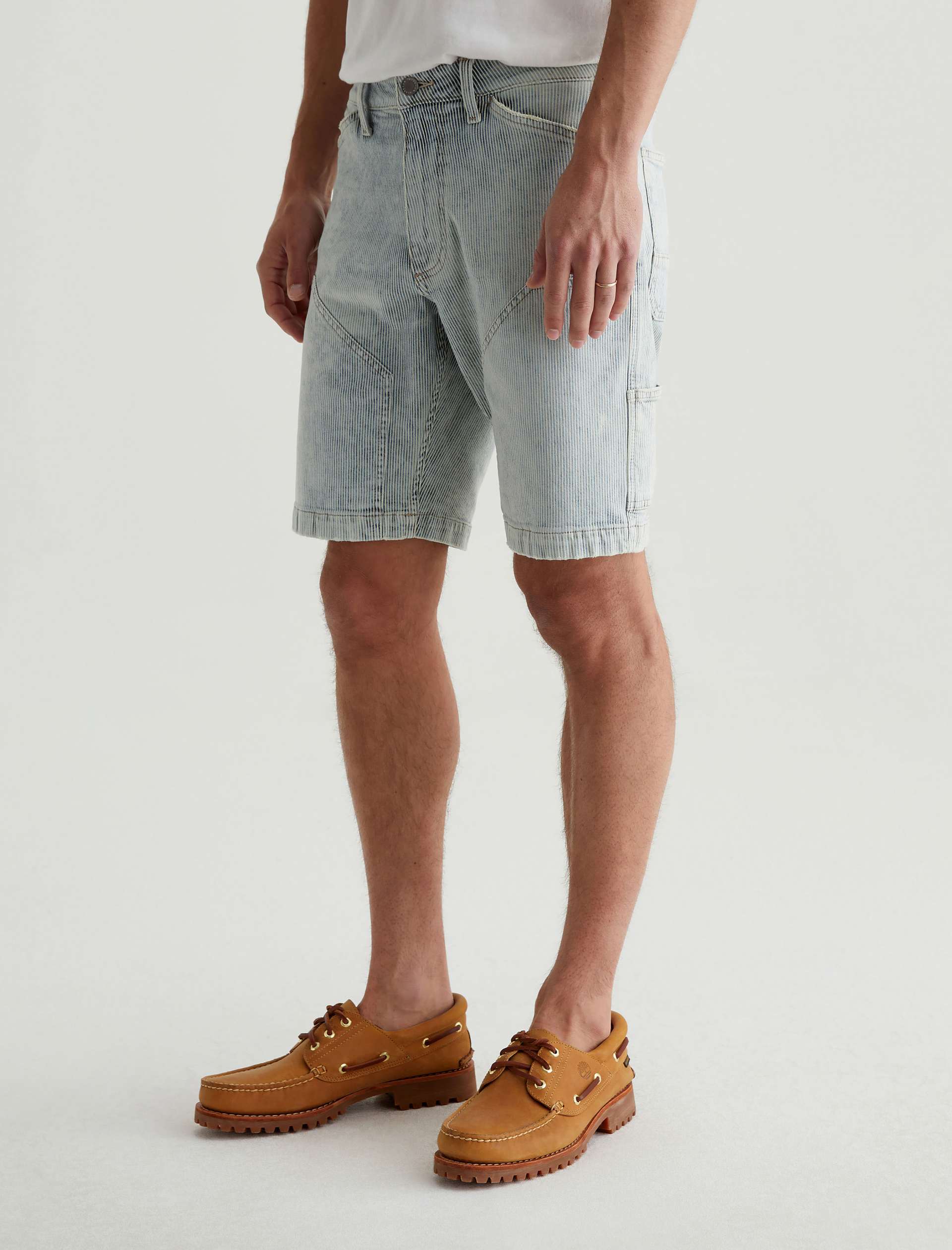 Our Wells Carpenter Short has a coastal workwear aesthetic in sun-bleached indigo stripes with a subtle vintage tint. Cut from lightweight stretch-blend cotton, these men’s shorts offer a relaxed fit with paneled legs and a dual tool pocket.