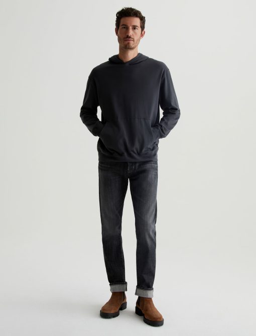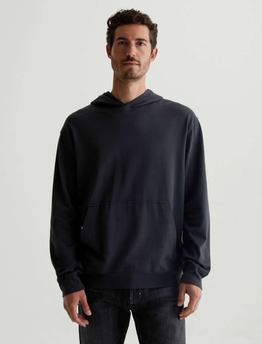The Wesley Hoodie in dark grey is a lightweight jersey sweatshirt complete with a front kangaroo pocket and a hoodie that is double layered for shape and structure. Our Jersey Knit offers a luxurious comfort that is unrivaled—knitted with both S-twist and Z-twist yarn to sustain longevity and stability, preventing unne