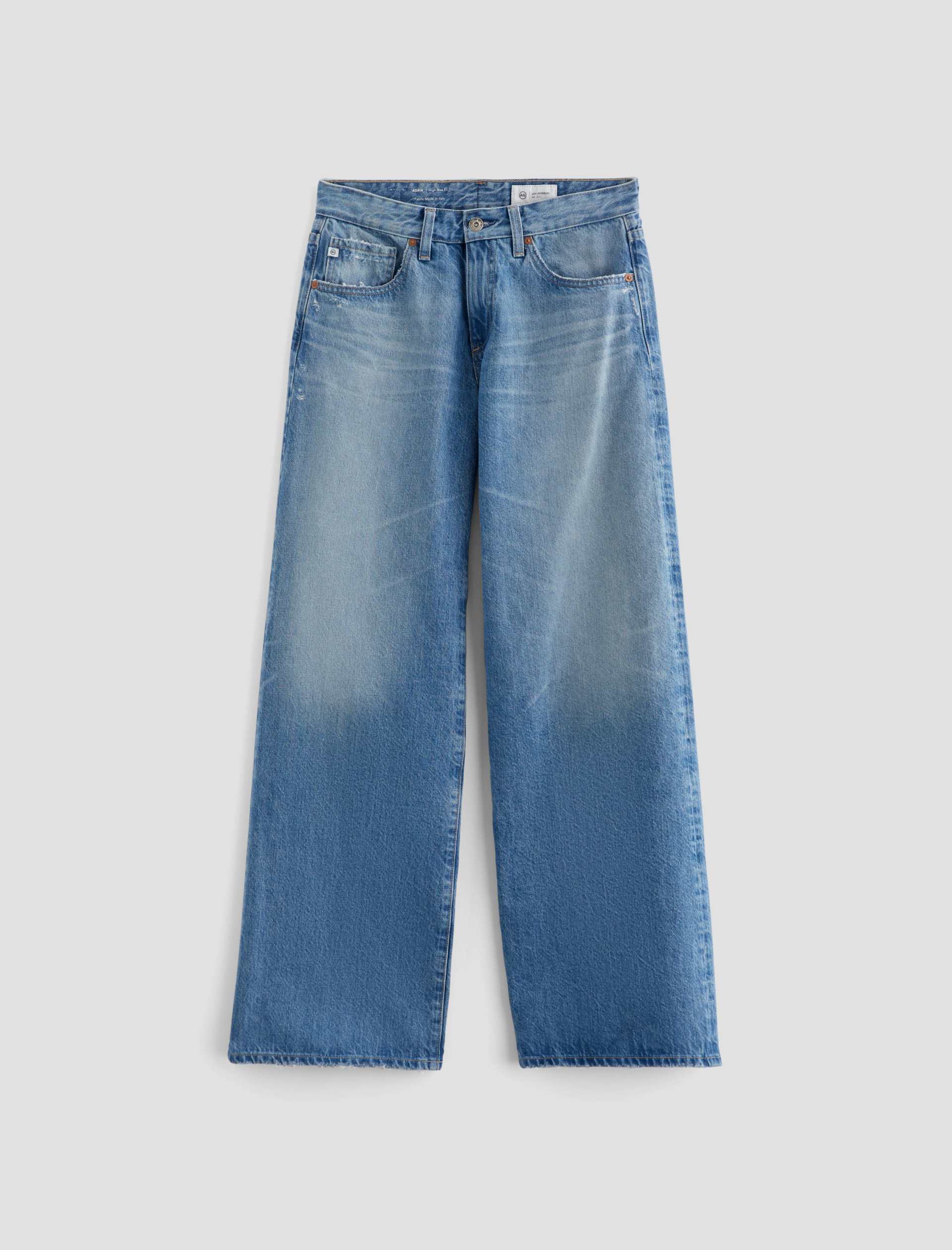 Adria is our new low-rise wide-leg jean that hangs low on the hips for a relaxed, slouchy look. These five-pocket jeans fit loose and wide through the legs, designed to puddle at the hems. Made from 13 oz. Sioux Rigid Denim in 100% cotton, the pair here features a medium indigo wash with fading, subtle whiskering, and
