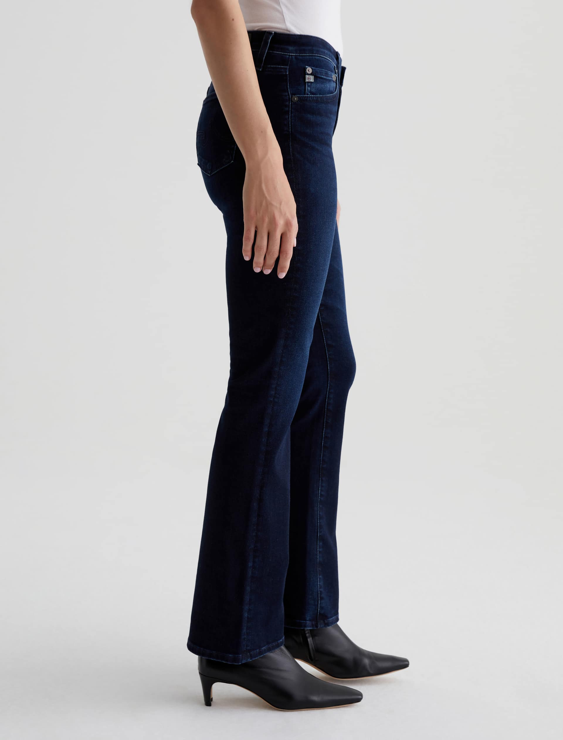 The Angel low-rise bootcut jeans fit close to the body before opening to subtly flared hems. Designed in 10 oz. Empower Denim from Japan, this pair has shape-hugging stretch and premium recovery. It comes in a dark indigo wash featuring a 3-year AG-ed™ fade with subtle fading and whiskering.