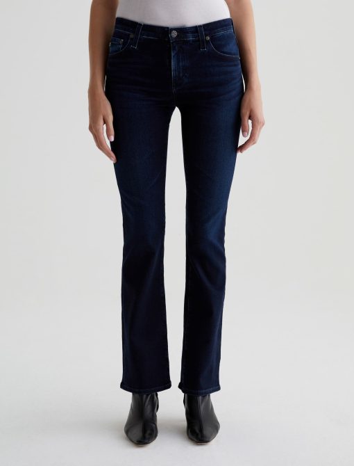 The Angel low-rise bootcut jeans fit close to the body before opening to subtly flared hems. Designed in 10 oz. Empower Denim from Japan, this pair has shape-hugging stretch and premium recovery. It comes in a dark indigo wash featuring a 3-year AG-ed™ fade with subtle fading and whiskering.