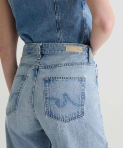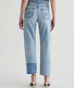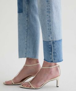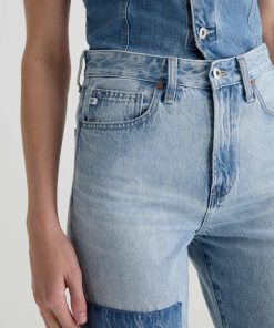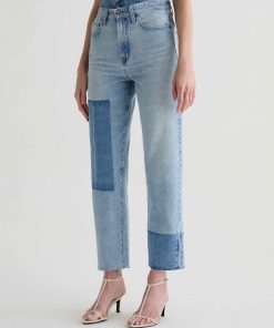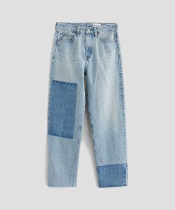 Brinley Patchwork is a mid-rise straight jean crafted from Italian non-stretch denim in a light wash. It features patchwork detailing in a contrasting denim shade on both legs, frayed hems, and an ankle-grazing length for a laid-back finish.
