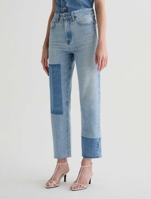 Brinley Patchwork is a mid-rise straight jean crafted from Italian non-stretch denim in a light wash. It features patchwork detailing in a contrasting denim shade on both legs, frayed hems, and an ankle-grazing length for a laid-back finish.