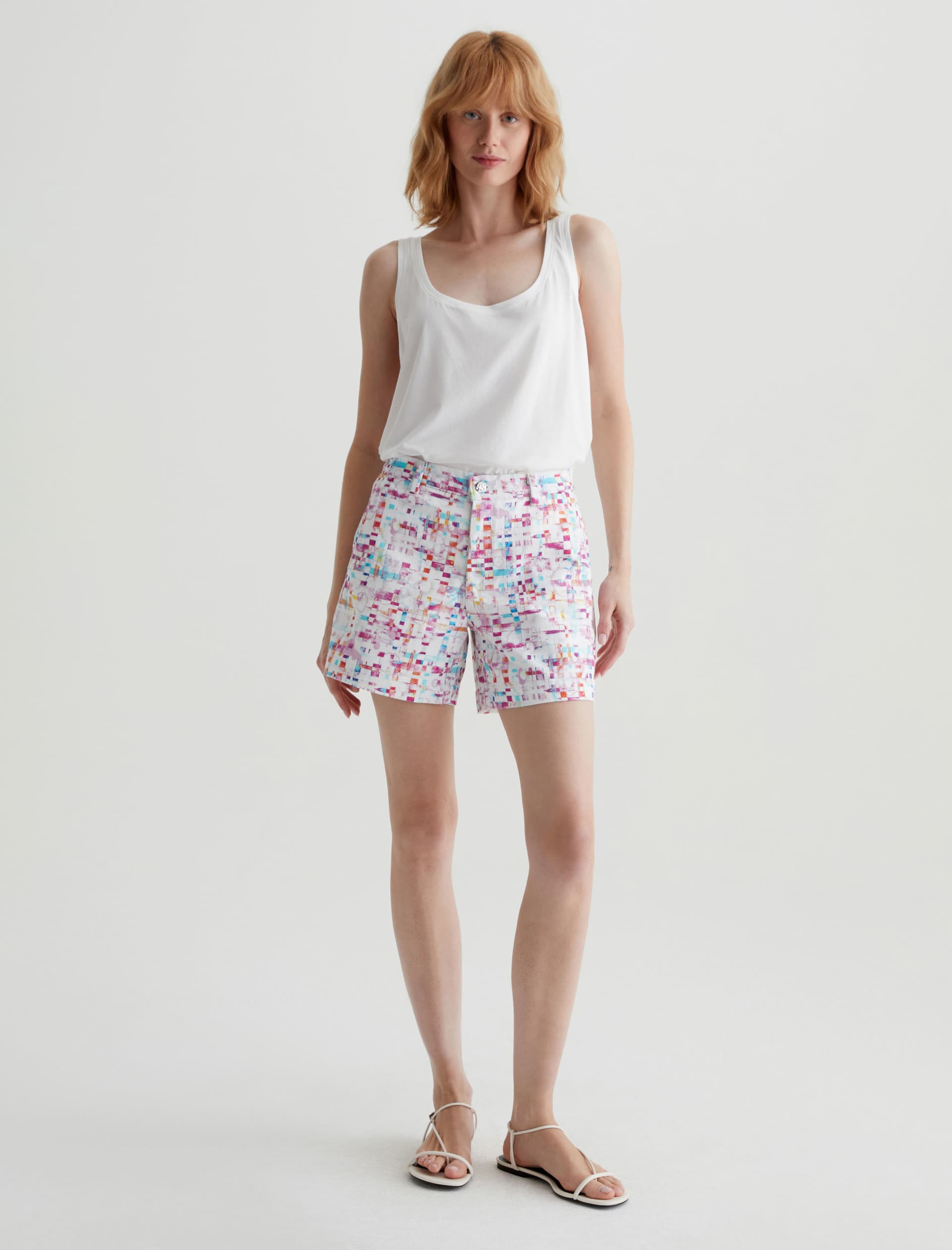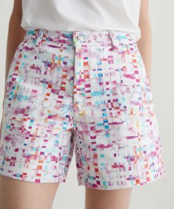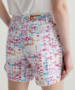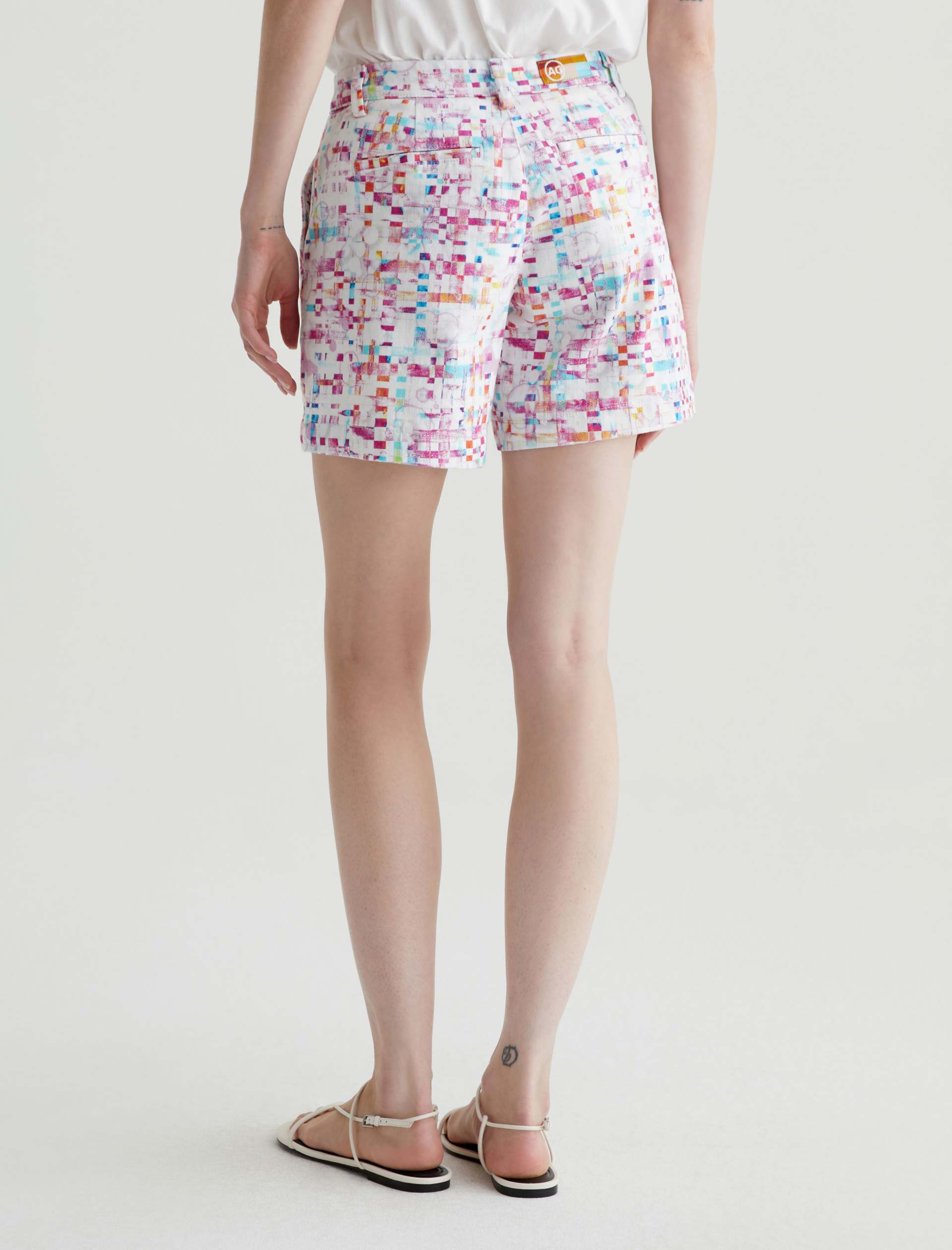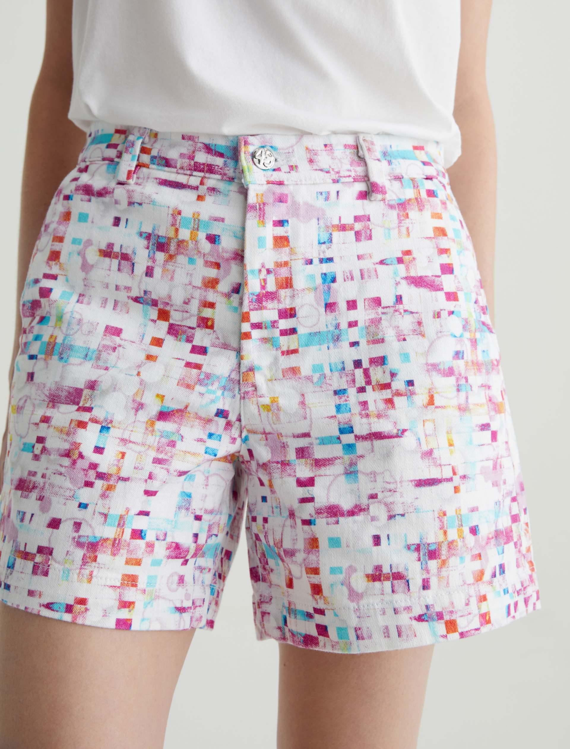Our Caden tailored shorts for women in a vibrant check motif. These women’s shorts have a relaxed fit through the hips and slight tapering at the thighs. Crafted from comfortable Dover Stretch Denim, this pair are designed with slant front pockets and welt pockets at the back. About the Art Project print: Bright colors