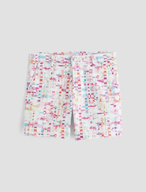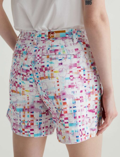 Our Caden tailored shorts for women in a vibrant check motif. These women’s shorts have a relaxed fit through the hips and slight tapering at the thighs. Crafted from comfortable Dover Stretch Denim, this pair are designed with slant front pockets and welt pockets at the back. About the Art Project print: Bright colors
