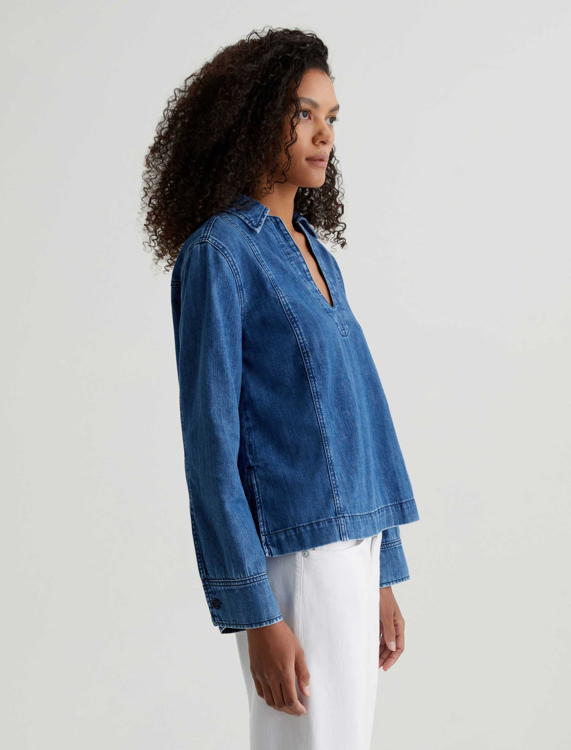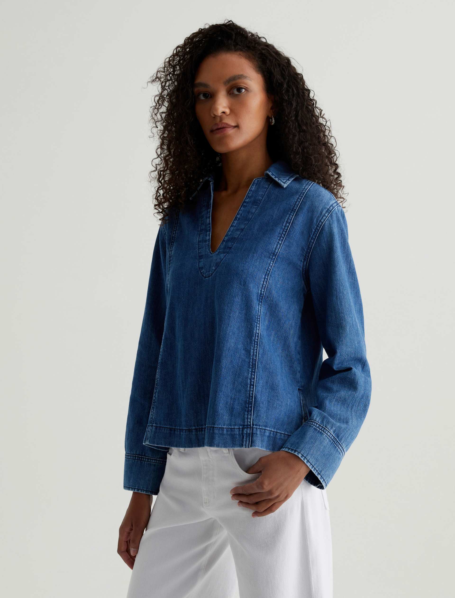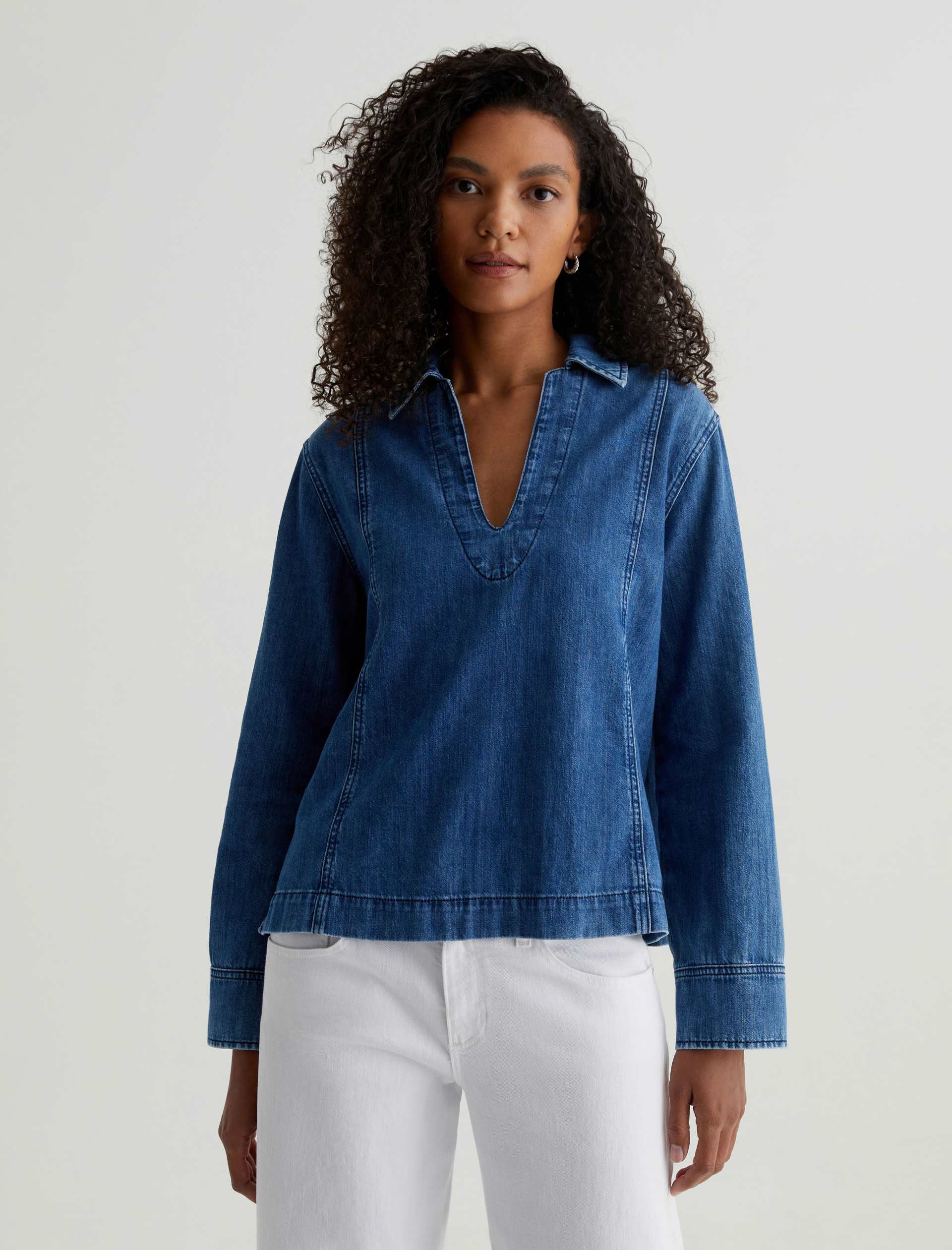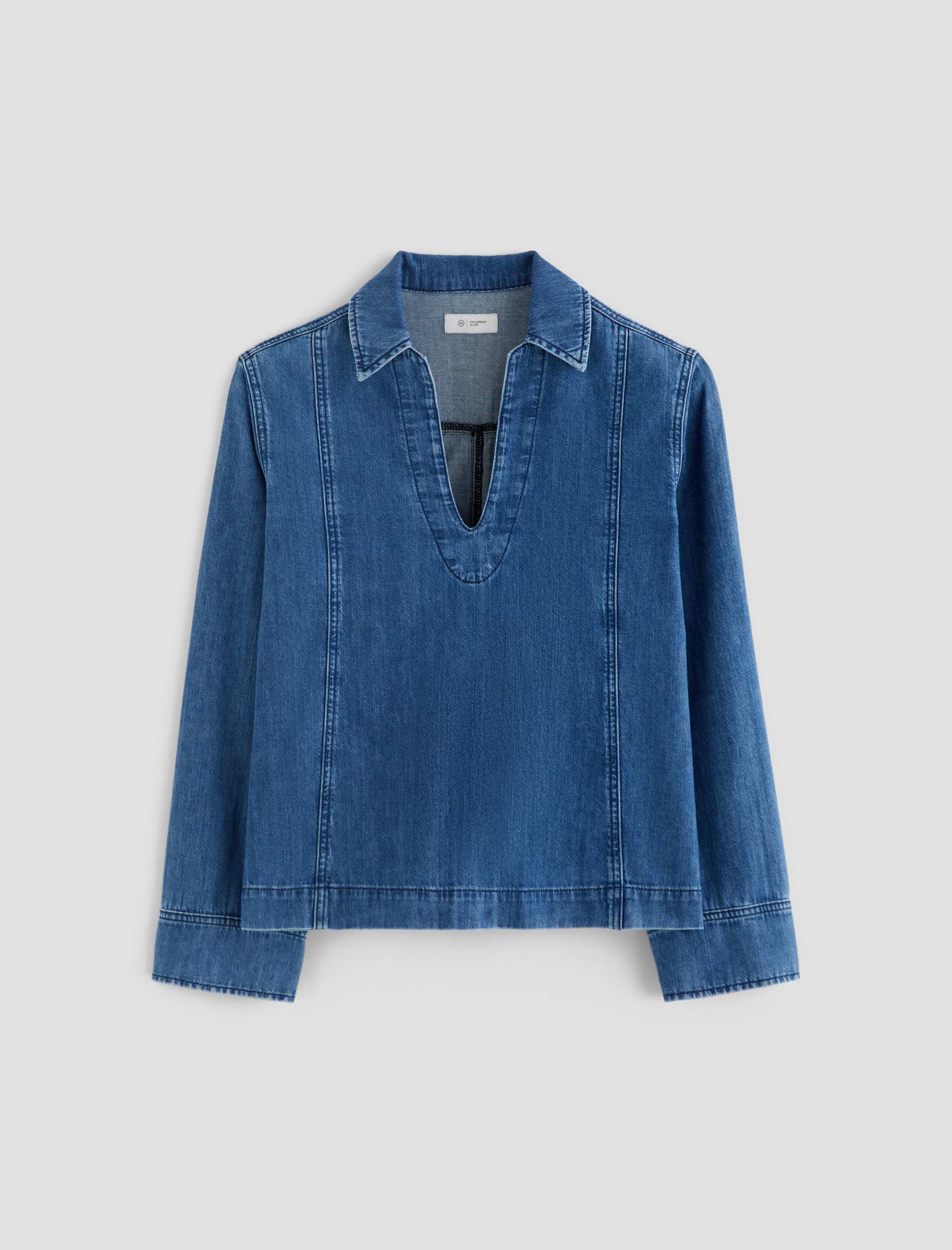 Our Chantal pullover has a relaxed, easy fit in broken-twill denim shirting. Washed to a classic blue shade, the paneled style has a deep V-shaped neckline, exaggerated collar, and long, loose-fitting sleeves with single-button cuffs.