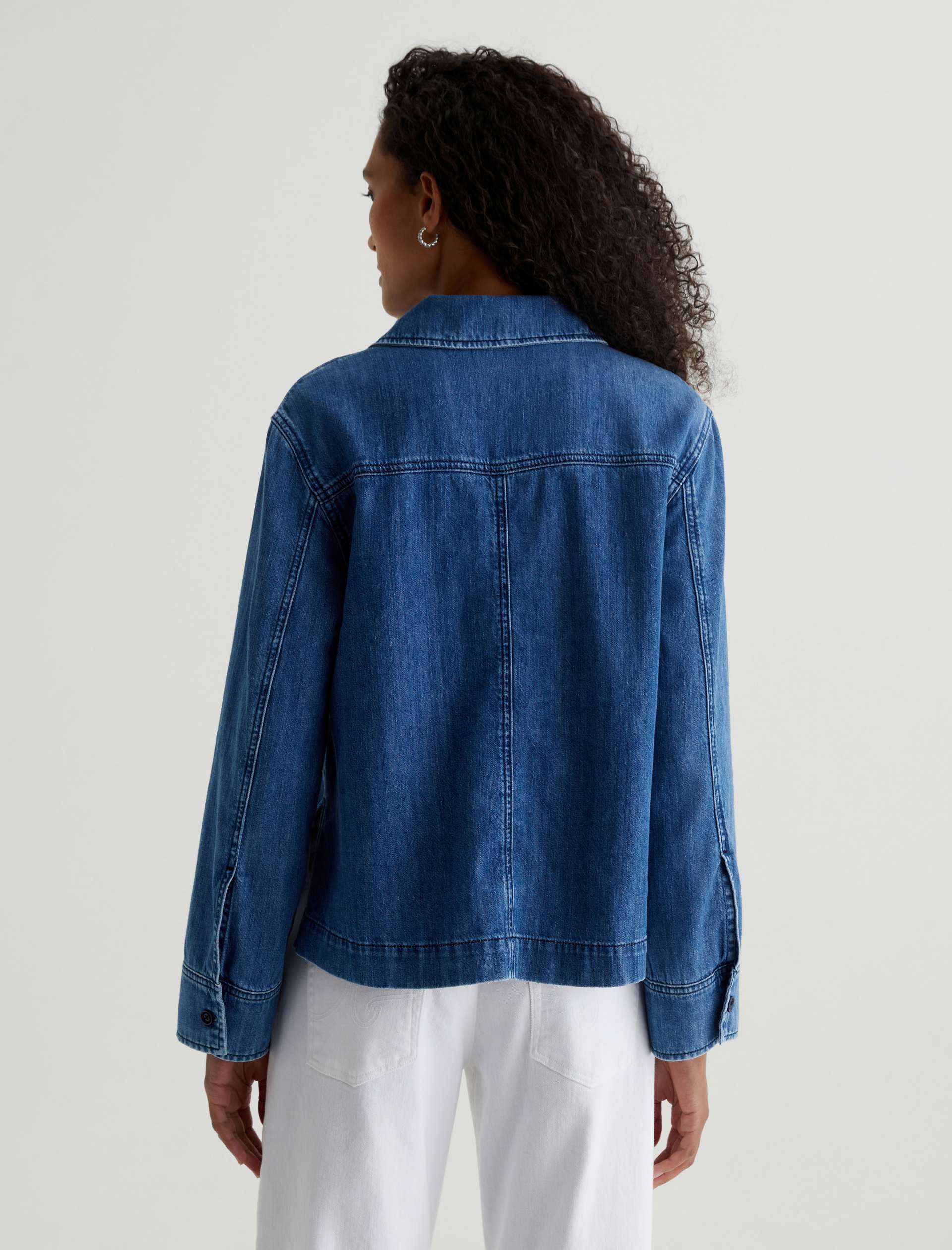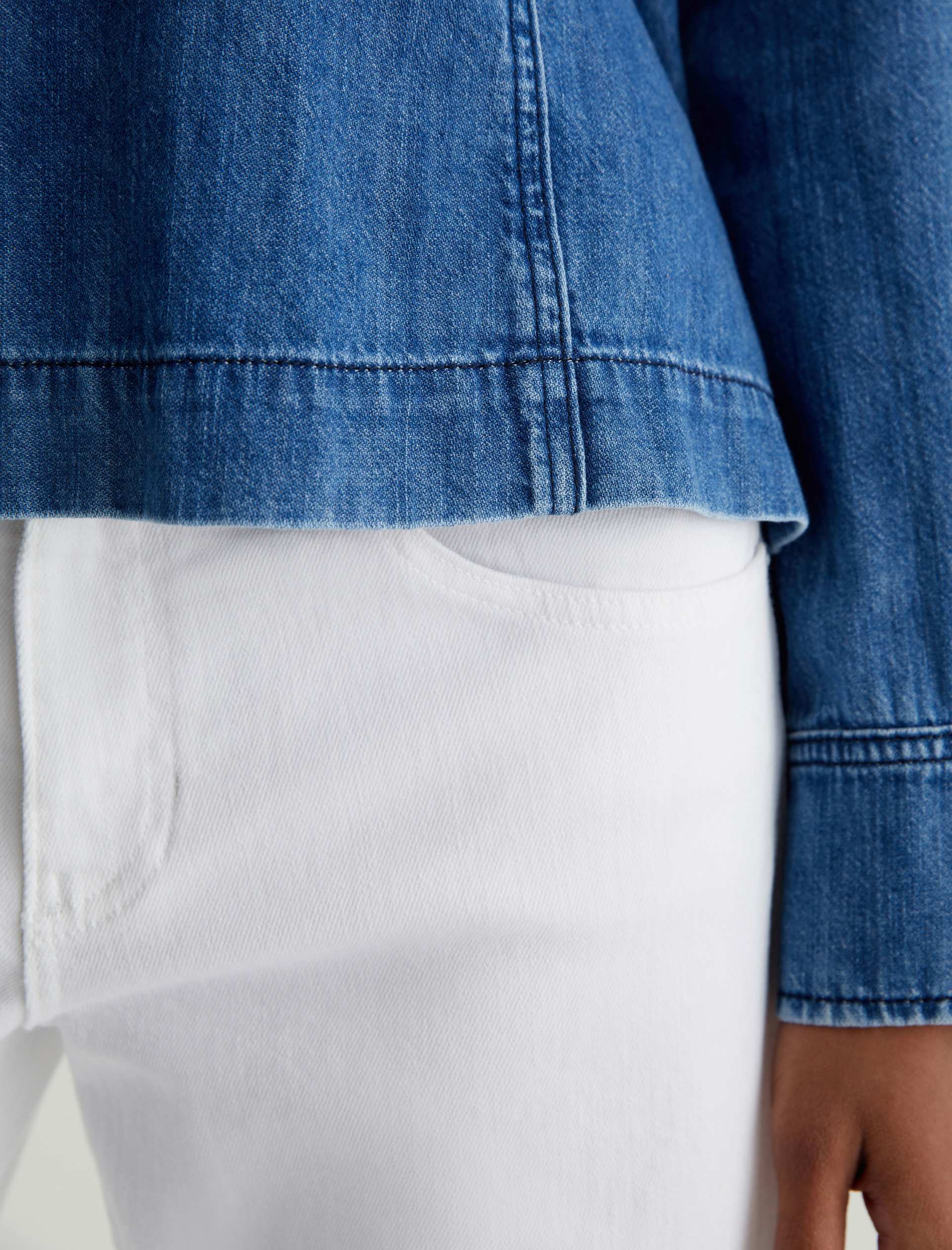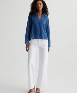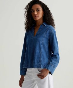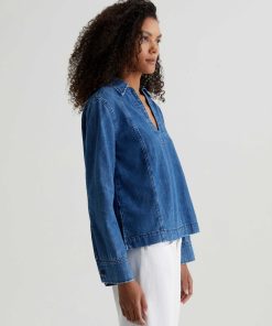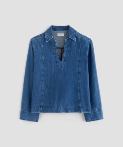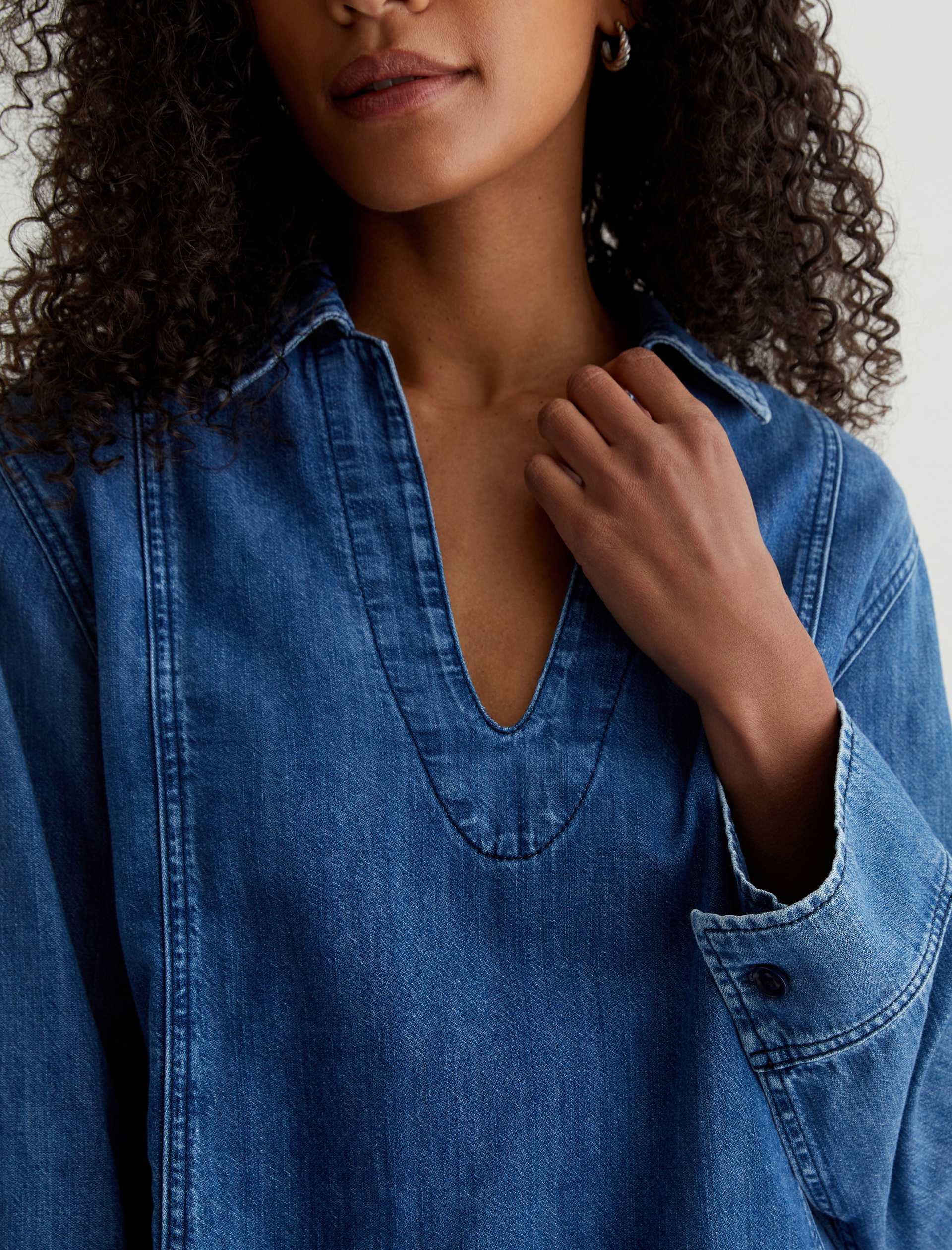 Our Chantal pullover has a relaxed, easy fit in broken-twill denim shirting. Washed to a classic blue shade, the paneled style has a deep V-shaped neckline, exaggerated collar, and long, loose-fitting sleeves with single-button cuffs.