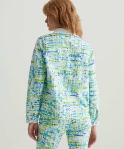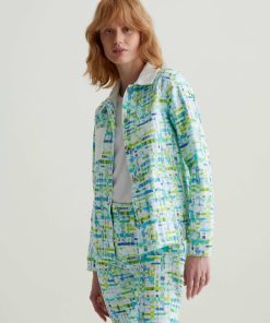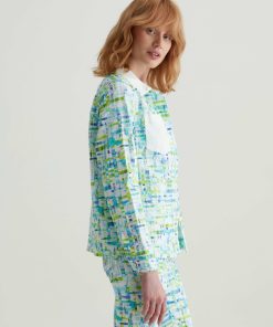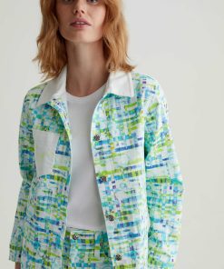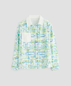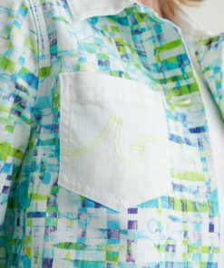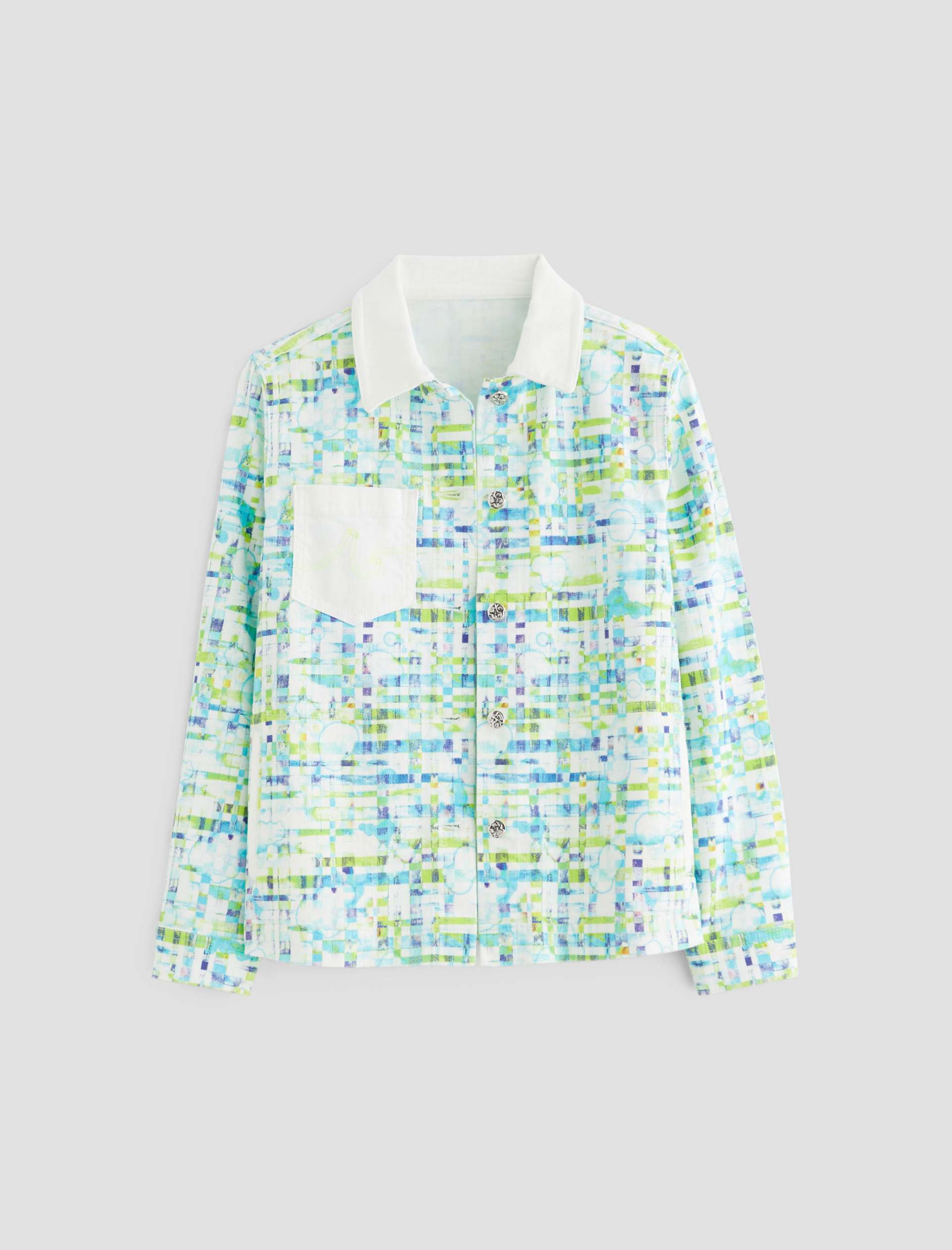 An easy option for brightening your layers, the Chiro Jacket combines the artistry of watercolor with workwear-inspired design elements. This boxy shirt jacket is cut from printed stretch denim and contrasted by a white collar and chest pocket with neon accent stitching. It’s complete with roomy hip pockets and embosse