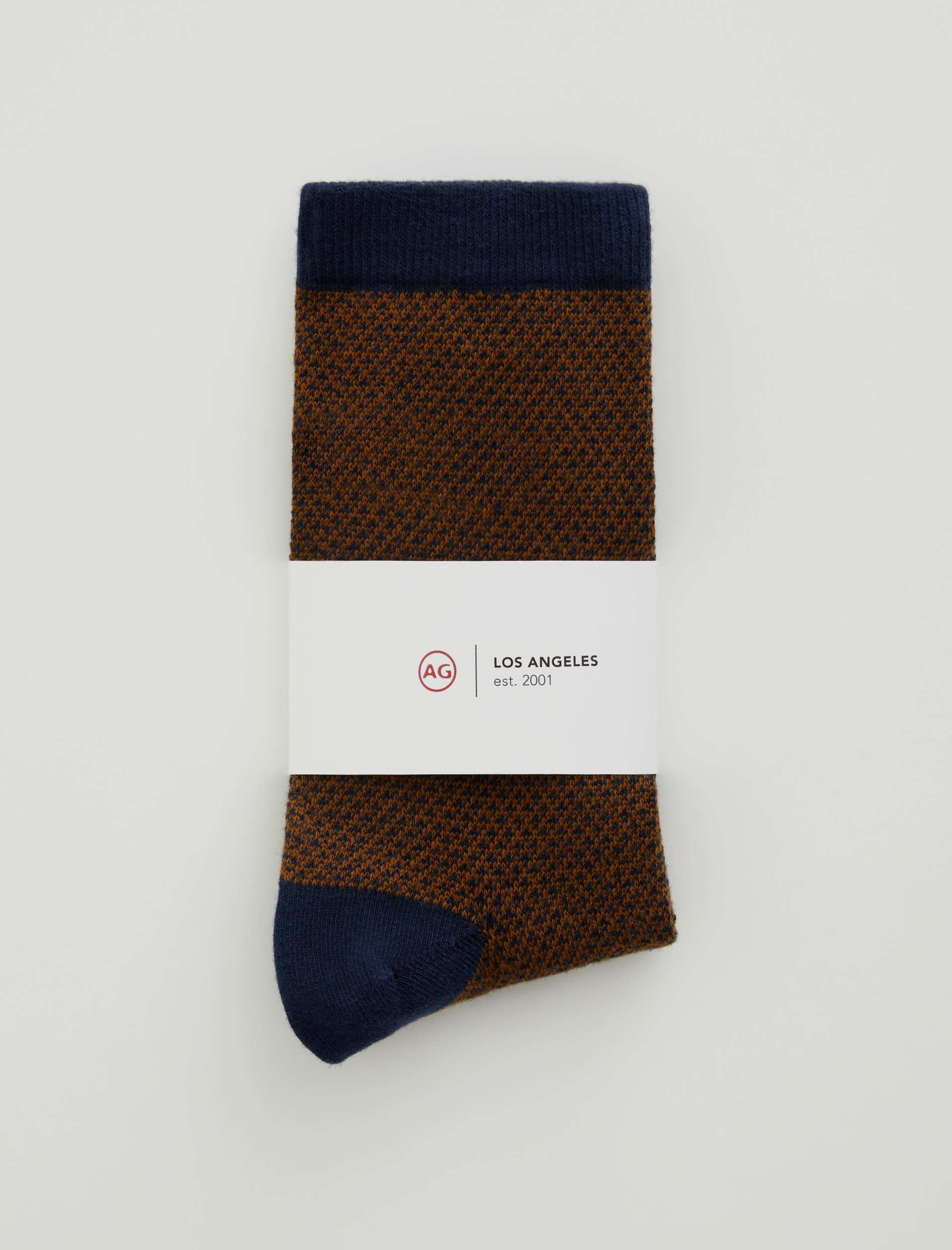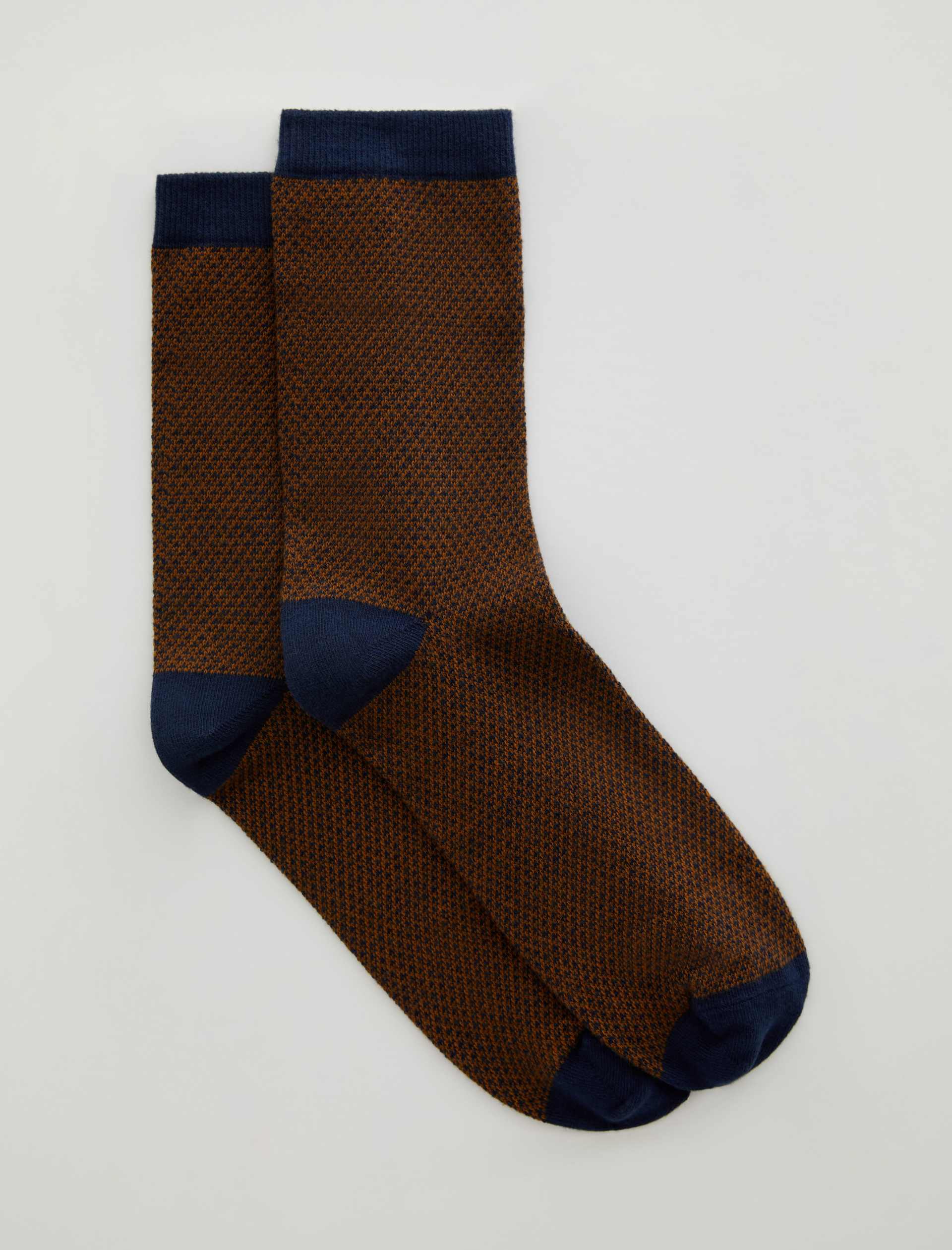 This sock is our classic crew sock. Featuring a check pattern, this pair has been knitted from a comfortable cotton blend and ribbed through the ankles.