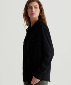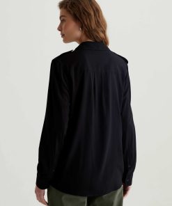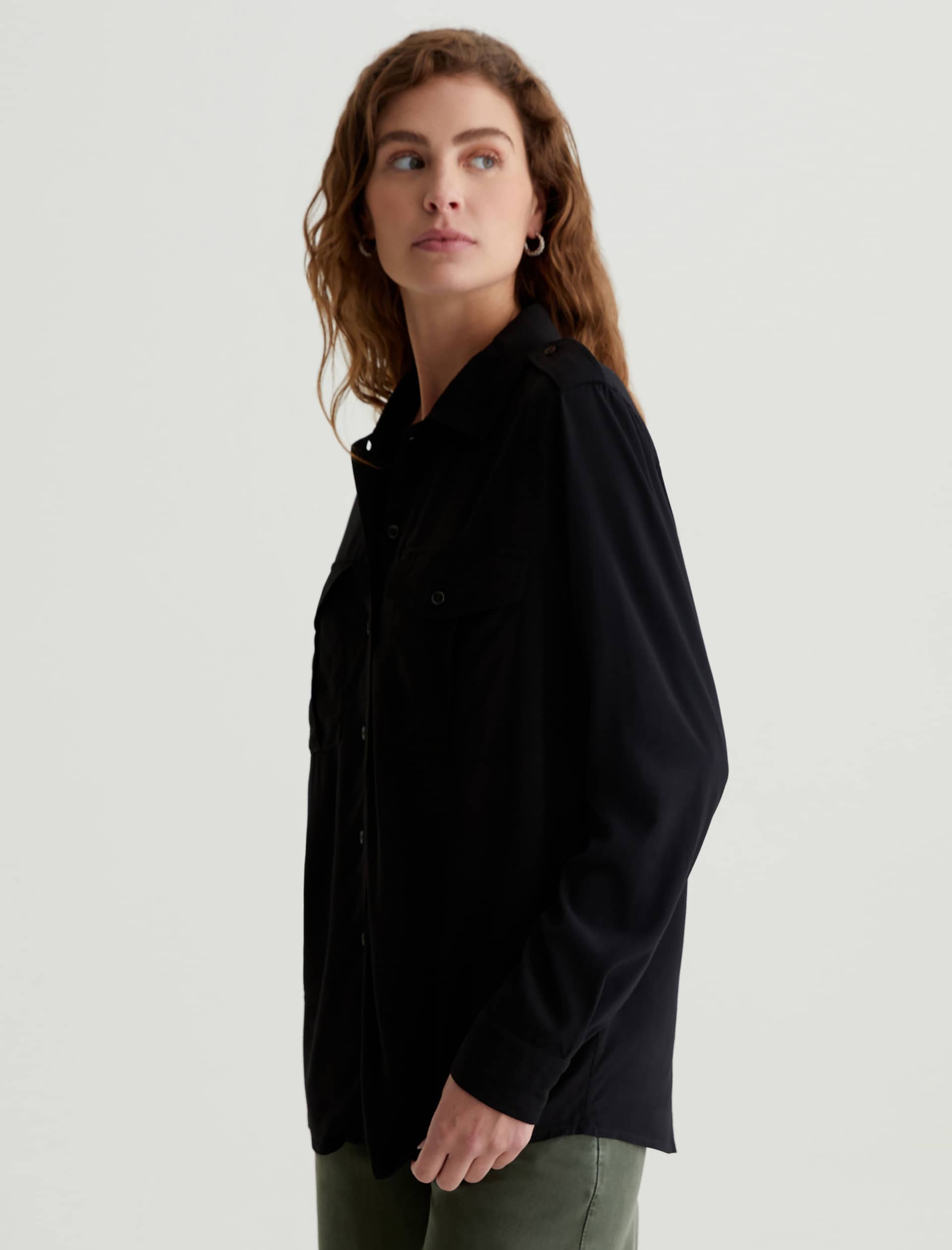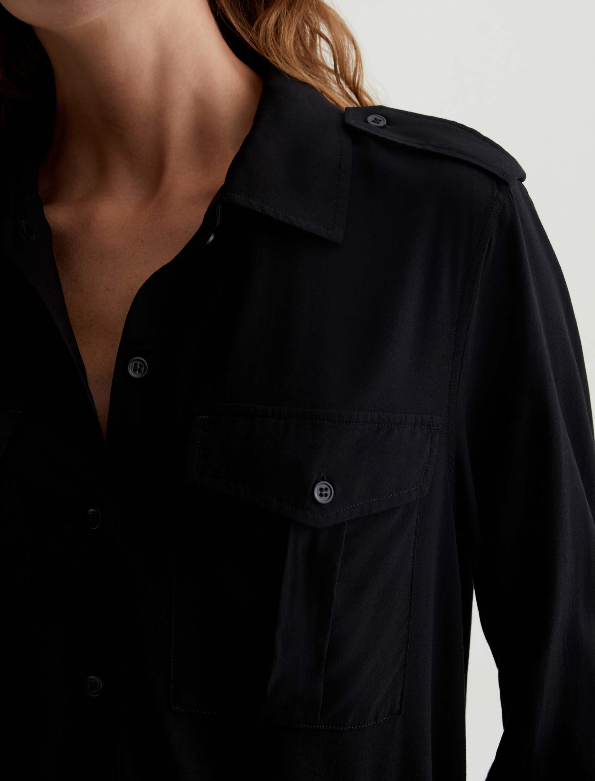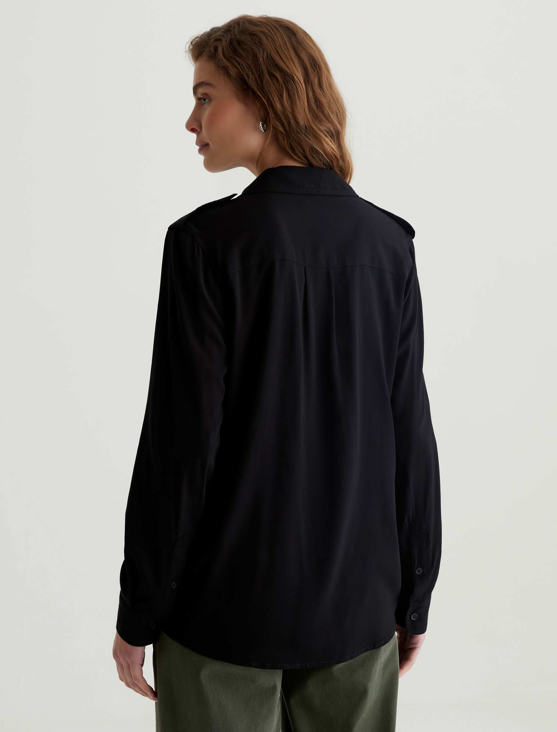 The utility-inspired Cybil Shirt features pleated flap pockets and epaulets on the shoulders. Soft and drapey with a bit of stretch, this black button-up wears effortless in a relaxed fit.