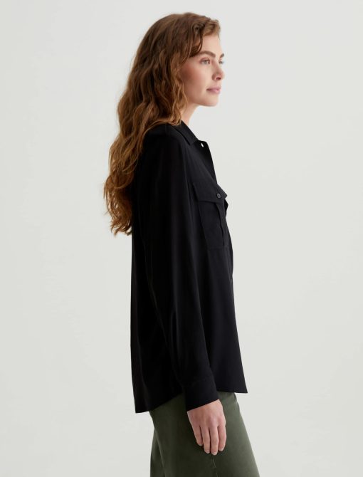 The utility-inspired Cybil Shirt features pleated flap pockets and epaulets on the shoulders. Soft and drapey with a bit of stretch, this black button-up wears effortless in a relaxed fit.