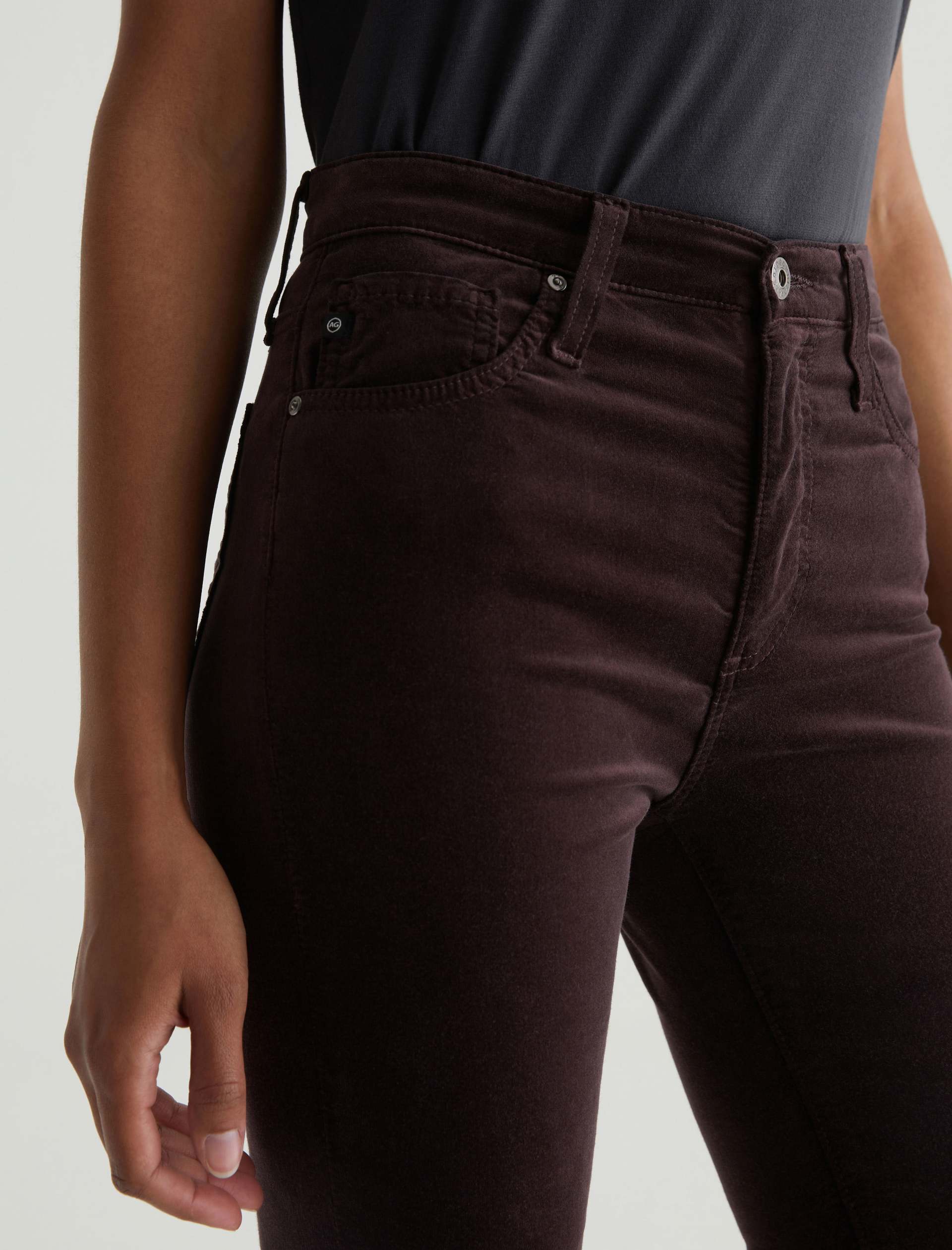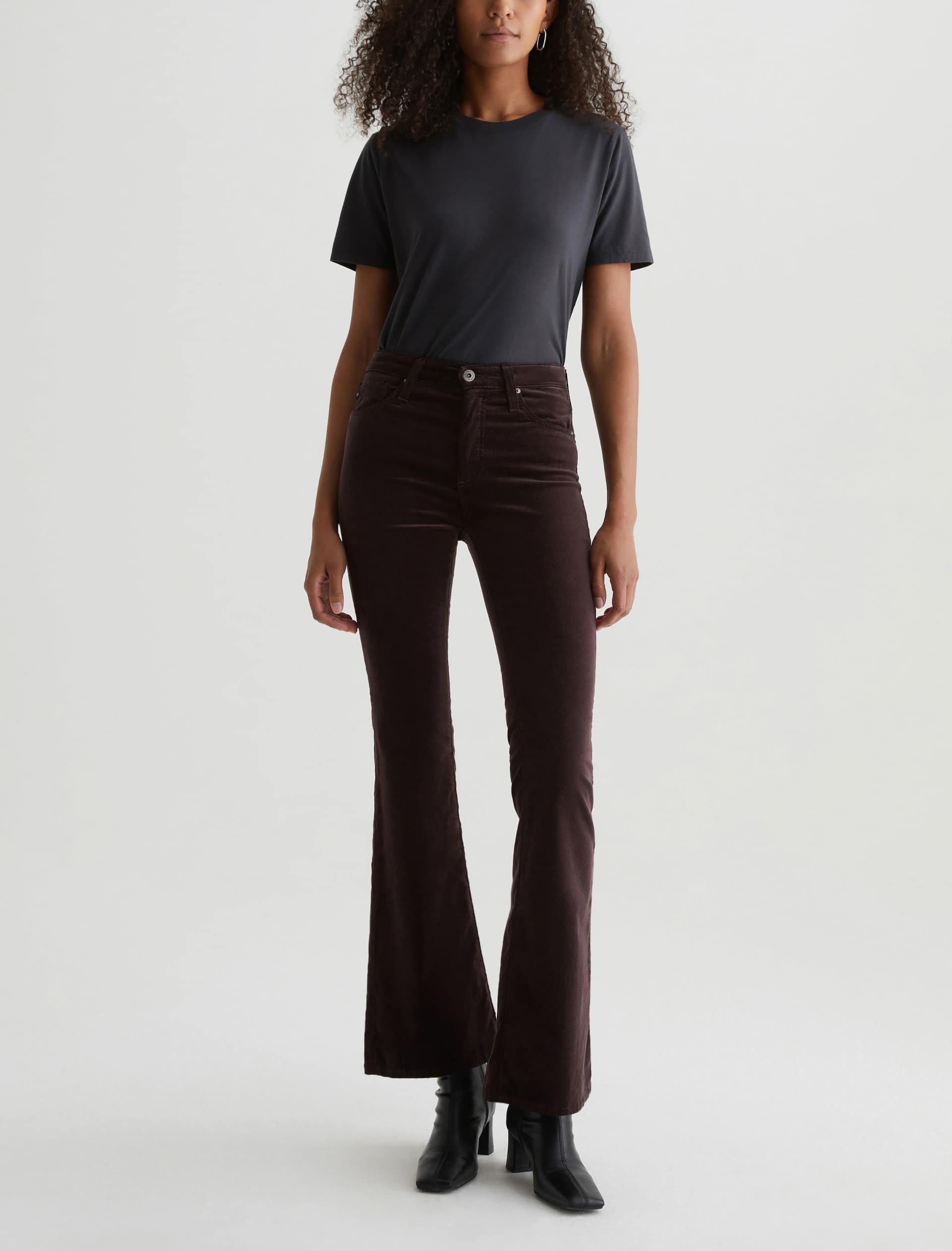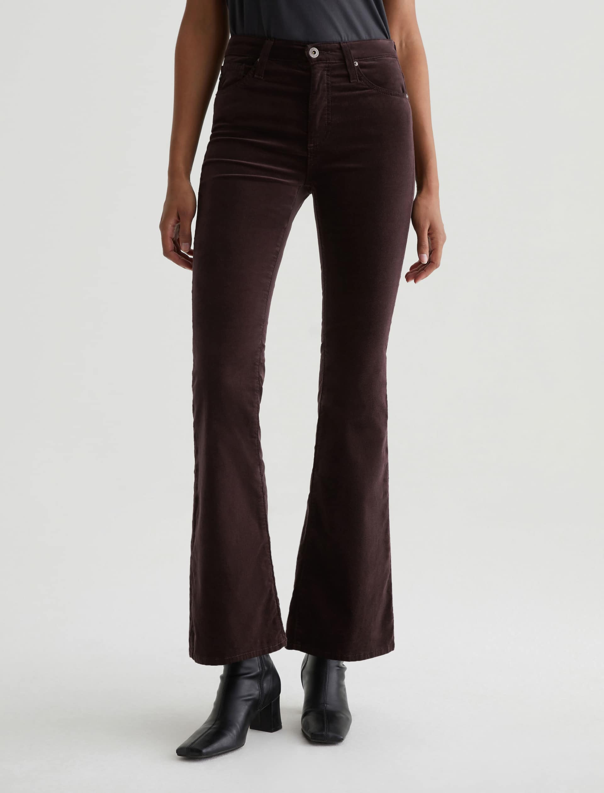 The Farrah Boot is a mid-rise bootcut silhouette crafted from 7.5 oz. Opulent Stretch Velvet in burgundy. The pair sits right at the natural waist and has a skinny fit through the leg before opening into a subtly flared hem.Some styles previously labeled as ‘High-Rise’ have been reclassified as ‘Mid-Rise.’ The fit and