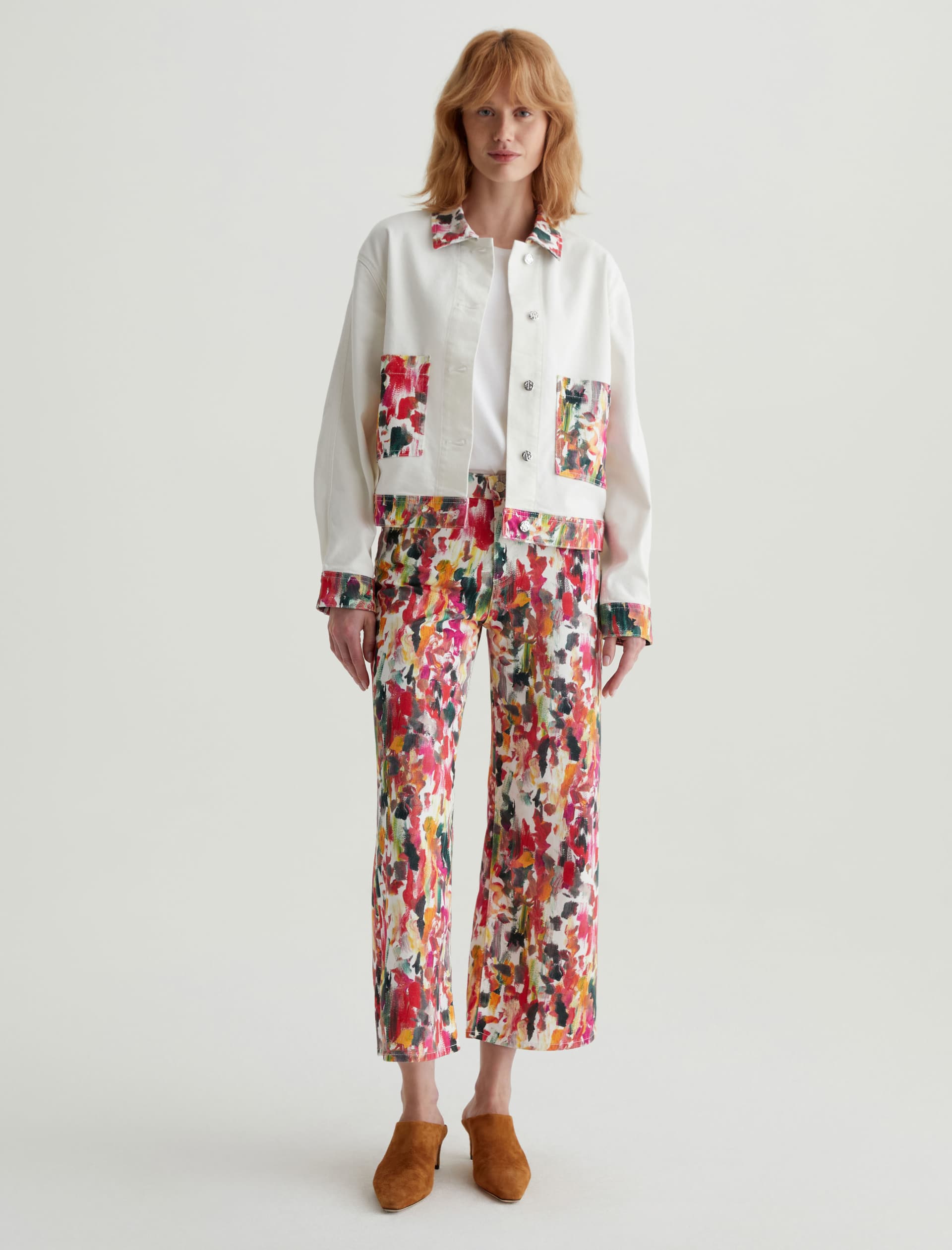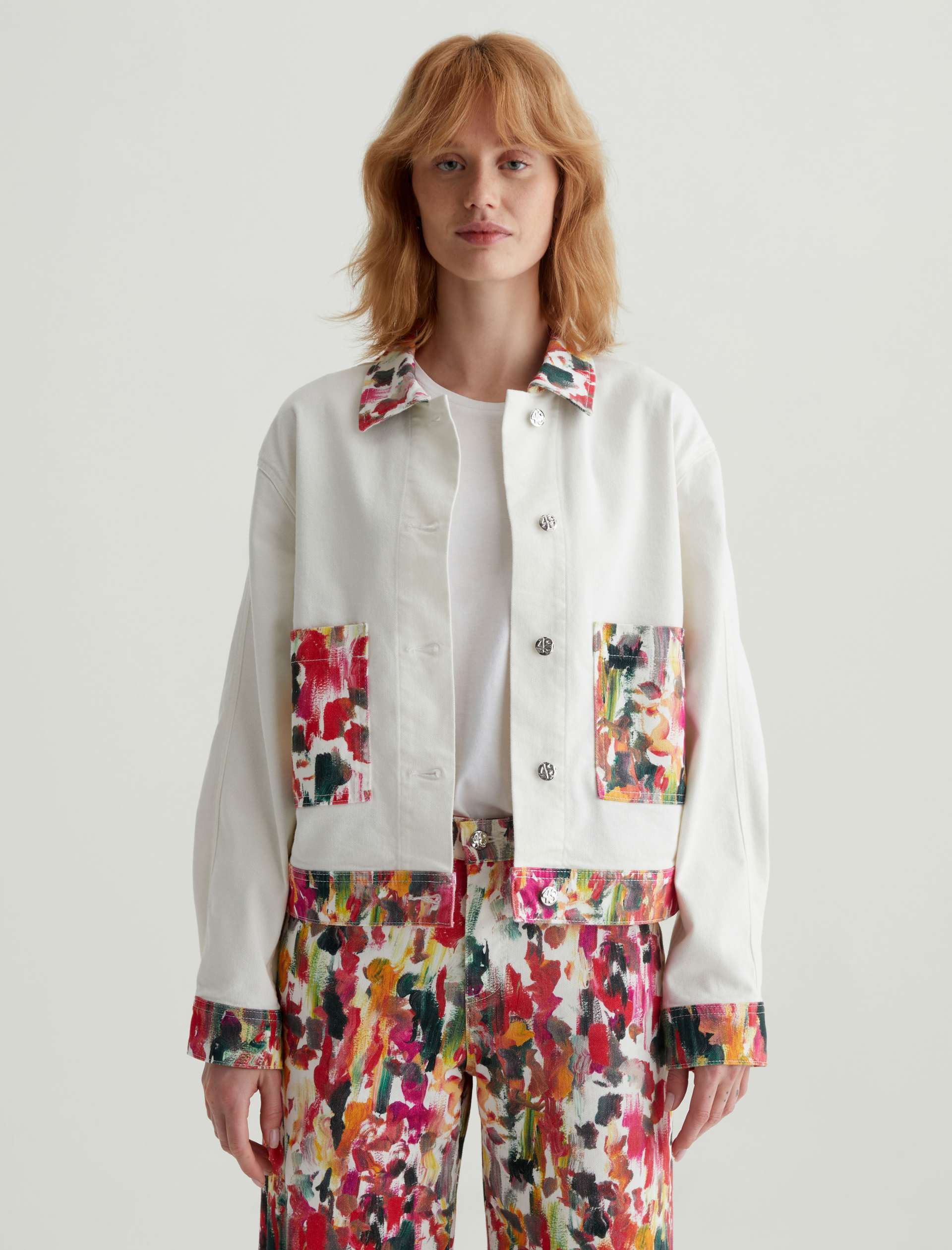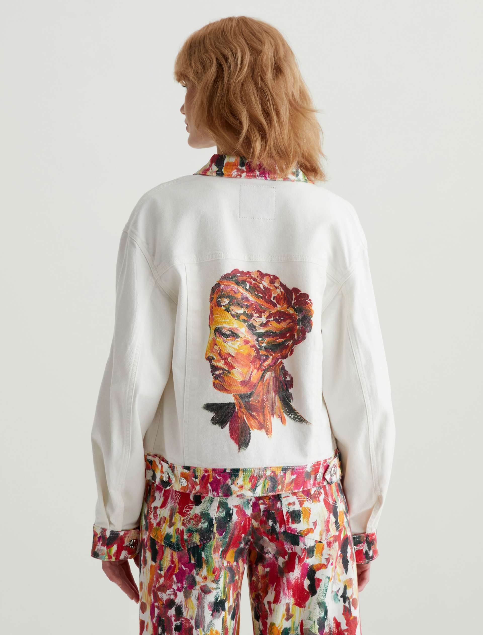 A painterly portrait and printed accents update the Genni Jacket. This cropped utility style features barrel-shaped sleeves and oversized patch pockets that have top and side entry. Pleat detailing adds volume, while adjustable tabs draw in the waist and cuffs. It’s designed in 8.7 oz. Hyper Soft Bull Denim from Italy,