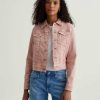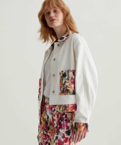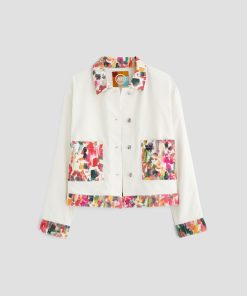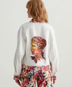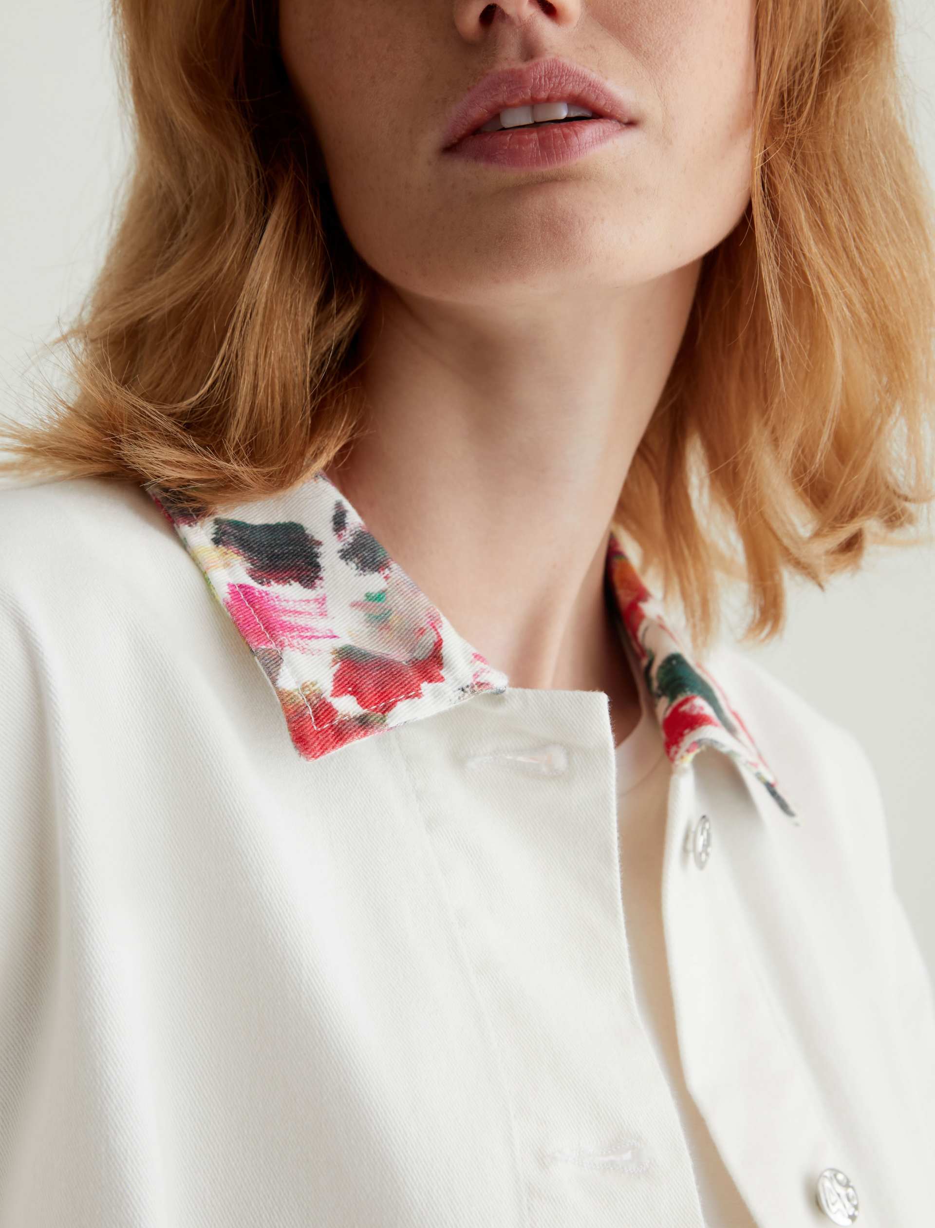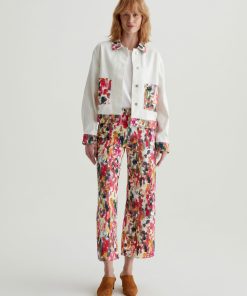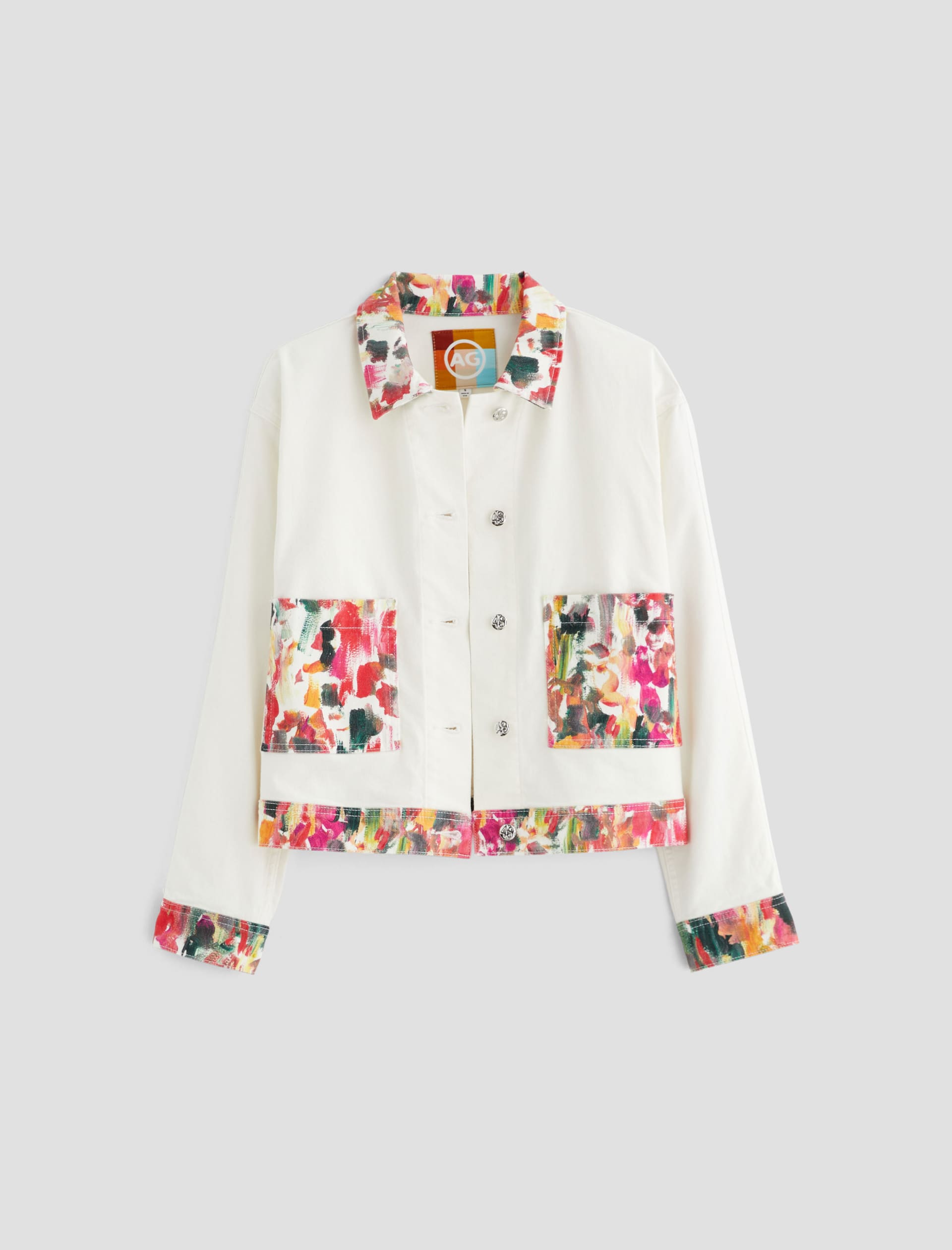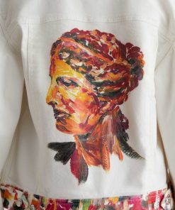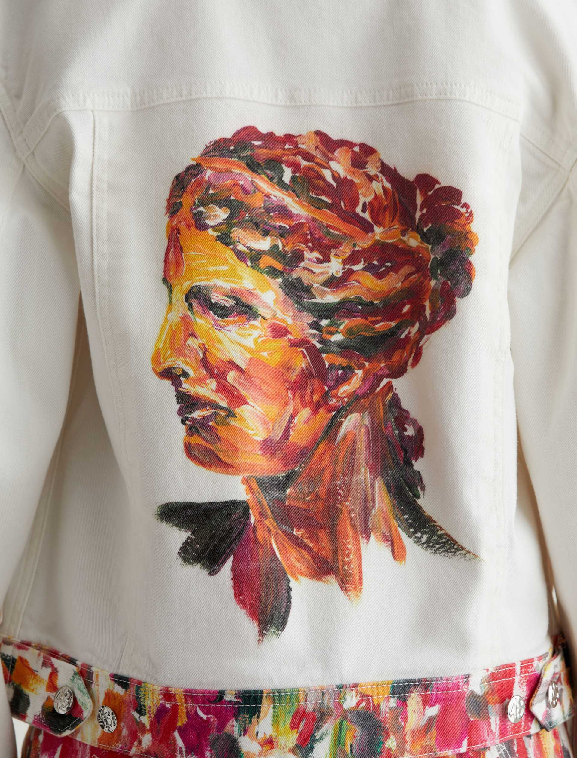 A painterly portrait and printed accents update the Genni Jacket. This cropped utility style features barrel-shaped sleeves and oversized patch pockets that have top and side entry. Pleat detailing adds volume, while adjustable tabs draw in the waist and cuffs. It’s designed in 8.7 oz. Hyper Soft Bull Denim from Italy,