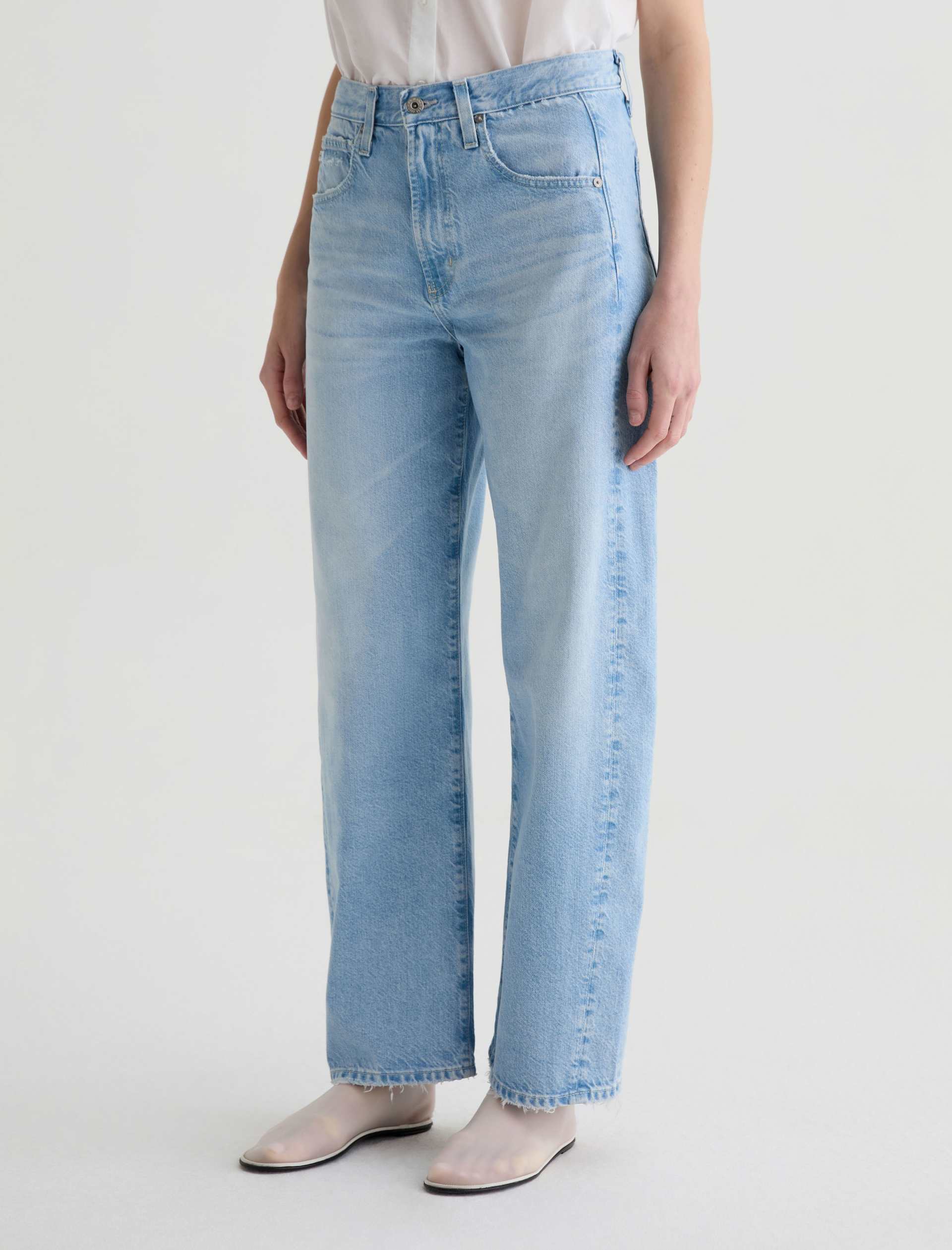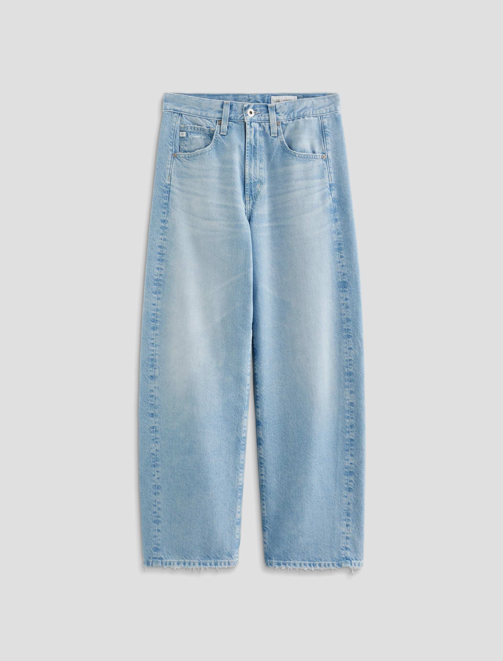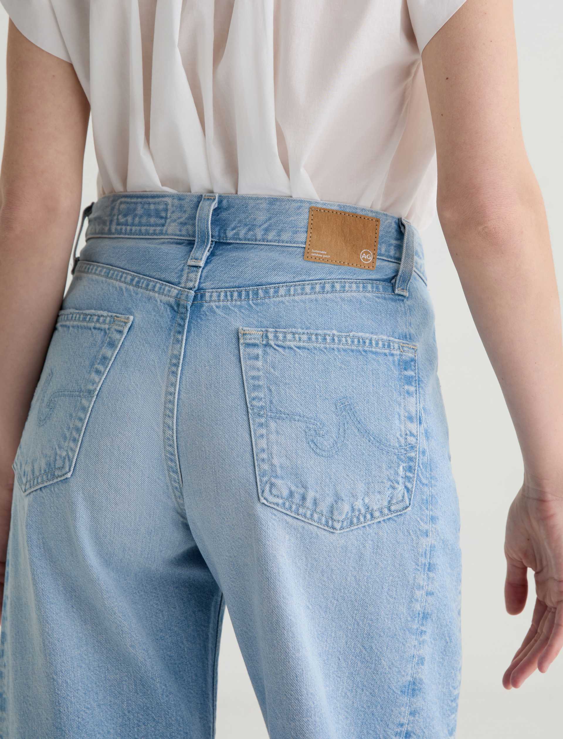 The Hattie is a high-rise barrel jean with a 28” inseam and ankle-grazing frayed hems. Made from 12 oz. Drapey Ridged Denim in a light wash, this style offers a structured look with a comfortable stretch feel.