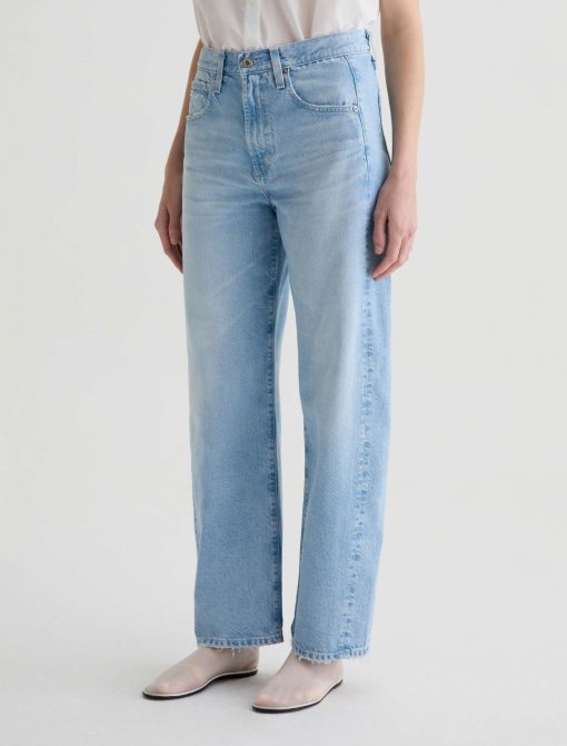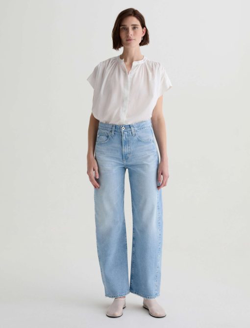 The Hattie is a high-rise barrel jean with a 28” inseam and ankle-grazing frayed hems. Made from 12 oz. Drapey Ridged Denim in a light wash, this style offers a structured look with a comfortable stretch feel.