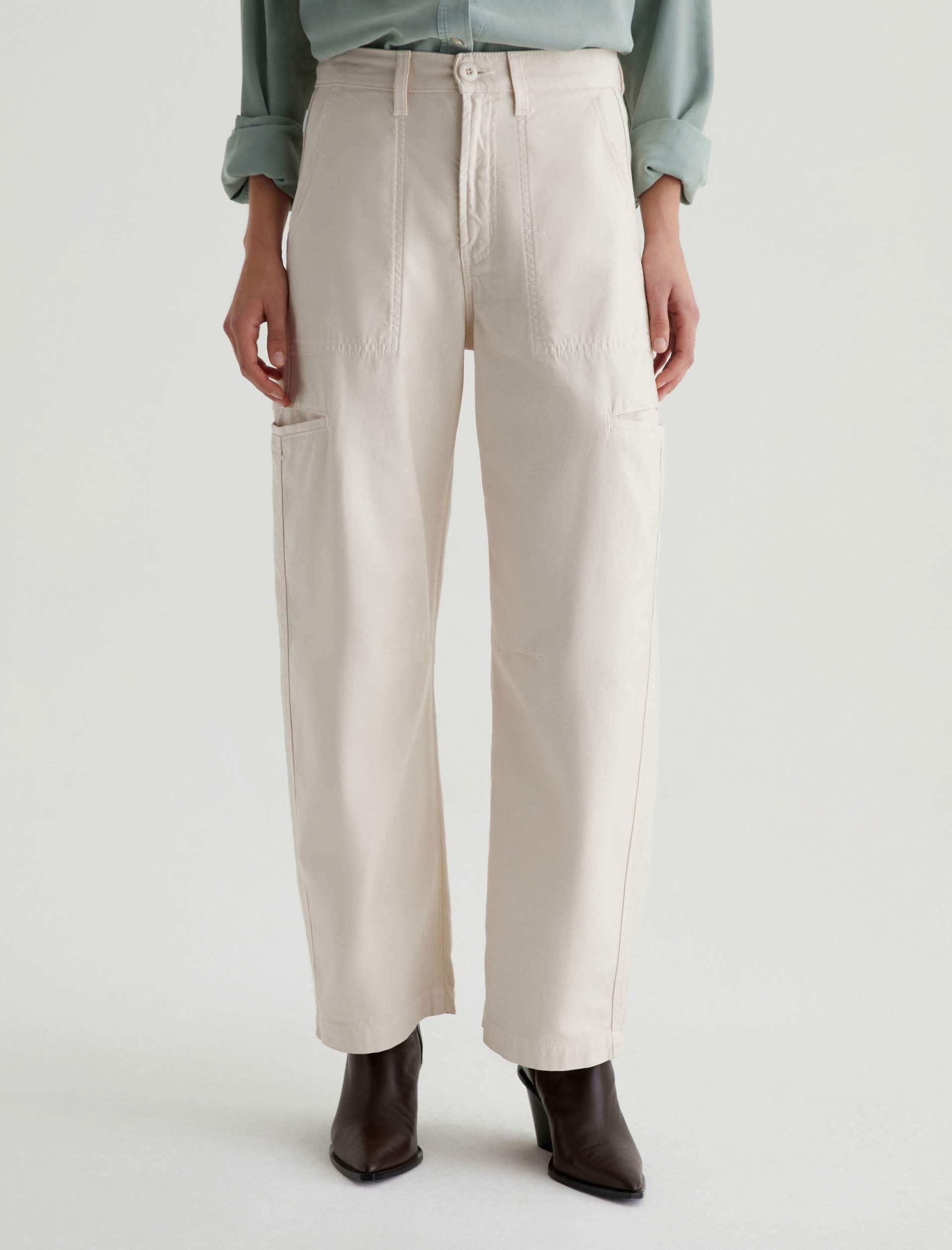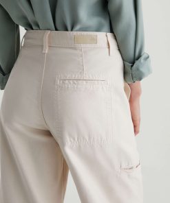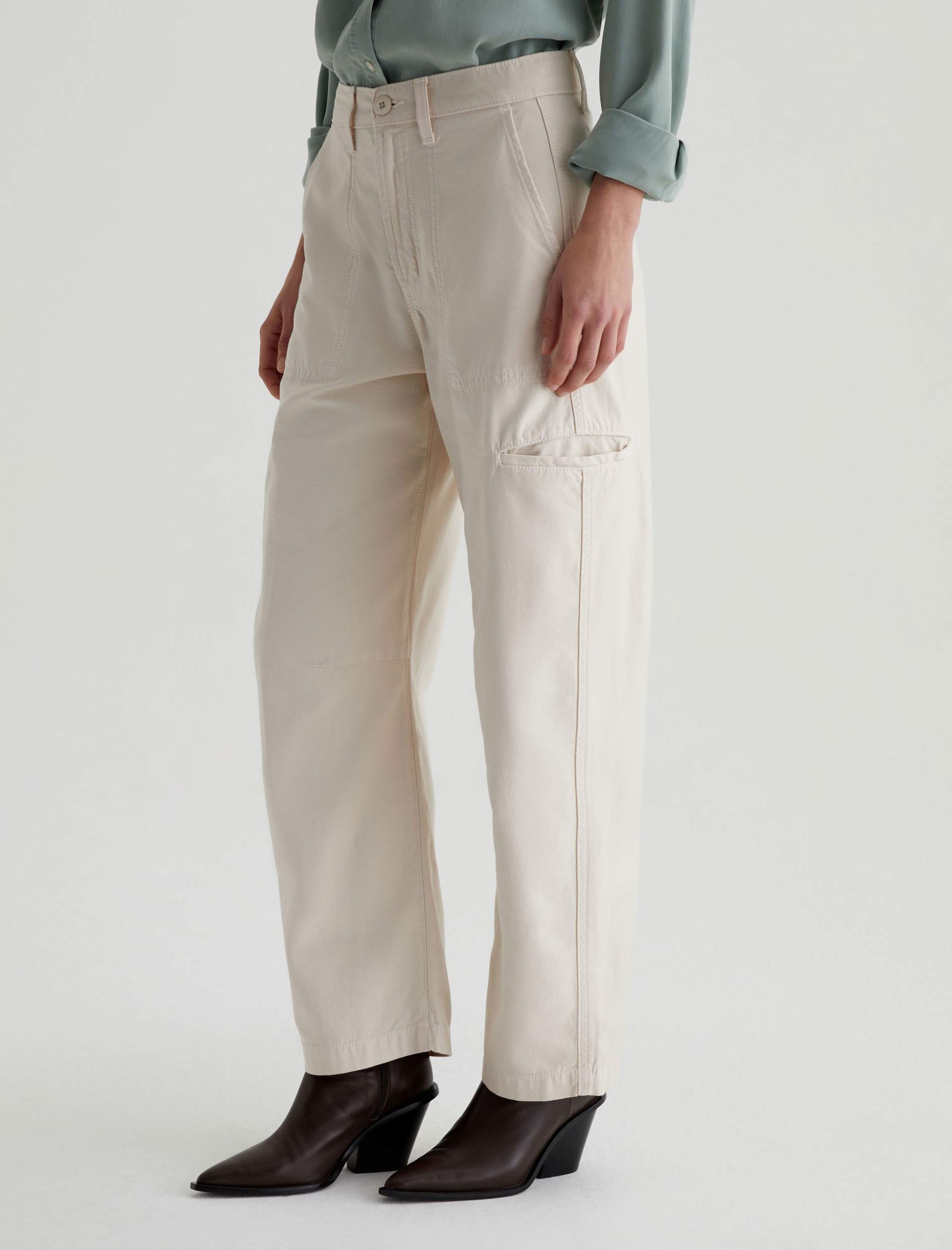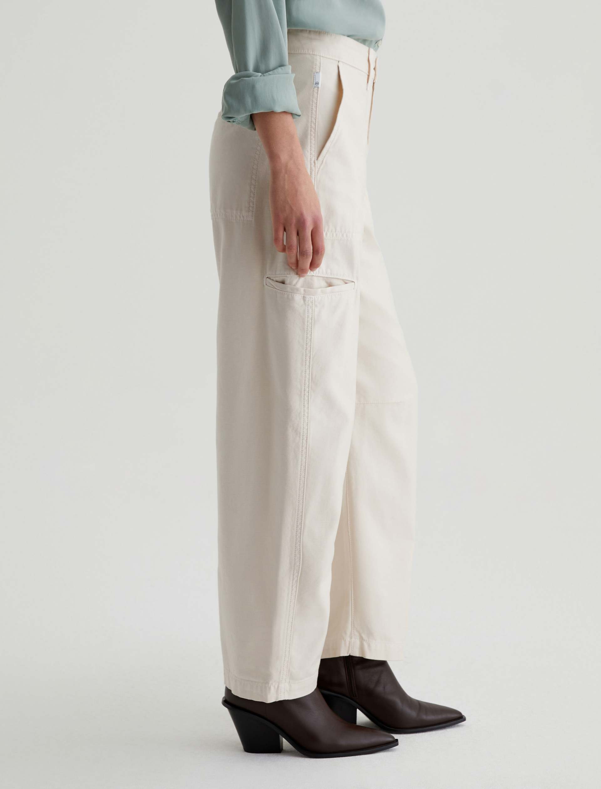 Hazal is a relaxed barrel silhouette with a high waist and utility-inspired details. Slightly curved outer seams and darting at the inner knees create a sculptural shape in off-white reverse sateen. Landing at a slightly cropped length, these high-rise barrel pants feature handy welt pockets at the sides and a single b