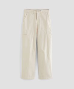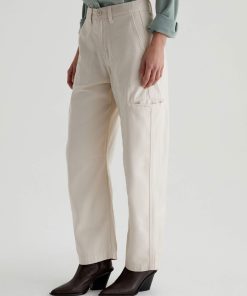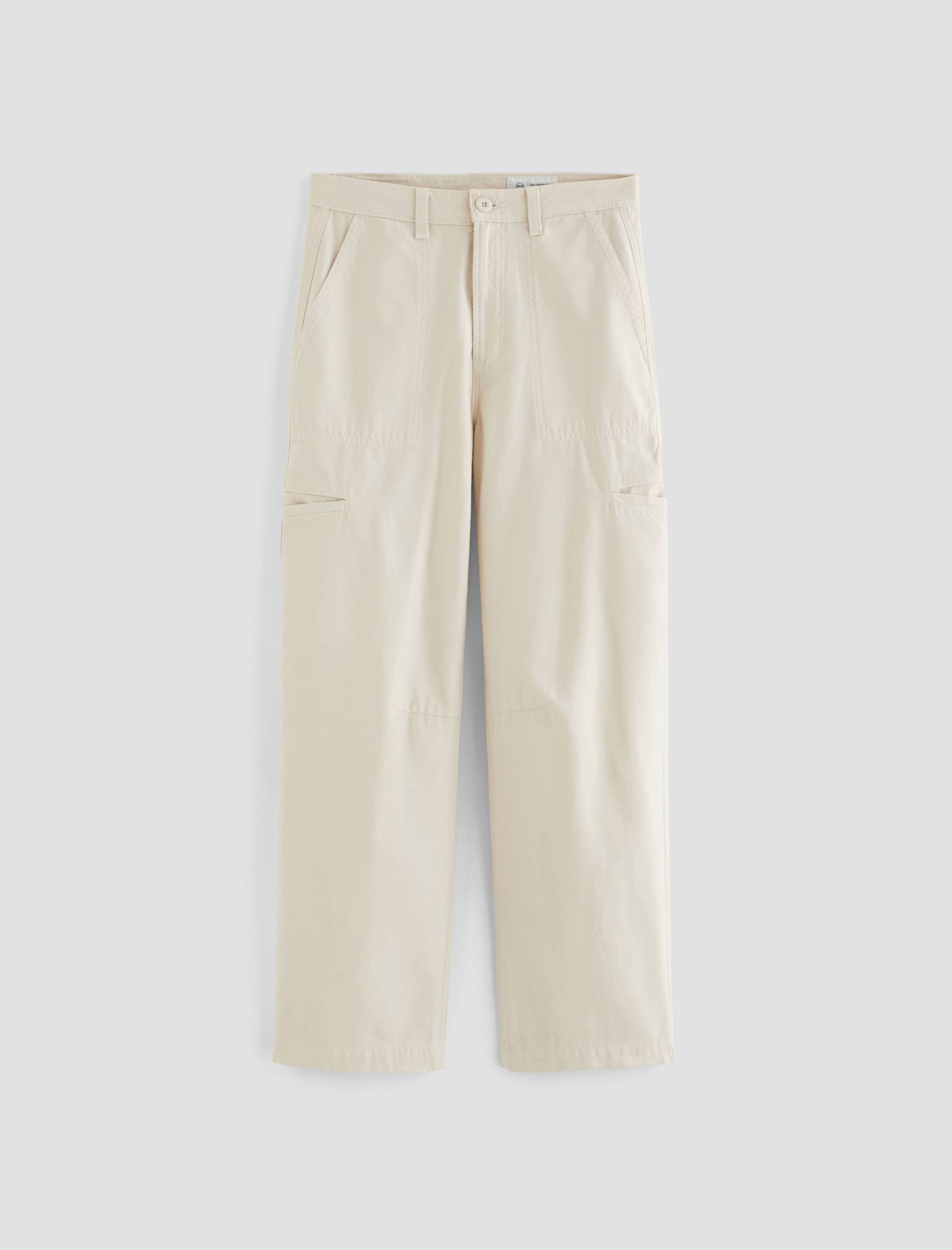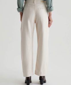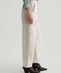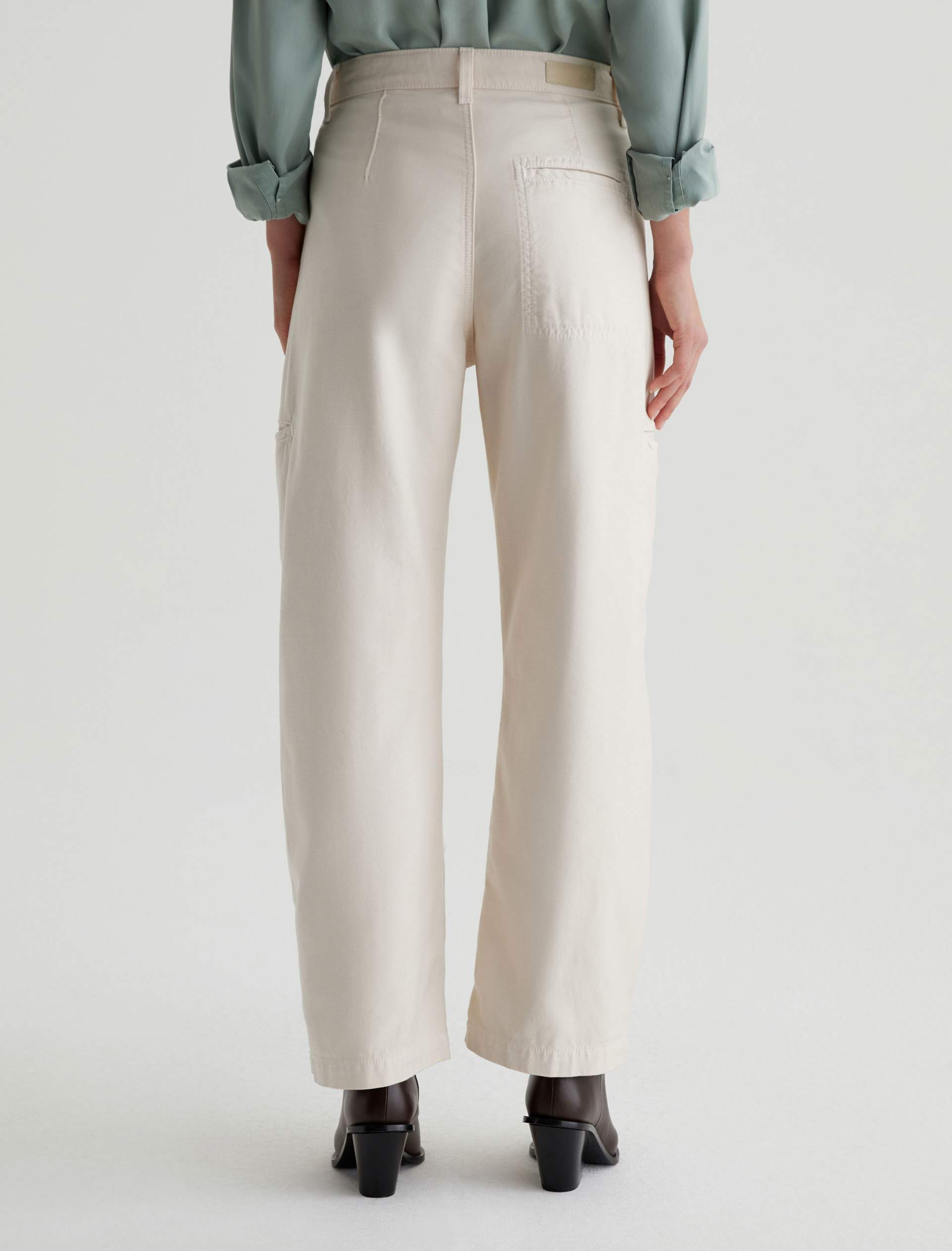 Hazal is a relaxed barrel silhouette with a high waist and utility-inspired details. Slightly curved outer seams and darting at the inner knees create a sculptural shape in off-white reverse sateen. Landing at a slightly cropped length, these high-rise barrel pants feature handy welt pockets at the sides and a single b