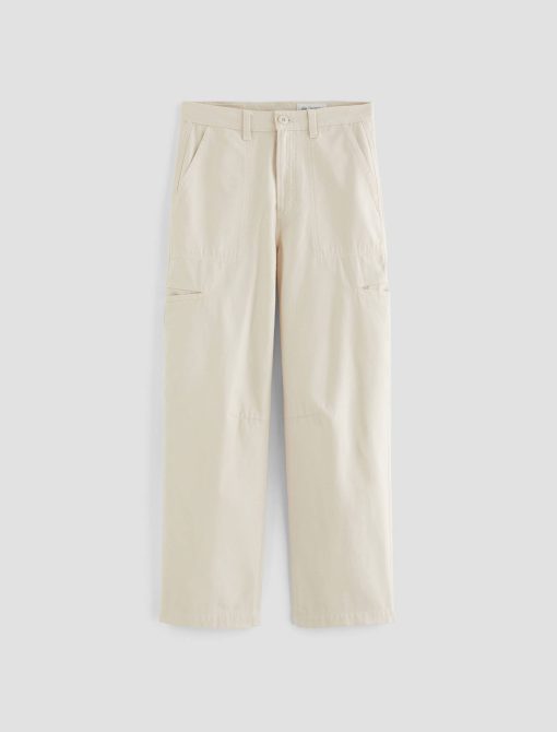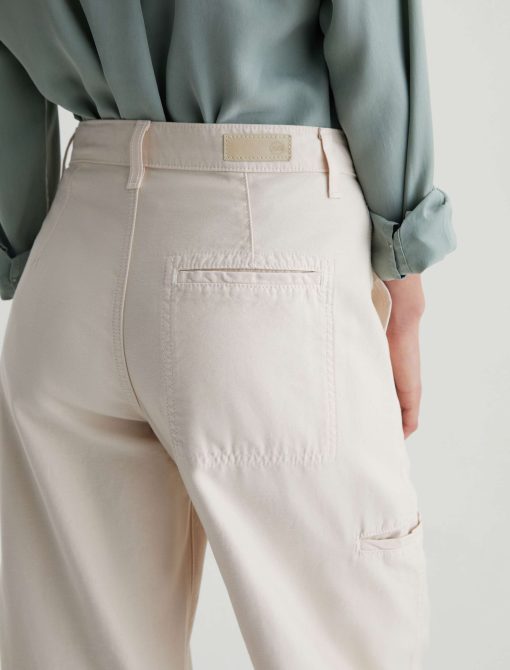 Hazal is a relaxed barrel silhouette with a high waist and utility-inspired details. Slightly curved outer seams and darting at the inner knees create a sculptural shape in off-white reverse sateen. Landing at a slightly cropped length, these high-rise barrel pants feature handy welt pockets at the sides and a single b