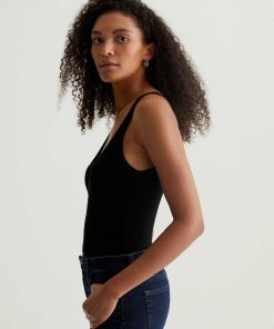 The Jaxon Tank for women features a fitted silhouette with a scoop neckline and slim straps in a racer-inspired shape. A true wardrobe staple in classic black, this women’s tank top has self-binding details for a clean, timeless aesthetic that’s versatile and easy to layer. It’s designed an eco-friendly 2×1 lyocell rib