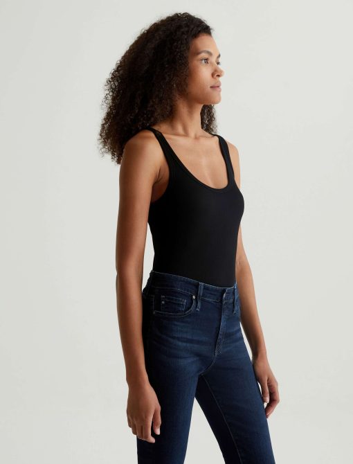 The Jaxon Tank for women features a fitted silhouette with a scoop neckline and slim straps in a racer-inspired shape. A true wardrobe staple in classic black, this women’s tank top has self-binding details for a clean, timeless aesthetic that’s versatile and easy to layer. It’s designed an eco-friendly 2×1 lyocell rib
