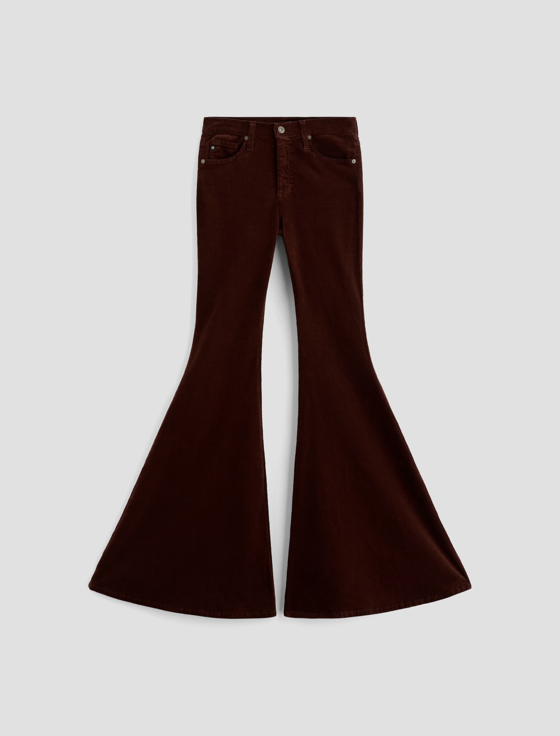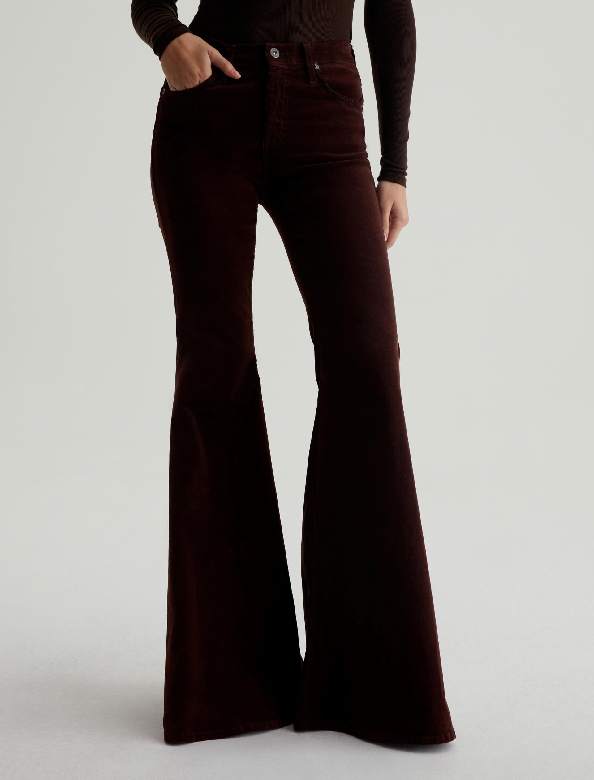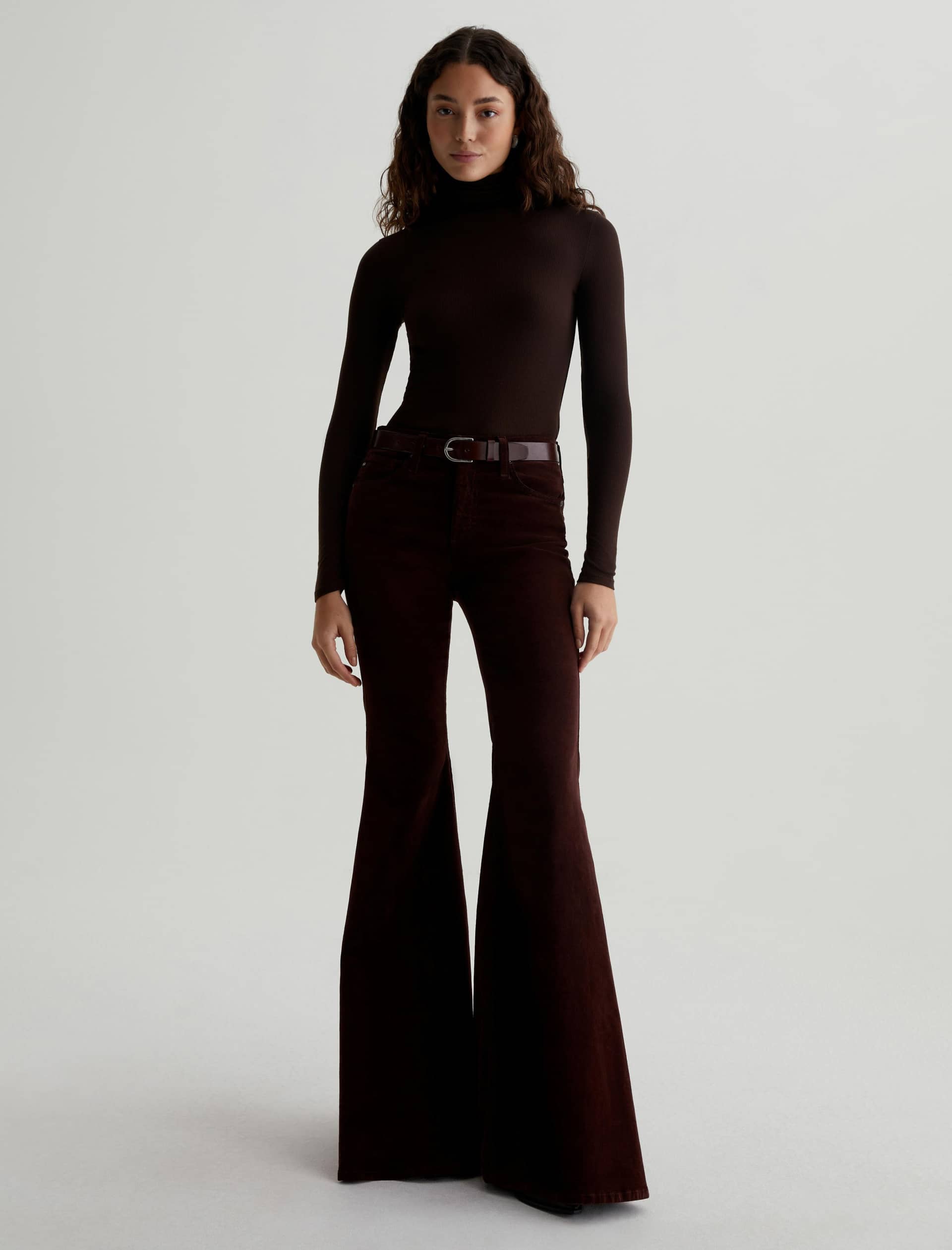 Designed for high drama, Joni is our new mid-rise super flare. It’s fitted through the hip and thigh before kicking out from the knee, falling to an ultra-wide hem. This pair has a velvety feel and lustrous sheen in rich brown mini corduroy with shape-hugging stretch. The inseam clocks in at a 36 inches for a dropped-t