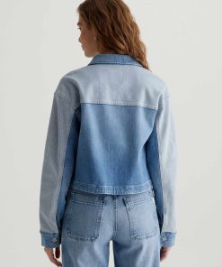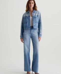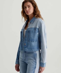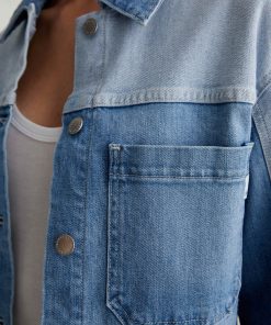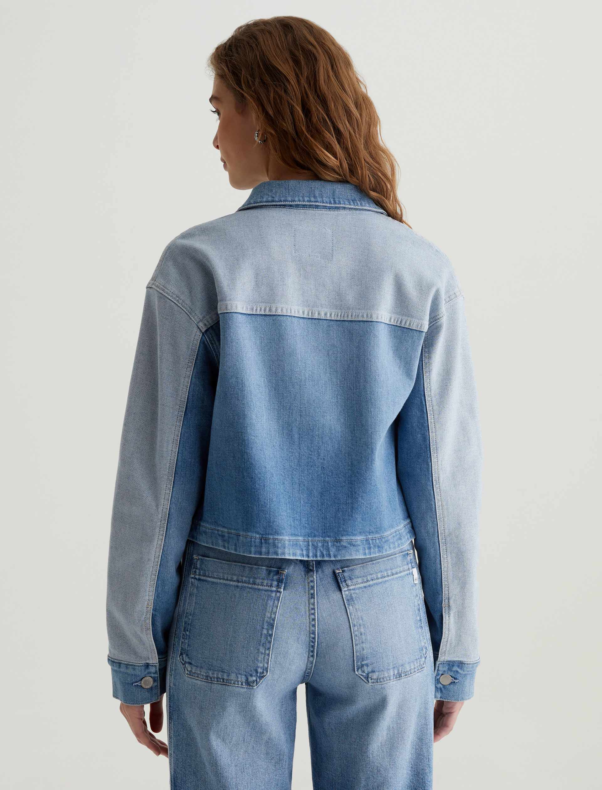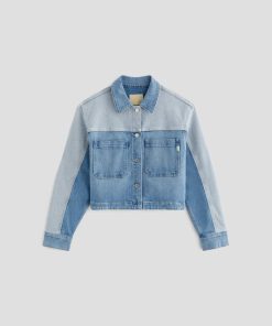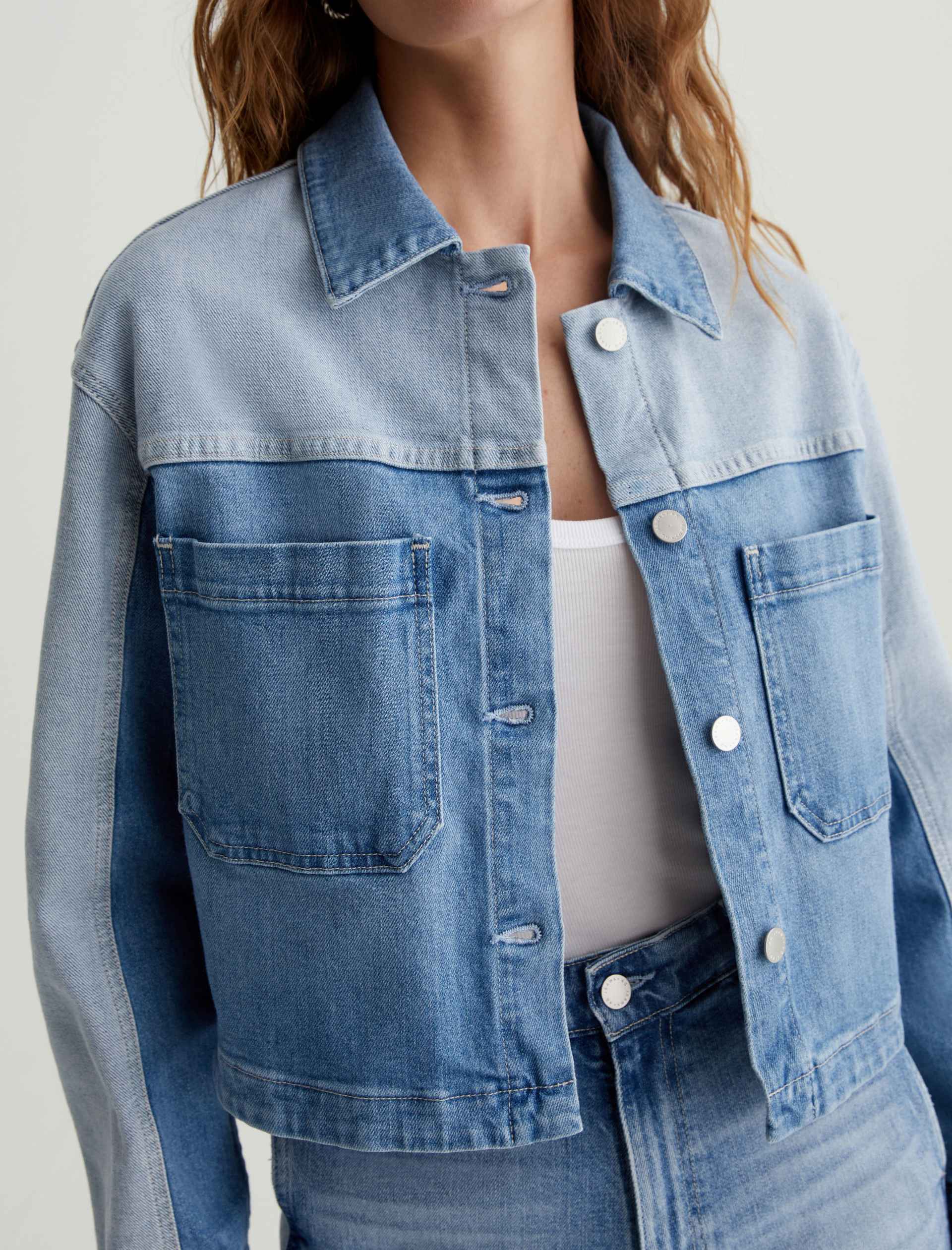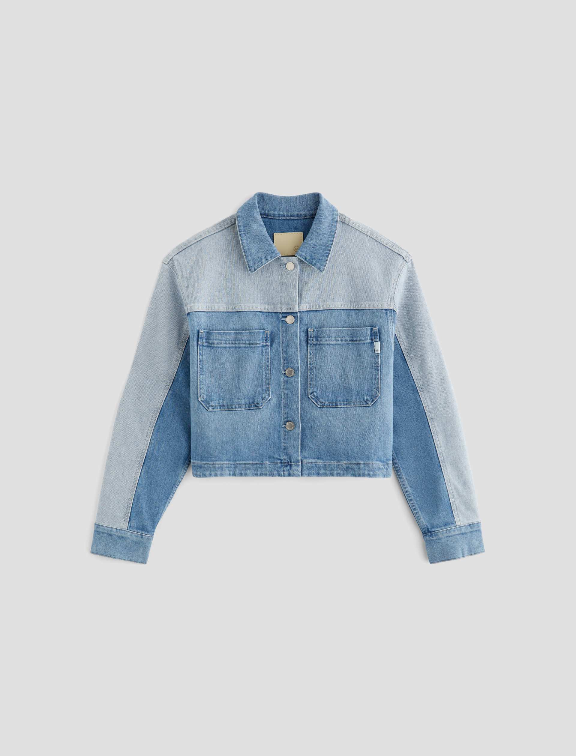 The Juliana shirt jacket has a cropped, boxy shape in Italian stretch denim. It’s done in a light indigo shade and features reverse-side paneling for colorblocked contrast. Topped by a pointed collar, the style finishes with a button placket and workwear-inspired patch pockets at the front.
