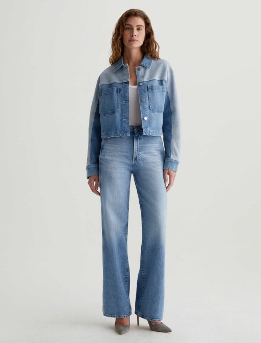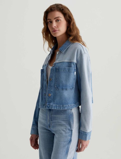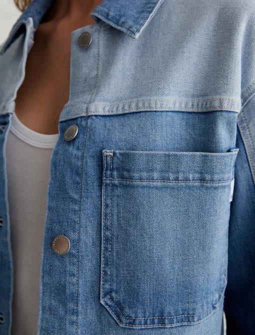 The Juliana shirt jacket has a cropped, boxy shape in Italian stretch denim. It’s done in a light indigo shade and features reverse-side paneling for colorblocked contrast. Topped by a pointed collar, the style finishes with a button placket and workwear-inspired patch pockets at the front.