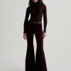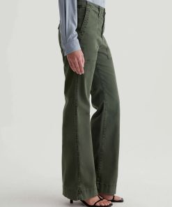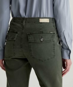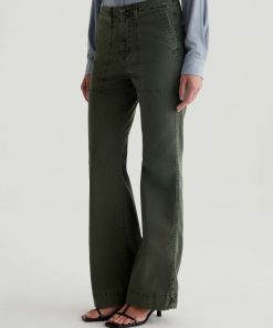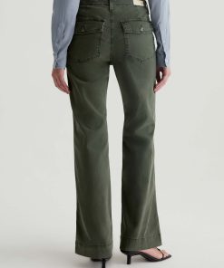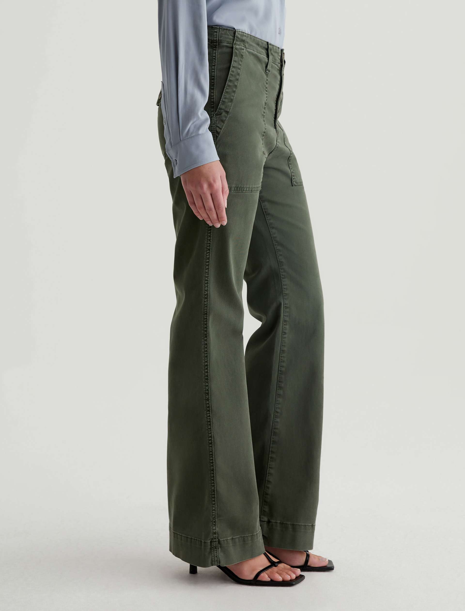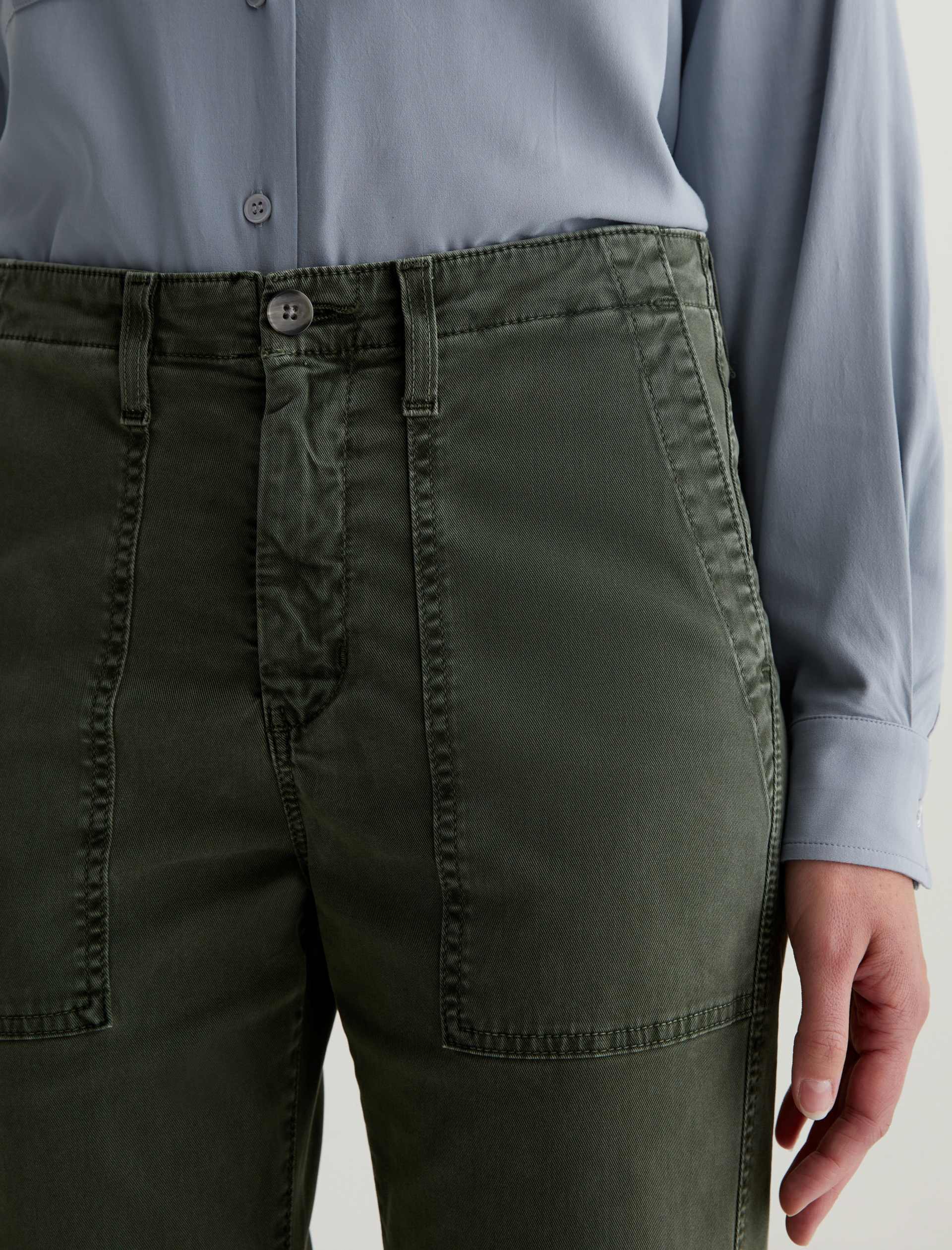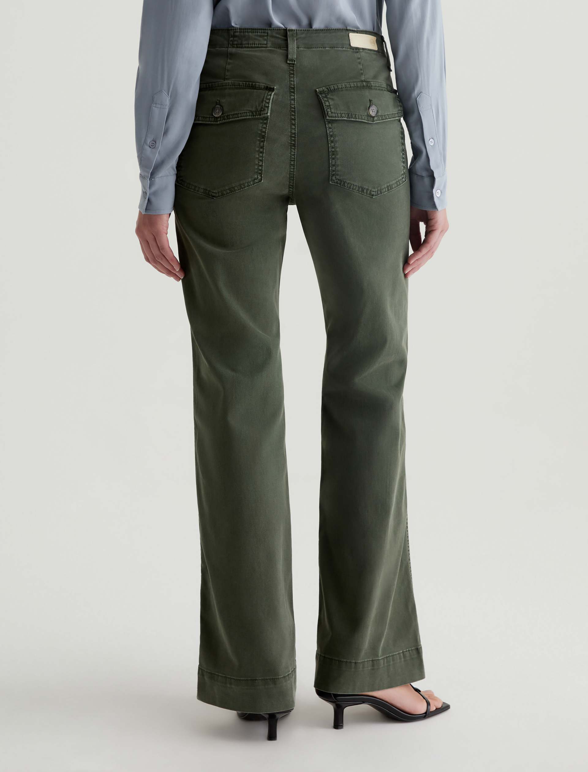 Juliet is a high-rise flare with utility-inspired pockets. Sulfur-dyed for a dark green shade, these flared pants have a soft, refined feel in 7.9 oz. Sorrento Stretch Twill from Italy.