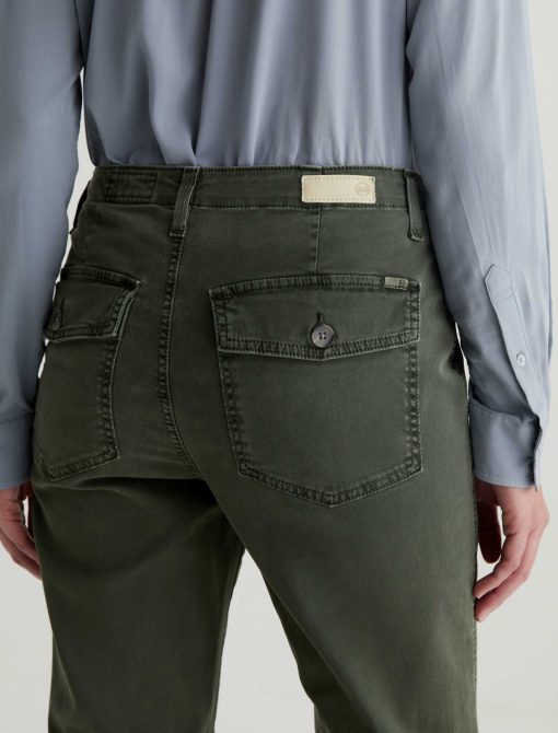 Juliet is a high-rise flare with utility-inspired pockets. Sulfur-dyed for a dark green shade, these flared pants have a soft, refined feel in 7.9 oz. Sorrento Stretch Twill from Italy.